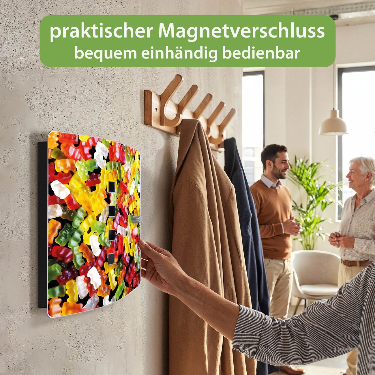 Funktion / Nutzen: Die leicht geschwungene Edelstahltür ist mit einer hochwertigen Motivfolie und dem Motiv Motiv Gummibaerchen kaschiert. Ein praktischer Magnetverschluss ermöglicht Ihnen ein schnelles Öffnen und Schließen. Befestigt wird der Schlüsselkasten an 2 Stellen auf der Rückseite, passendes Montagematerial fügen wir bereits bei.