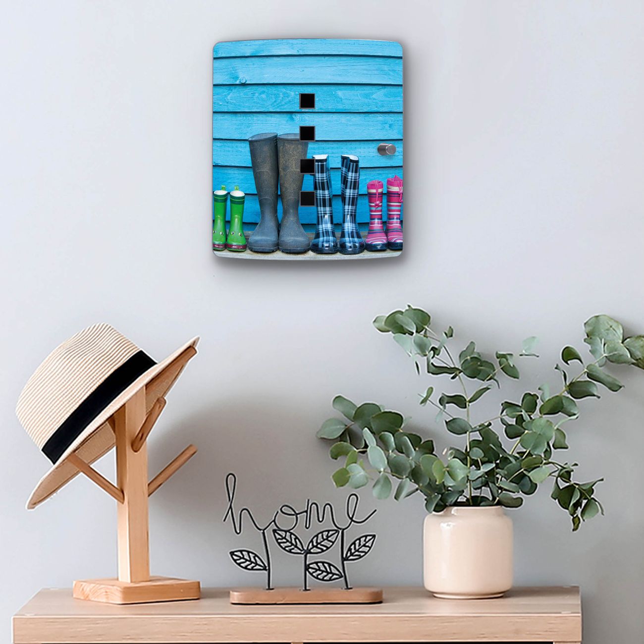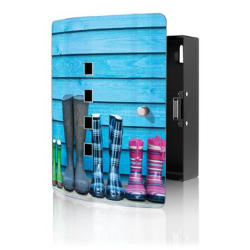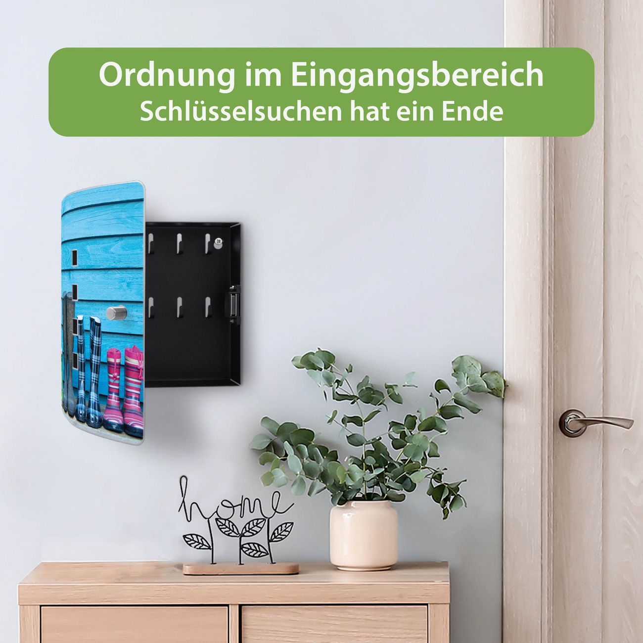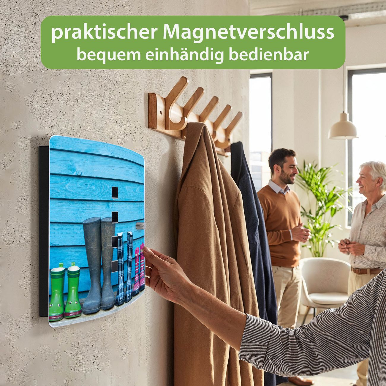 Funktion / Nutzen: Die leicht geschwungene Edelstahltür ist mit einer hochwertigen Motivfolie und dem Motiv Motiv Gummistiefel kaschiert. Ein praktischer Magnetverschluss ermöglicht Ihnen ein schnelles Öffnen und Schließen. Befestigt wird der Schlüsselkasten an 2 Stellen auf der Rückseite, passendes Montagematerial fügen wir bereits bei.