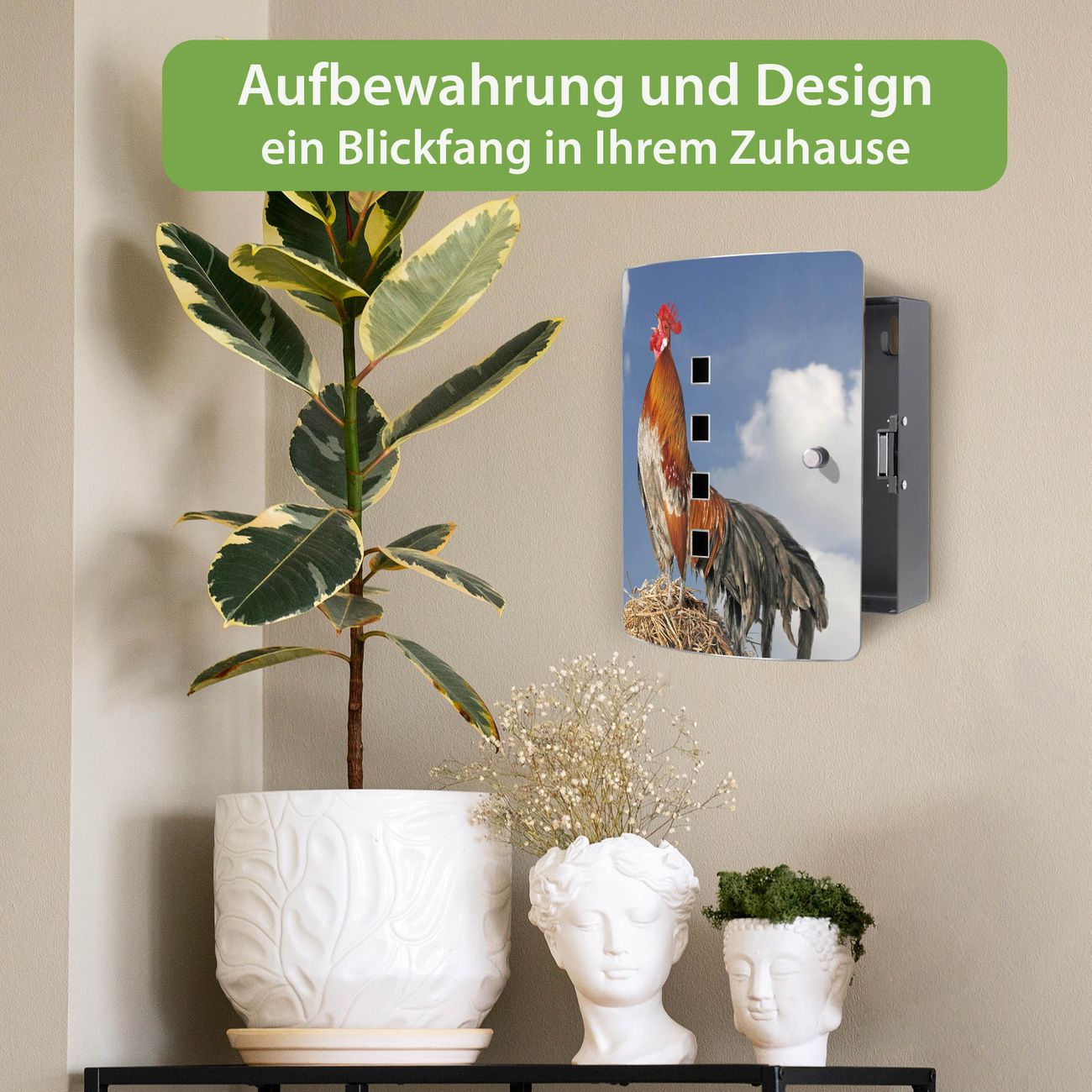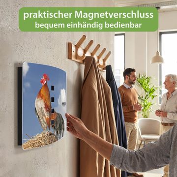 Funktion / Nutzen: Die leicht geschwungene Edelstahltür ist mit einer hochwertigen Motivfolie und dem Motiv Motiv Hahn kaschiert. Ein praktischer Magnetverschluss ermöglicht Ihnen ein schnelles Öffnen und Schließen. Befestigt wird der Schlüsselkasten an 2 Stellen auf der Rückseite, passendes Montagematerial fügen wir bereits bei.