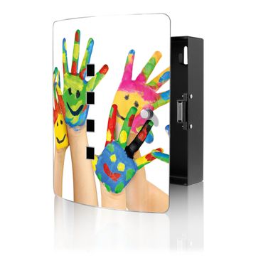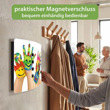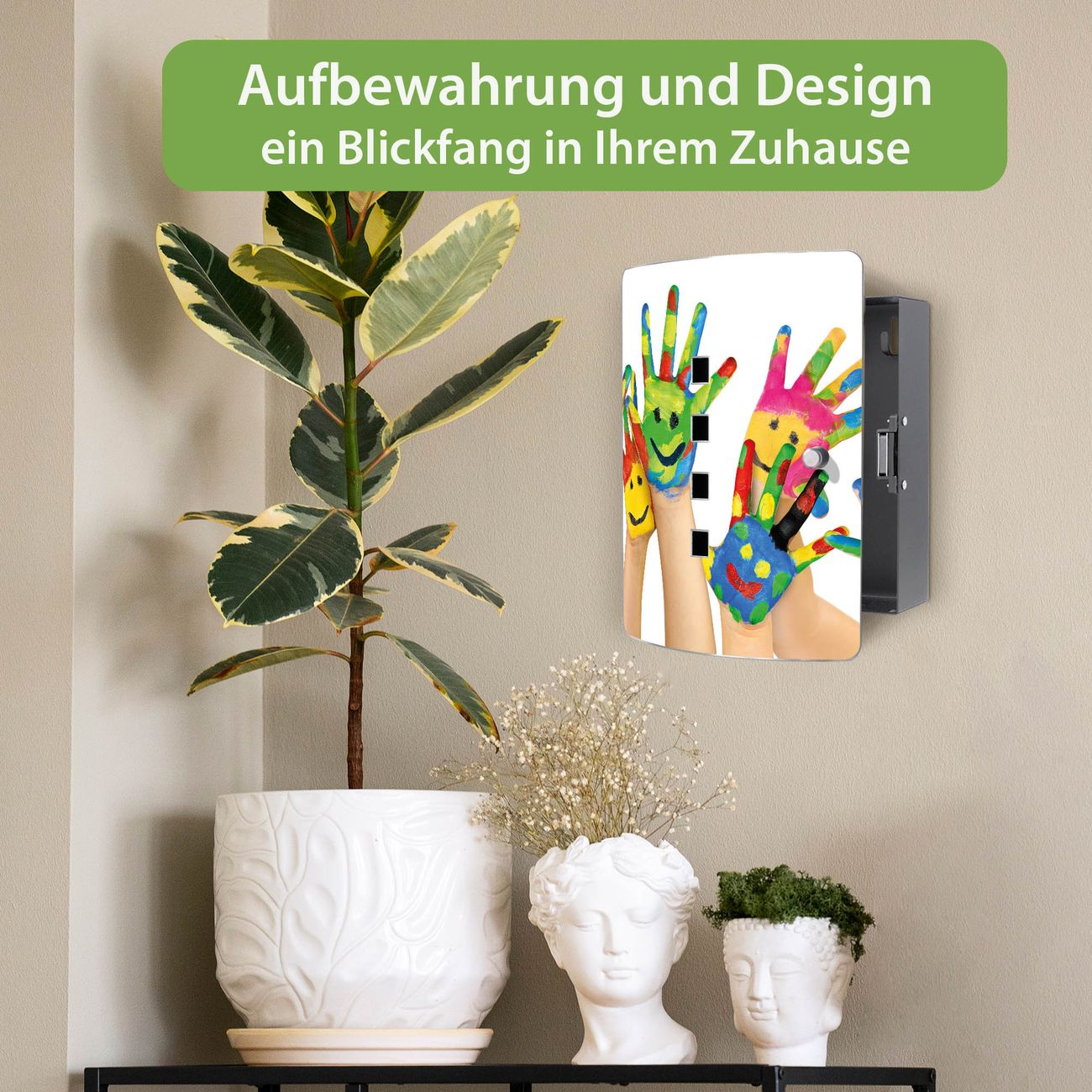 Funktion / Nutzen: Die leicht geschwungene Edelstahltür ist mit einer hochwertigen Motivfolie und dem Motiv Motiv Happy Hands kaschiert. Ein praktischer Magnetverschluss ermöglicht Ihnen ein schnelles Öffnen und Schließen. Befestigt wird der Schlüsselkasten an 2 Stellen auf der Rückseite, passendes Montagematerial fügen wir bereits bei.