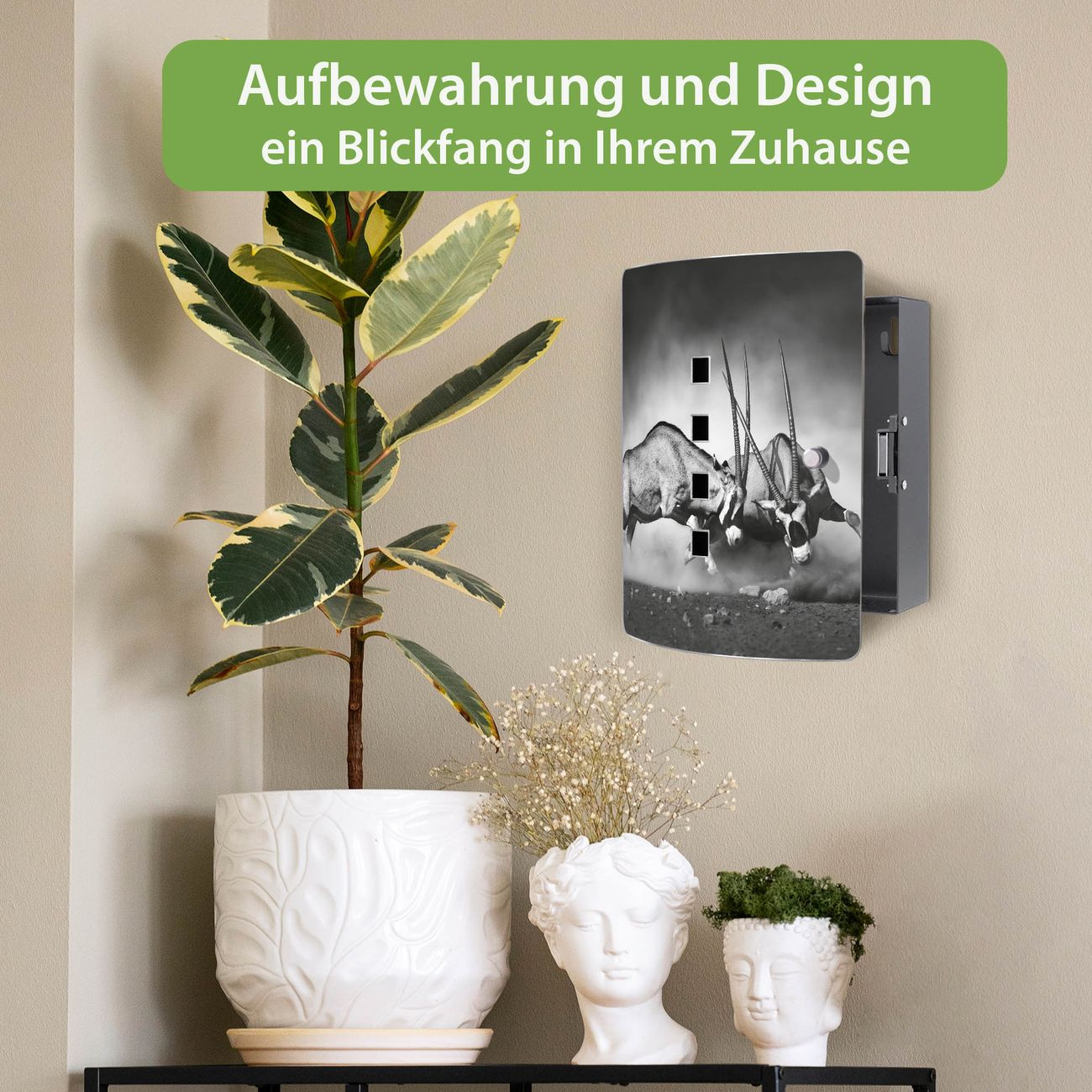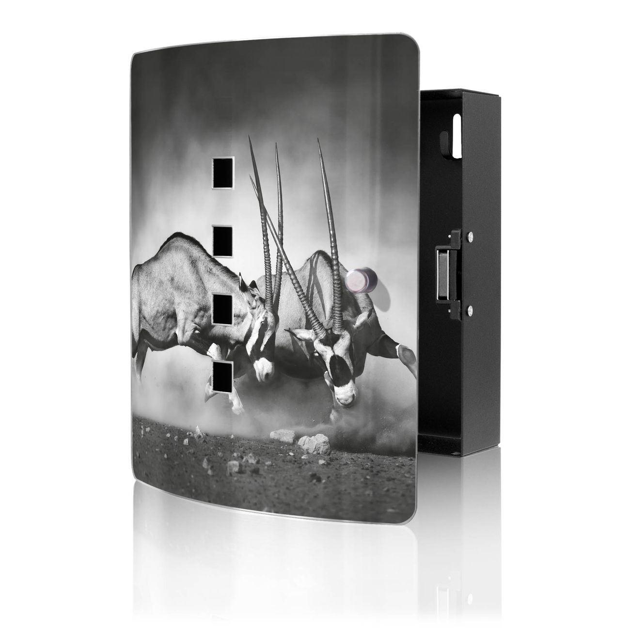 Funktion / Nutzen: Die leicht geschwungene Edelstahltür ist mit einer hochwertigen Motivfolie und dem Motiv Motiv Head Crash kaschiert. Ein praktischer Magnetverschluss ermöglicht Ihnen ein schnelles Öffnen und Schließen. Befestigt wird der Schlüsselkasten an 2 Stellen auf der Rückseite, passendes Montagematerial fügen wir bereits bei.