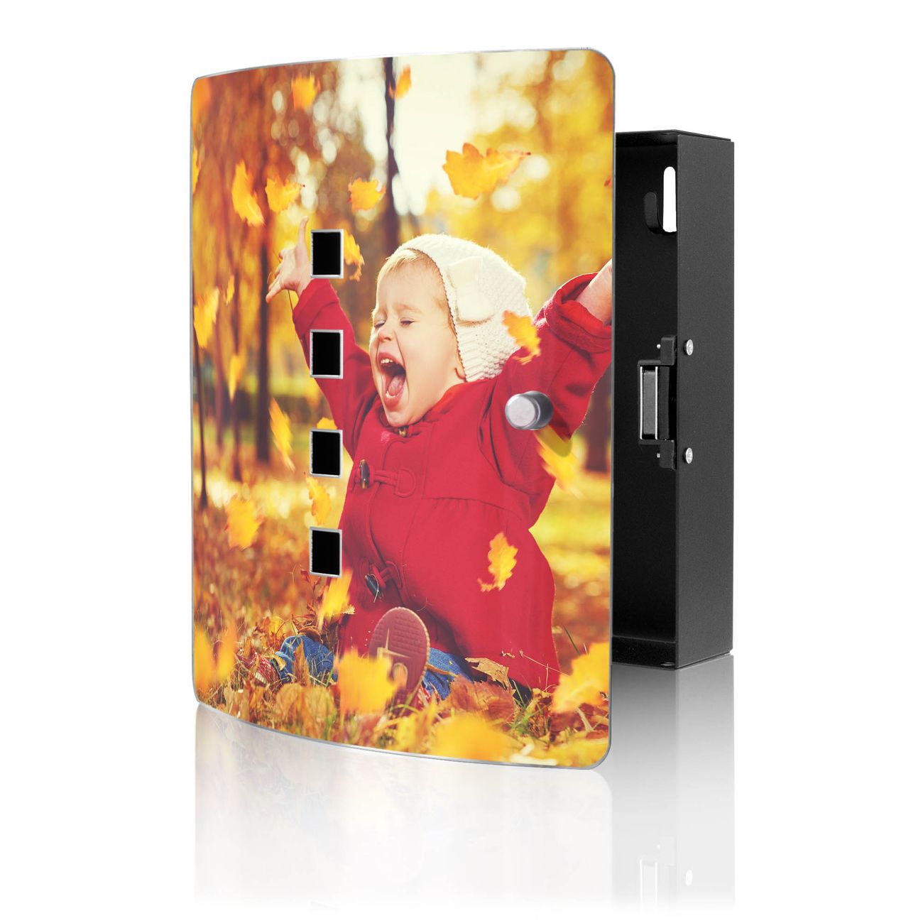 Funktion / Nutzen: Die leicht geschwungene Edelstahltür ist mit einer hochwertigen Motivfolie und dem Motiv Motiv Herbstfreude kaschiert. Ein praktischer Magnetverschluss ermöglicht Ihnen ein schnelles Öffnen und Schließen. Befestigt wird der Schlüsselkasten an 2 Stellen auf der Rückseite, passendes Montagematerial fügen wir bereits bei.