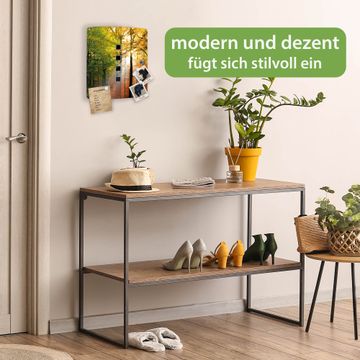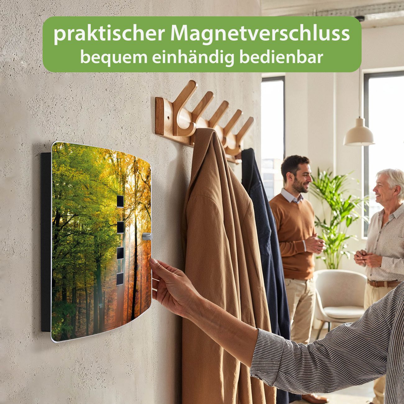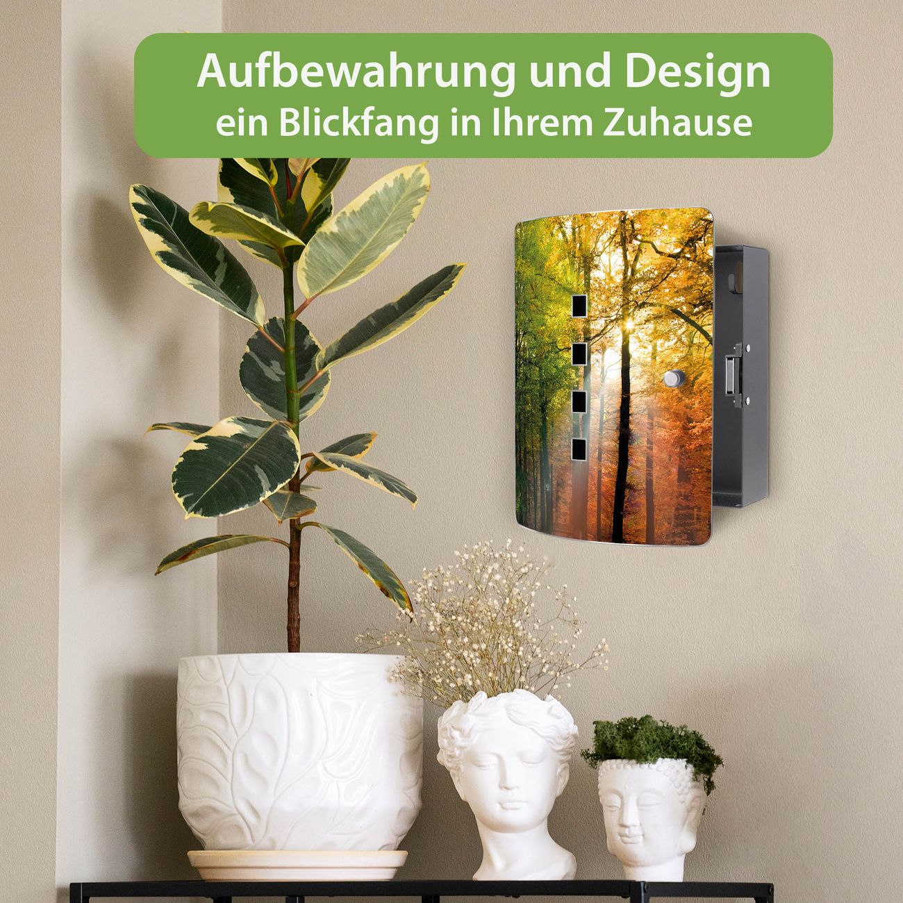 Funktion / Nutzen: Die leicht geschwungene Edelstahltür ist mit einer hochwertigen Motivfolie und dem Motiv Motiv Herbstwald kaschiert. Ein praktischer Magnetverschluss ermöglicht Ihnen ein schnelles Öffnen und Schließen. Befestigt wird der Schlüsselkasten an 2 Stellen auf der Rückseite, passendes Montagematerial fügen wir bereits bei.