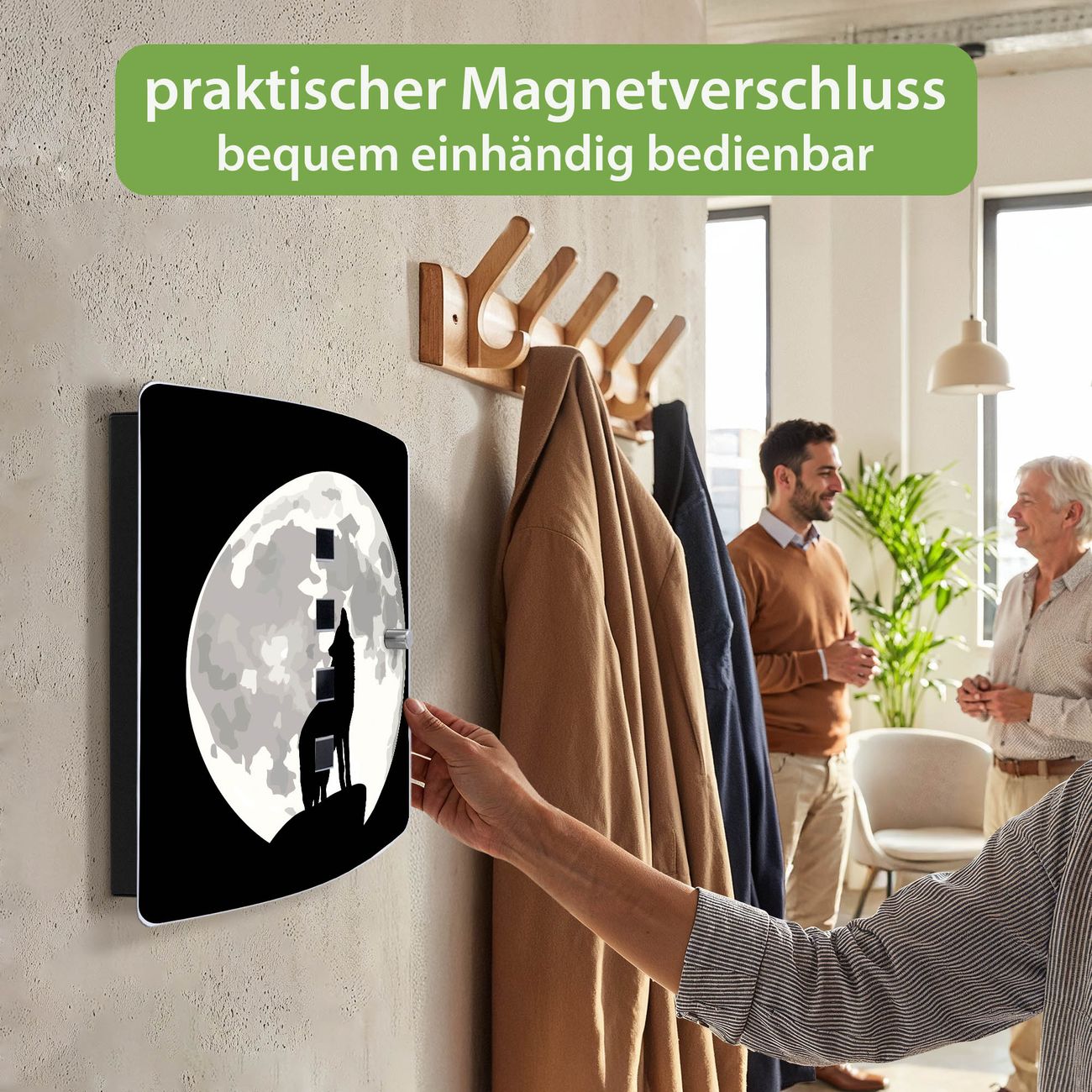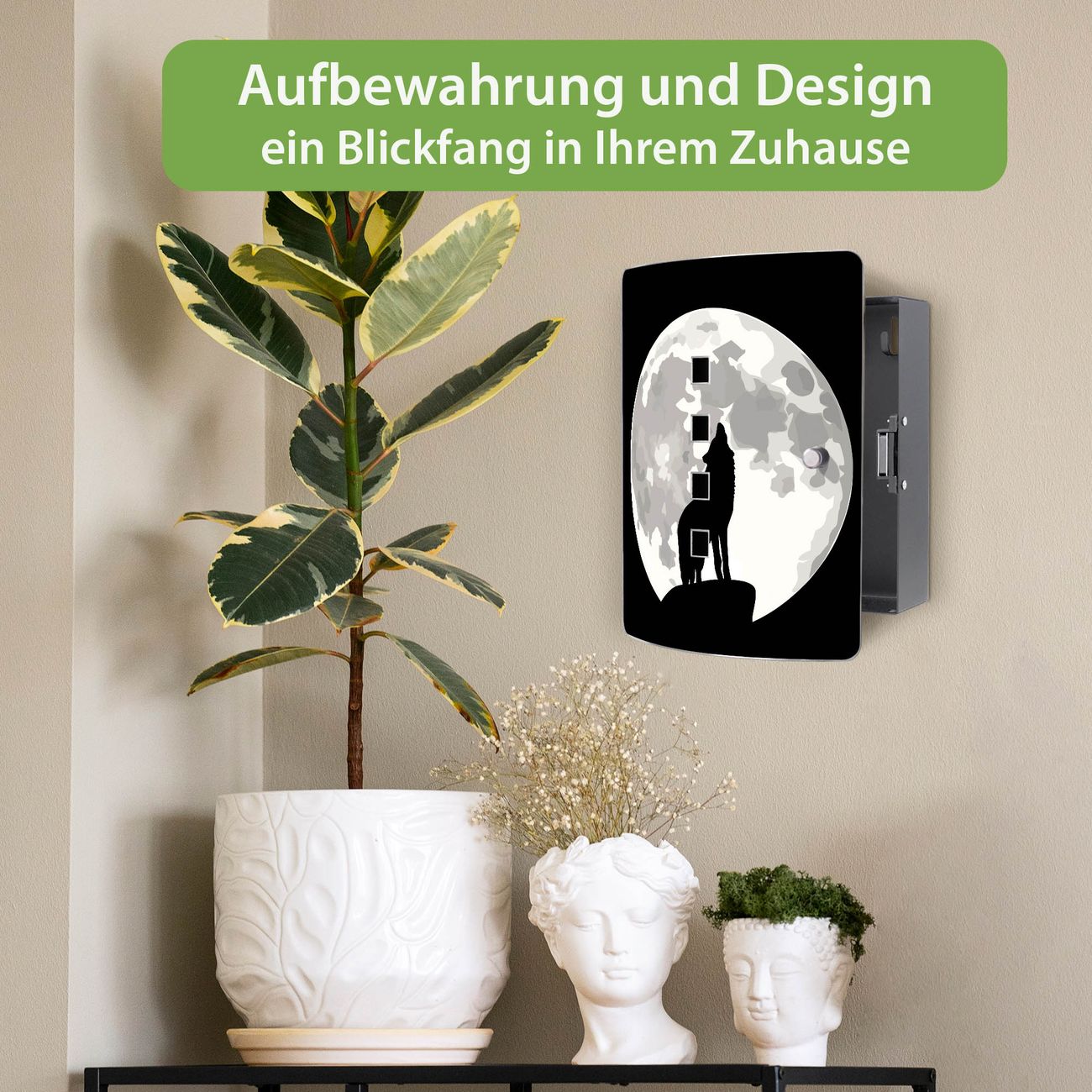 Funktion / Nutzen: Die leicht geschwungene Edelstahltür ist mit einer hochwertigen Motivfolie und dem Motiv Motiv Heulender Wolf SW kaschiert. Ein praktischer Magnetverschluss ermöglicht Ihnen ein schnelles Öffnen und Schließen. Befestigt wird der Schlüsselkasten an 2 Stellen auf der Rückseite, passendes Montagematerial fügen wir bereits bei.