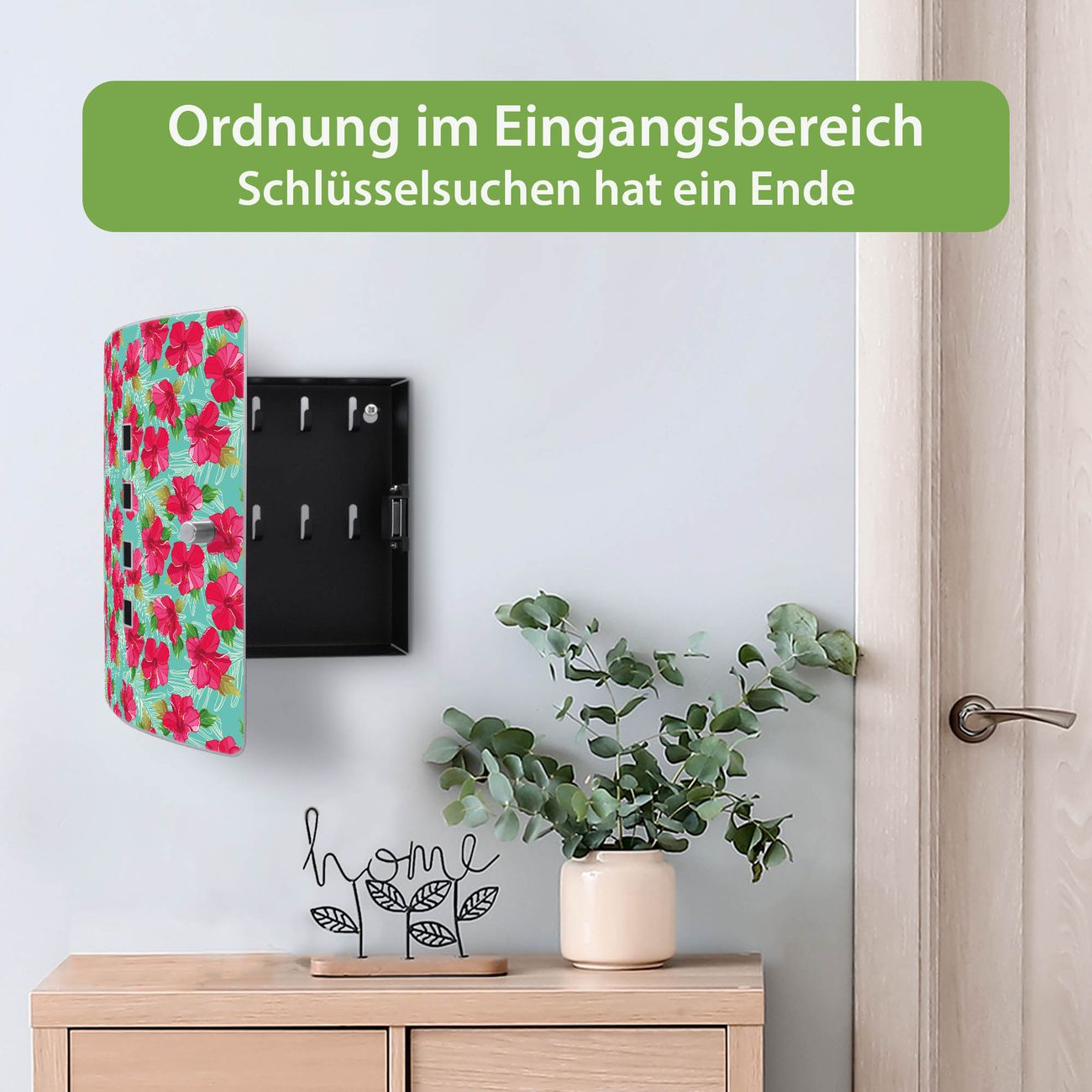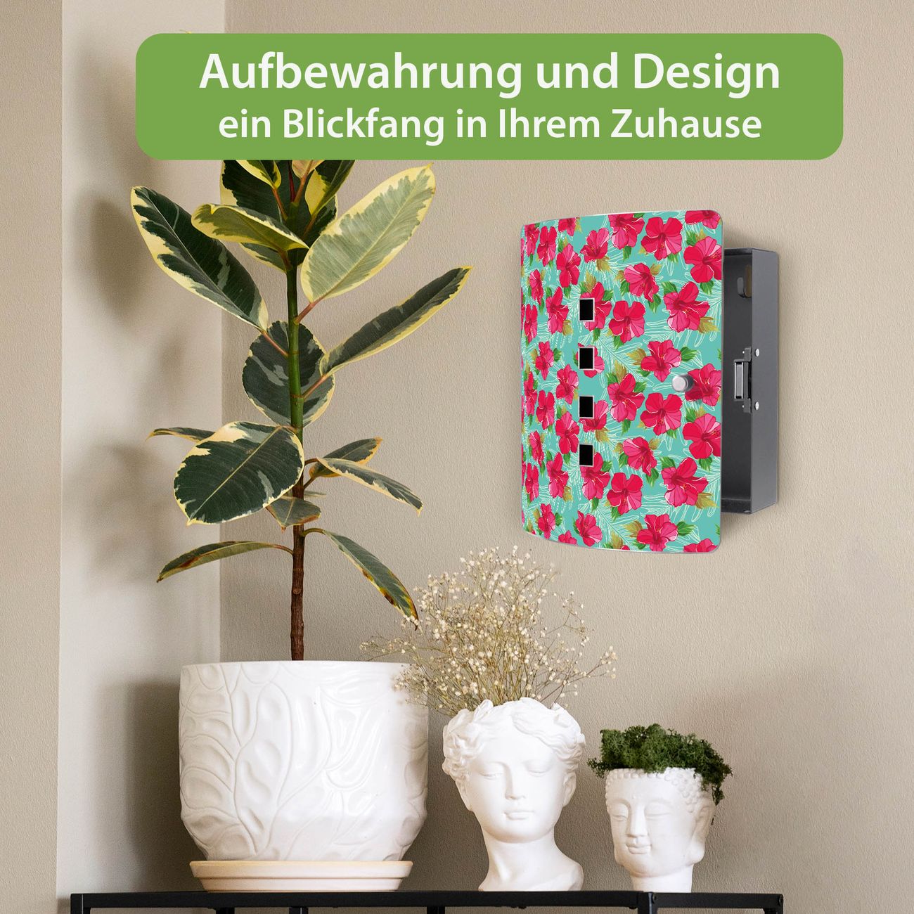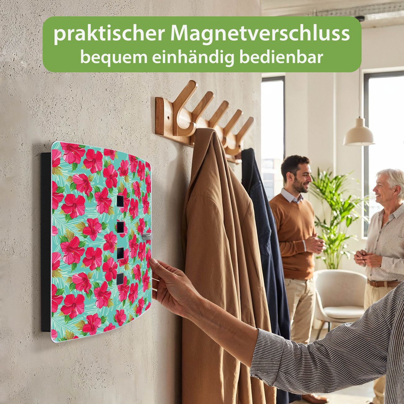 Funktion / Nutzen: Die leicht geschwungene Edelstahltür ist mit einer hochwertigen Motivfolie und dem Motiv Motiv Hibiskus kaschiert. Ein praktischer Magnetverschluss ermöglicht Ihnen ein schnelles Öffnen und Schließen. Befestigt wird der Schlüsselkasten an 2 Stellen auf der Rückseite, passendes Montagematerial fügen wir bereits bei.