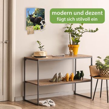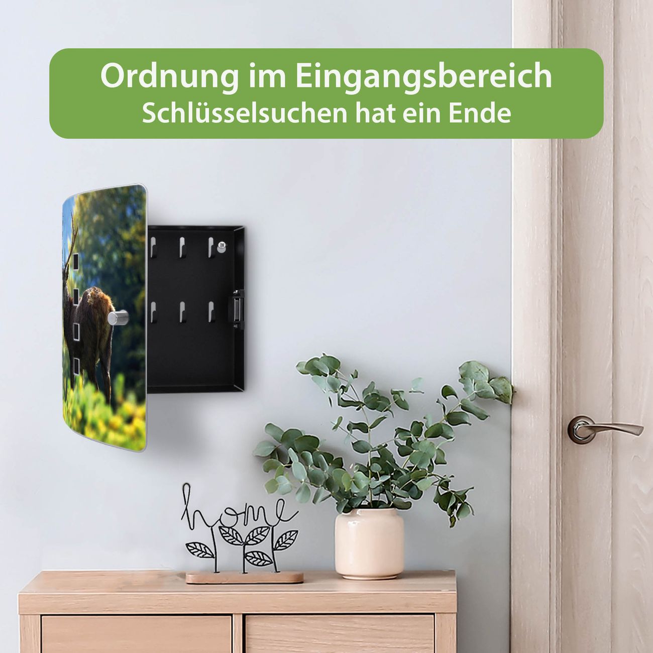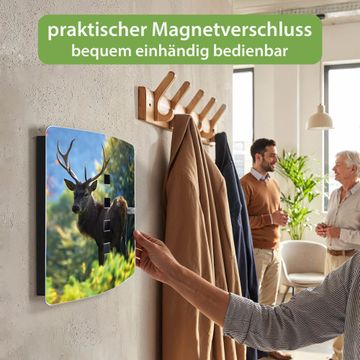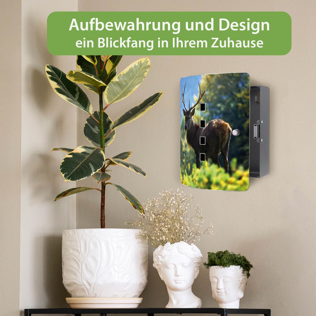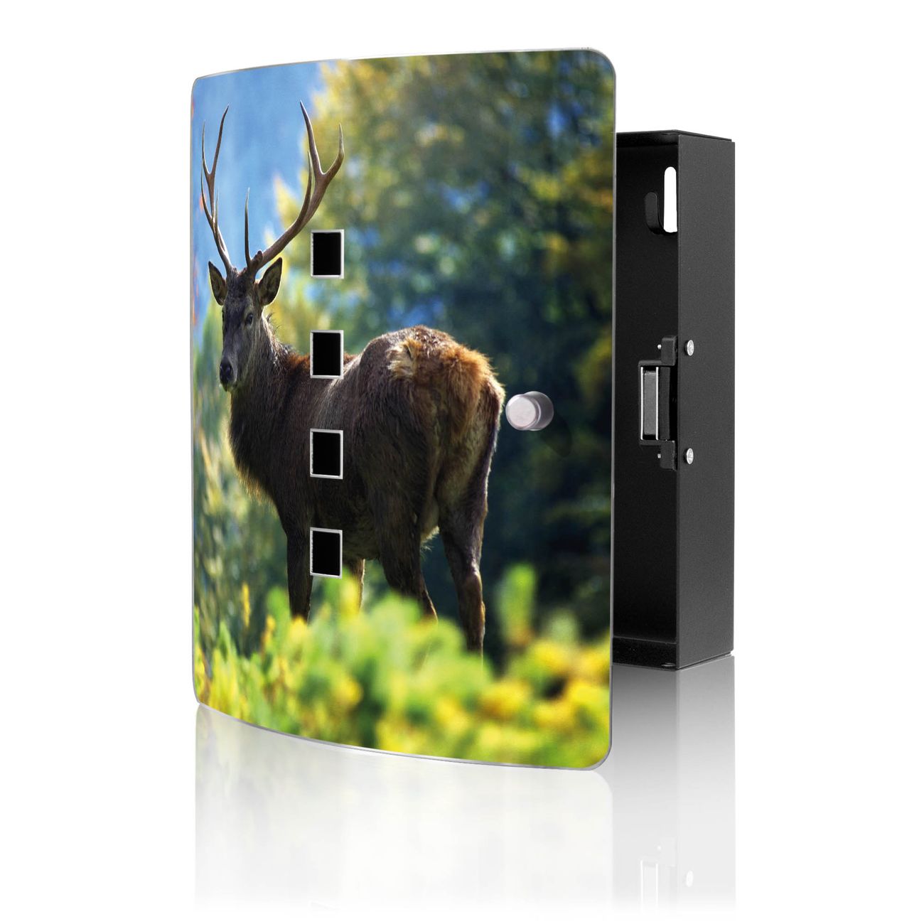 Funktion / Nutzen: Die leicht geschwungene Edelstahltür ist mit einer hochwertigen Motivfolie und dem Motiv Motiv Hirsch kaschiert. Ein praktischer Magnetverschluss ermöglicht Ihnen ein schnelles Öffnen und Schließen. Befestigt wird der Schlüsselkasten an 2 Stellen auf der Rückseite, passendes Montagematerial fügen wir bereits bei.