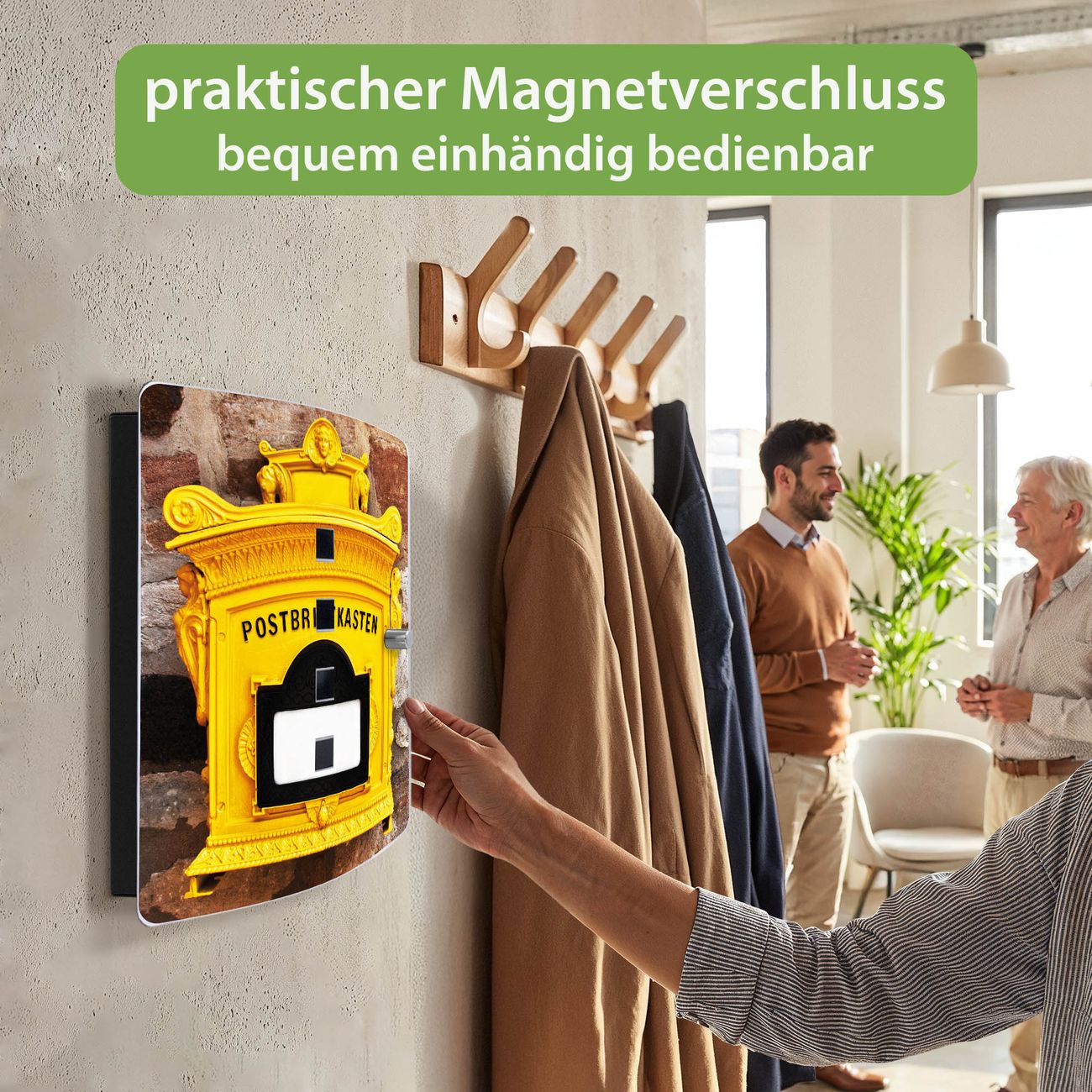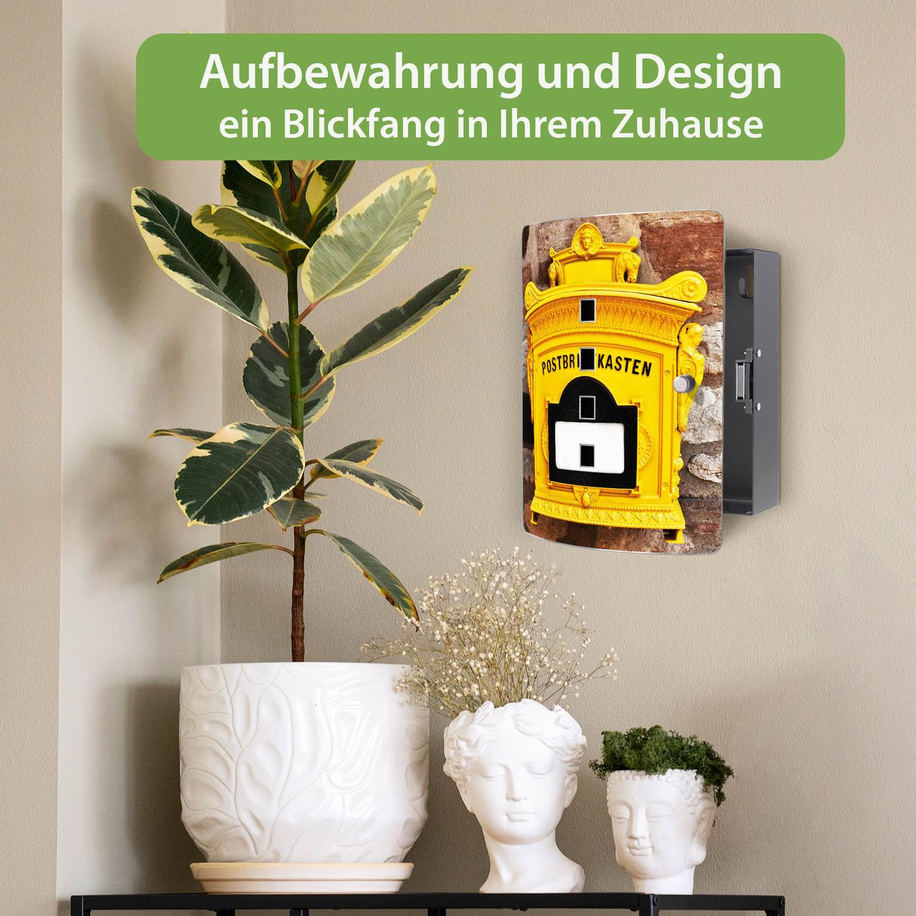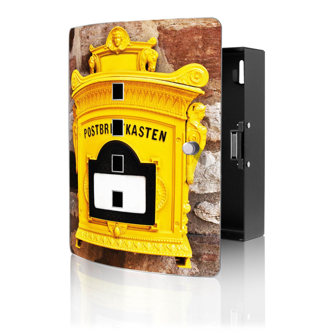 Funktion / Nutzen: Die leicht geschwungene Edelstahltür ist mit einer hochwertigen Motivfolie und dem Motiv Motiv Historischer Postkasten kaschiert. Ein praktischer Magnetverschluss ermöglicht Ihnen ein schnelles Öffnen und Schließen. Befestigt wird der Schlüsselkasten an 2 Stellen auf der Rückseite, passendes Montagematerial fügen wir bereits bei.