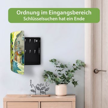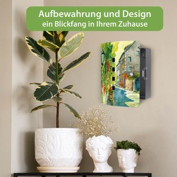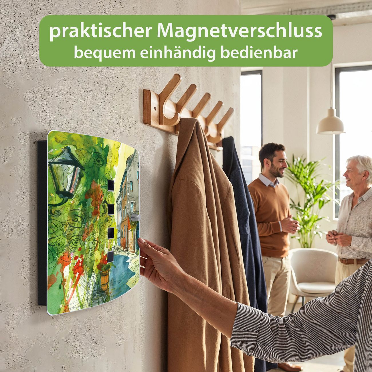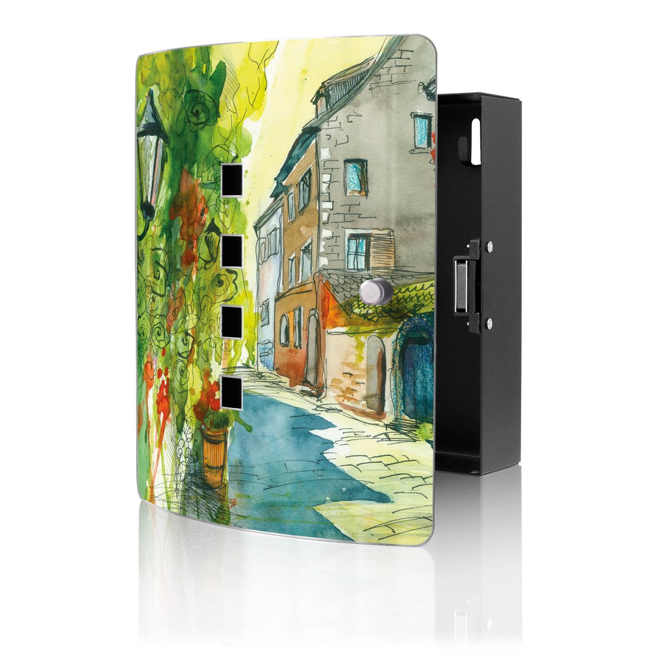 Funktion / Nutzen: Die leicht geschwungene Edelstahltür ist mit einer hochwertigen Motivfolie und dem Motiv Motiv Historischer Stadtkern kaschiert. Ein praktischer Magnetverschluss ermöglicht Ihnen ein schnelles Öffnen und Schließen. Befestigt wird der Schlüsselkasten an 2 Stellen auf der Rückseite, passendes Montagematerial fügen wir bereits bei.