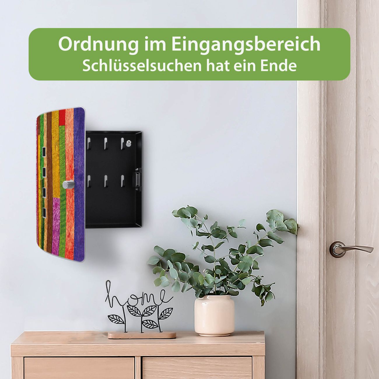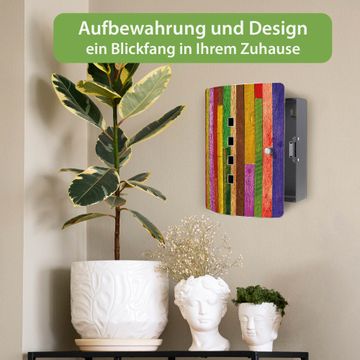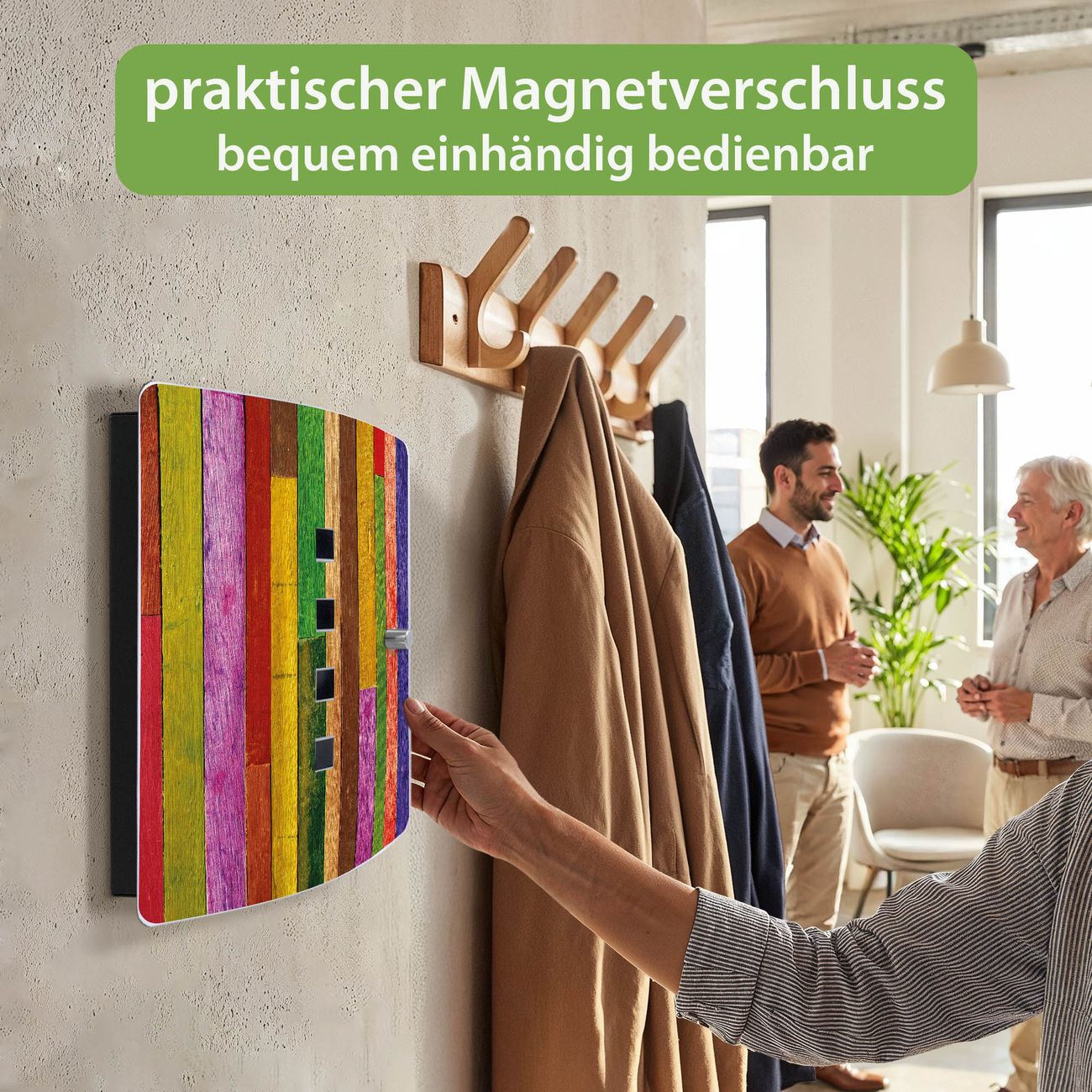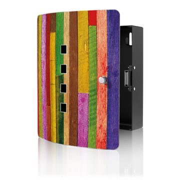 Funktion / Nutzen: Die leicht geschwungene Edelstahltür ist mit einer hochwertigen Motivfolie und dem Motiv Motiv Holz Collage Bunt kaschiert. Ein praktischer Magnetverschluss ermöglicht Ihnen ein schnelles Öffnen und Schließen. Befestigt wird der Schlüsselkasten an 2 Stellen auf der Rückseite, passendes Montagematerial fügen wir bereits bei.