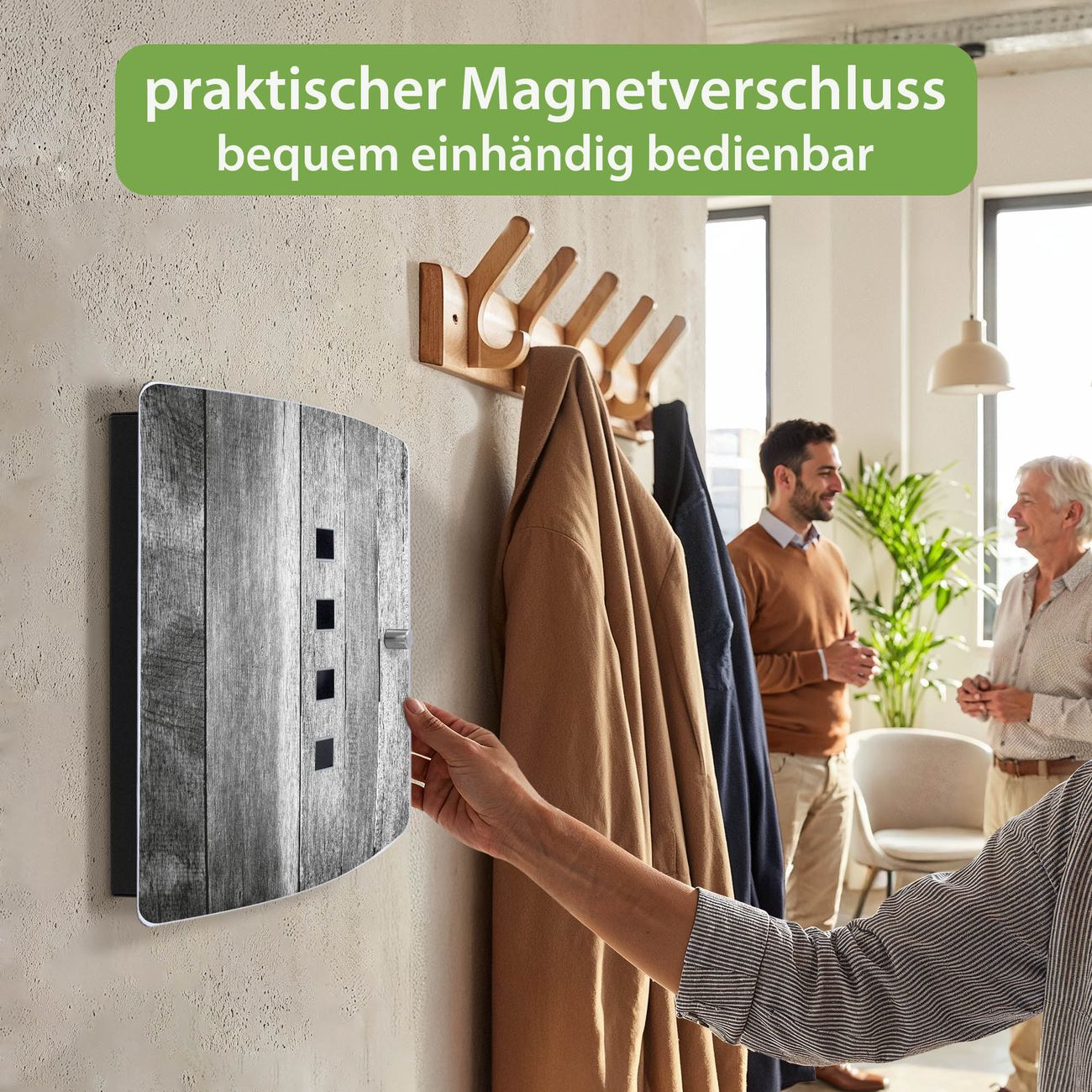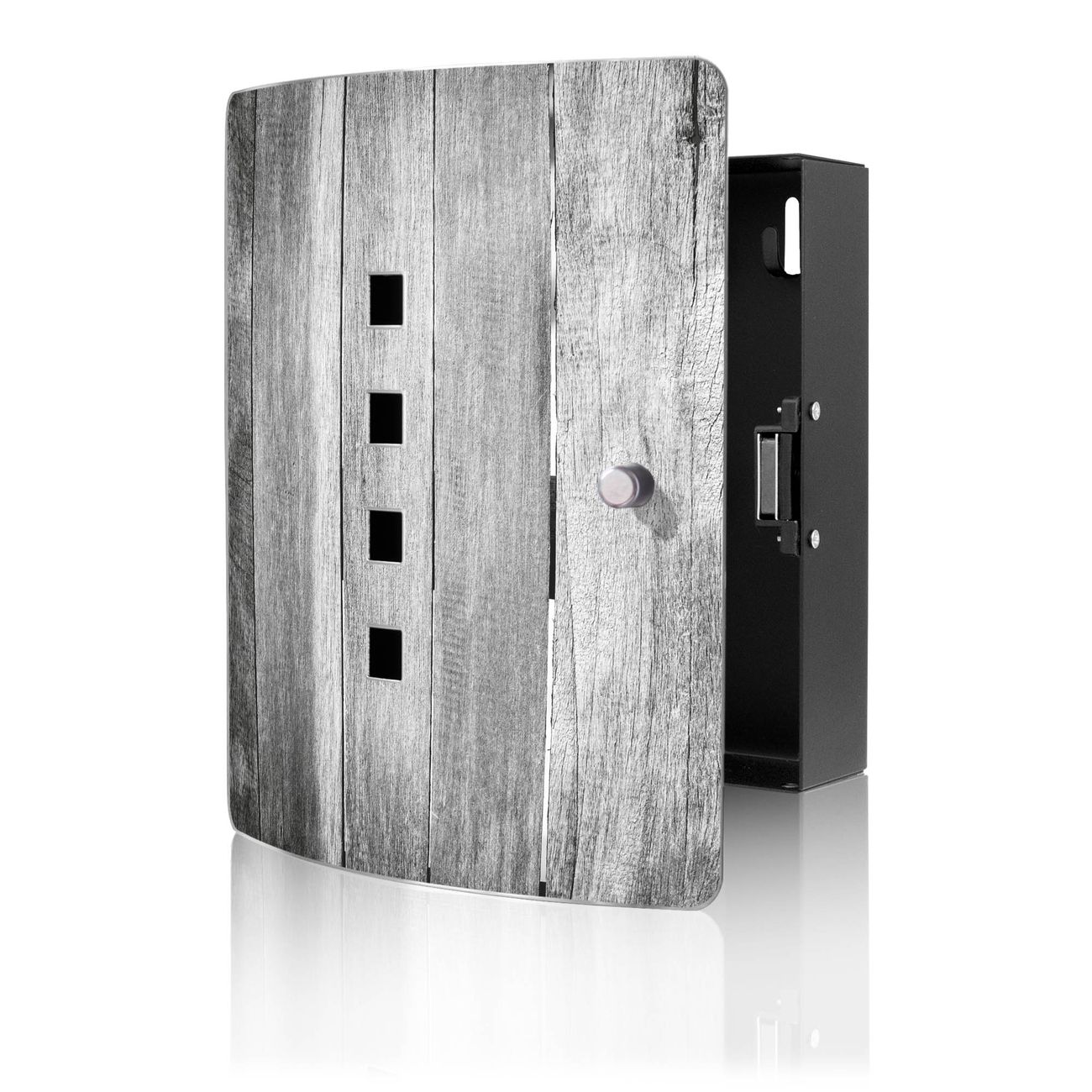 Funktion / Nutzen: Die leicht geschwungene Edelstahltür ist mit einer hochwertigen Motivfolie und dem Motiv Motiv Holz Monochrom kaschiert. Ein praktischer Magnetverschluss ermöglicht Ihnen ein schnelles Öffnen und Schließen. Befestigt wird der Schlüsselkasten an 2 Stellen auf der Rückseite, passendes Montagematerial fügen wir bereits bei.