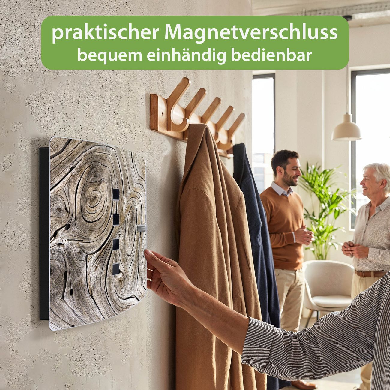 Funktion / Nutzen: Die leicht geschwungene Edelstahltür ist mit einer hochwertigen Motivfolie und dem Motiv Motiv Holzwirbel kaschiert. Ein praktischer Magnetverschluss ermöglicht Ihnen ein schnelles Öffnen und Schließen. Befestigt wird der Schlüsselkasten an 2 Stellen auf der Rückseite, passendes Montagematerial fügen wir bereits bei.