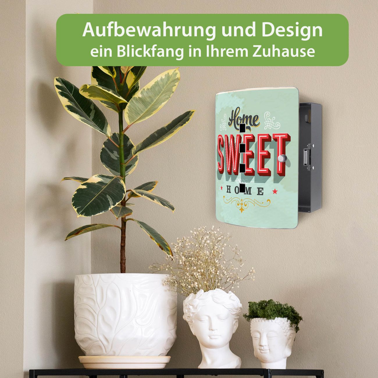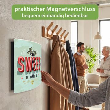 Funktion / Nutzen: Die leicht geschwungene Edelstahltür ist mit einer hochwertigen Motivfolie und dem Motiv Motiv Home Sweet Home kaschiert. Ein praktischer Magnetverschluss ermöglicht Ihnen ein schnelles Öffnen und Schließen. Befestigt wird der Schlüsselkasten an 2 Stellen auf der Rückseite, passendes Montagematerial fügen wir bereits bei.