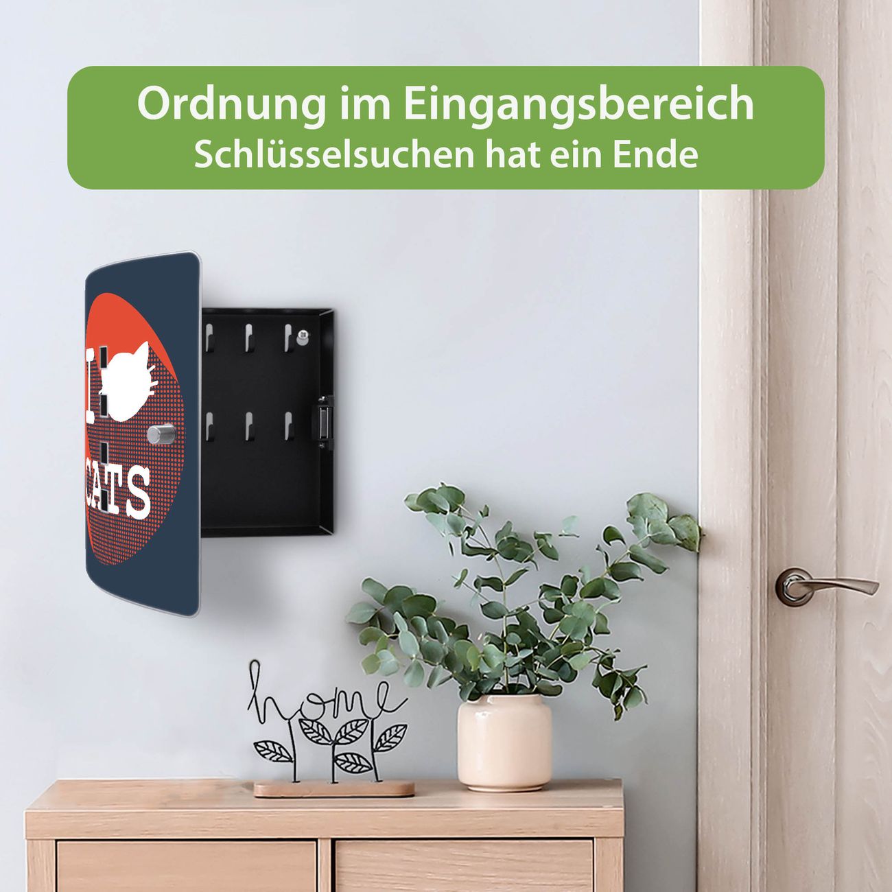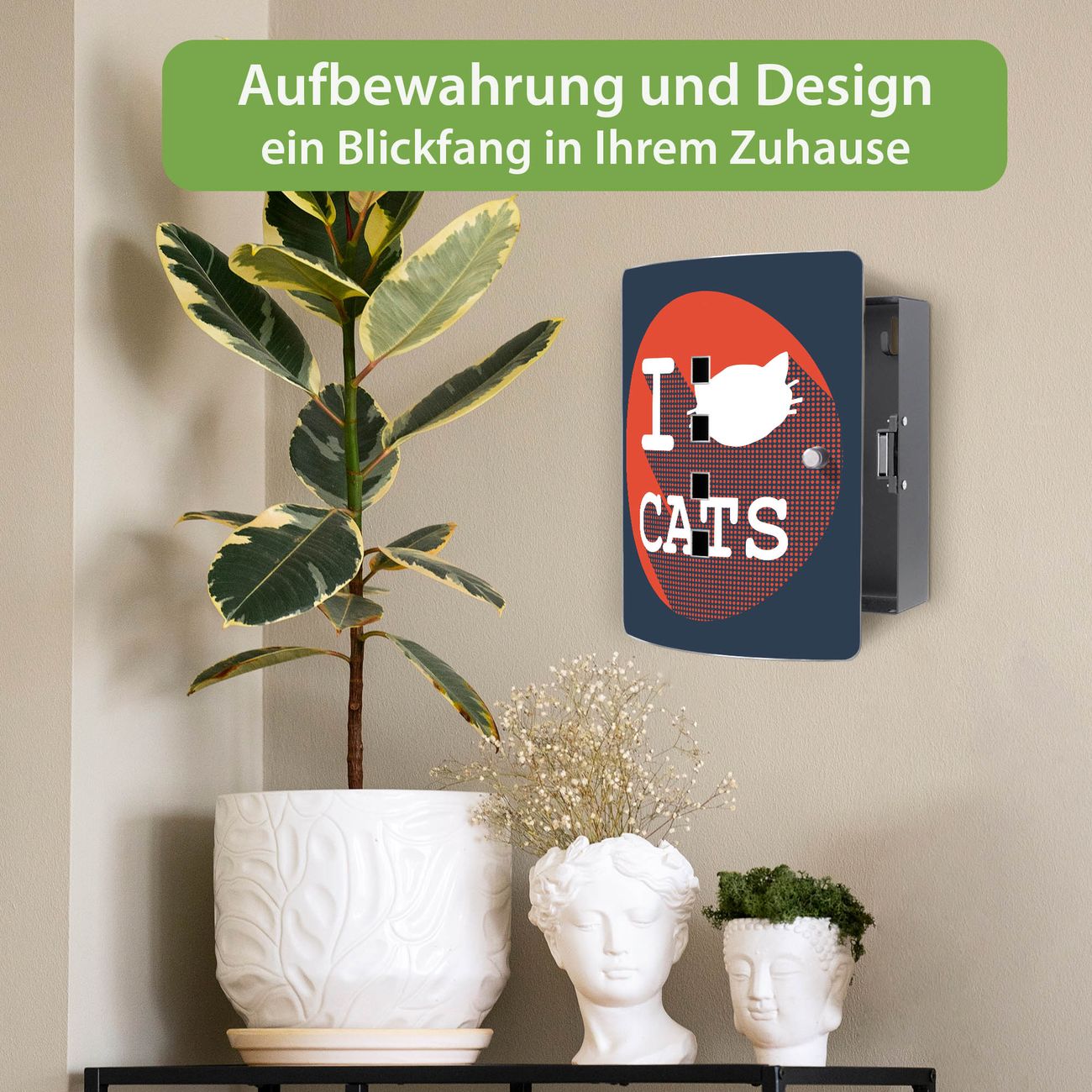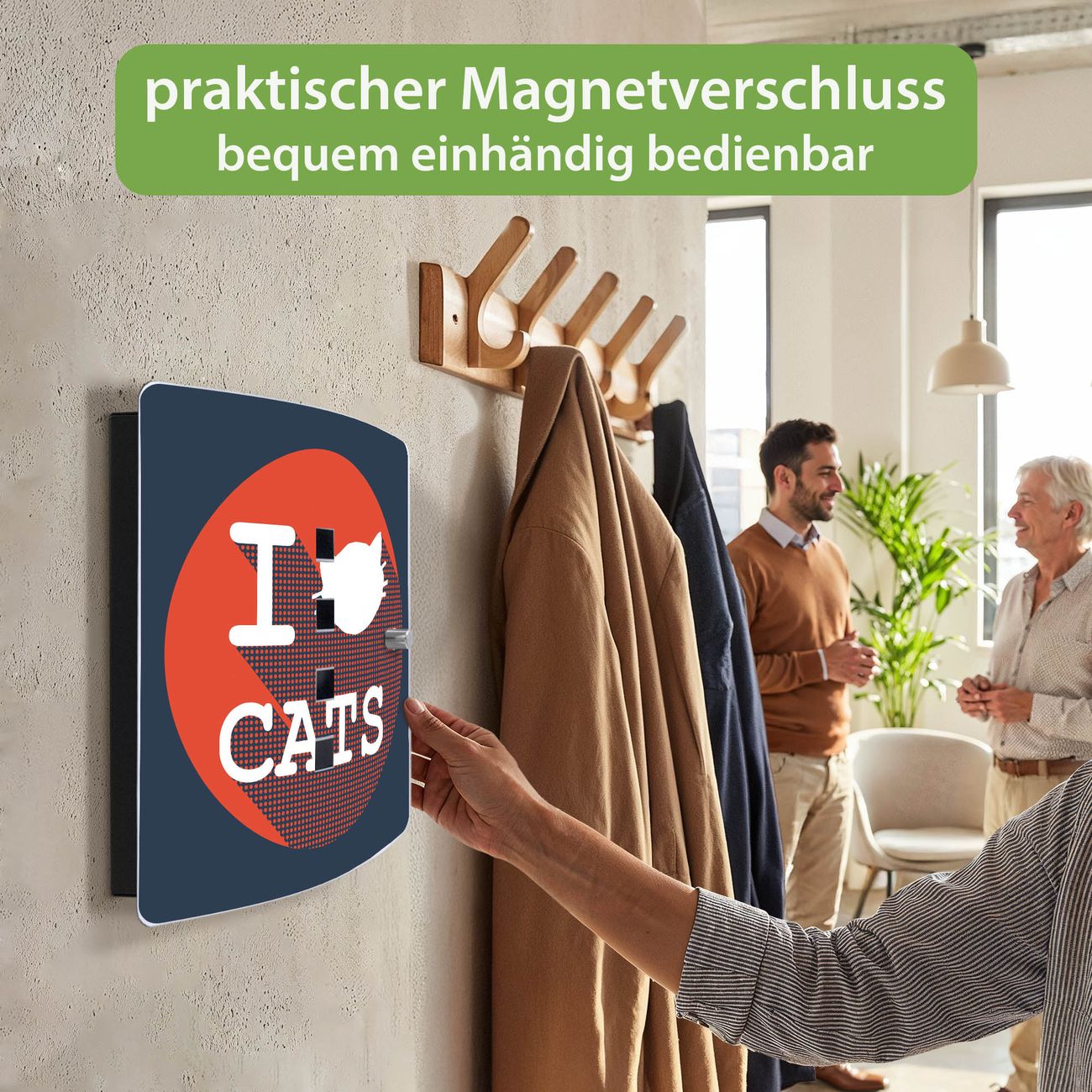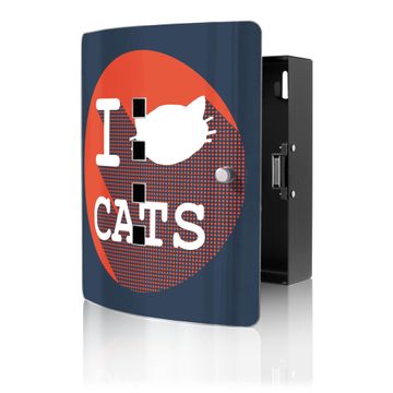 Funktion / Nutzen: Die leicht geschwungene Edelstahltür ist mit einer hochwertigen Motivfolie und dem Motiv Motiv I Love Cats kaschiert. Ein praktischer Magnetverschluss ermöglicht Ihnen ein schnelles Öffnen und Schließen. Befestigt wird der Schlüsselkasten an 2 Stellen auf der Rückseite, passendes Montagematerial fügen wir bereits bei.