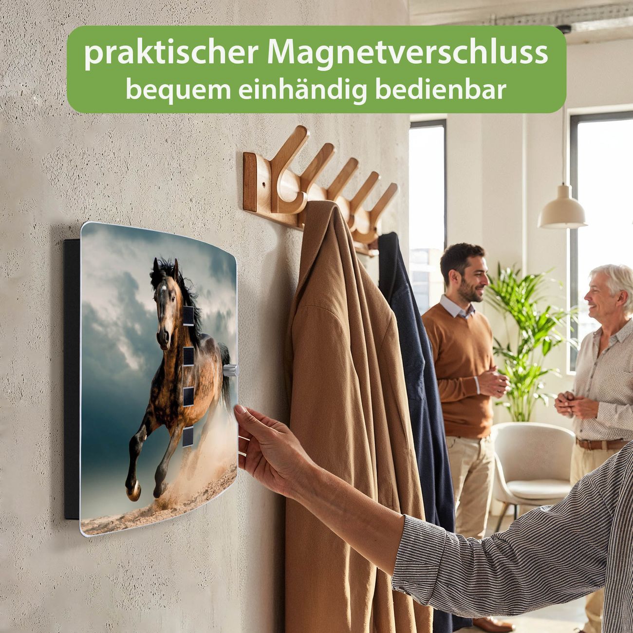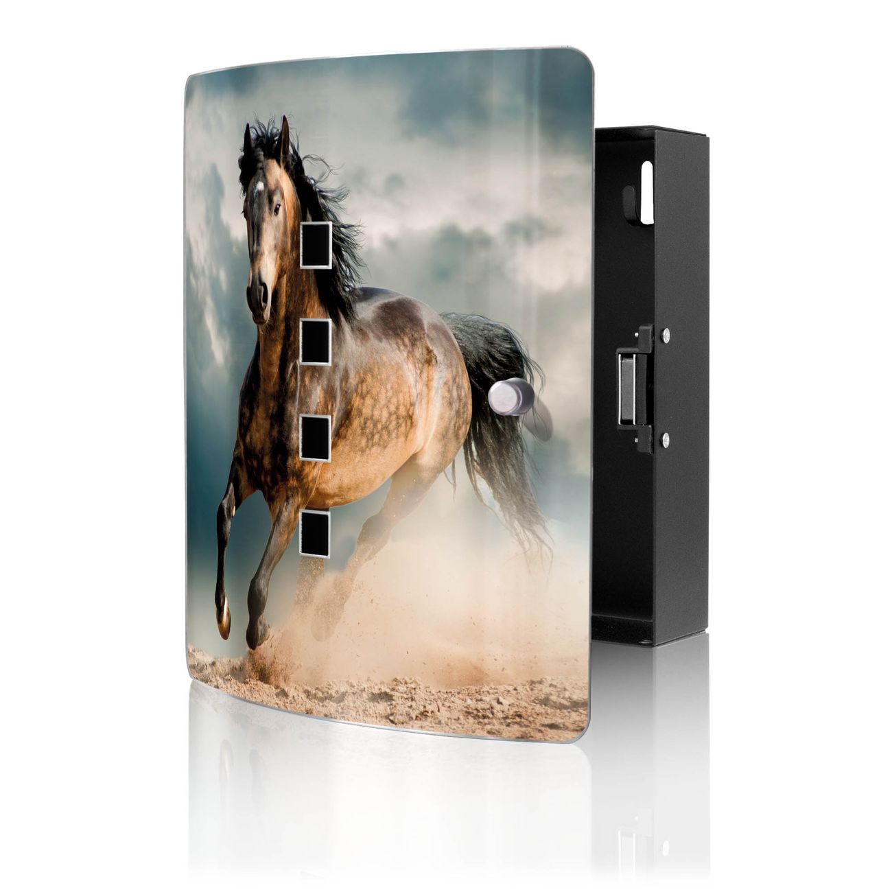 Funktion / Nutzen: Die leicht geschwungene Edelstahltür ist mit einer hochwertigen Motivfolie und dem Motiv Motiv Ibrahim kaschiert. Ein praktischer Magnetverschluss ermöglicht Ihnen ein schnelles Öffnen und Schließen. Befestigt wird der Schlüsselkasten an 2 Stellen auf der Rückseite, passendes Montagematerial fügen wir bereits bei.