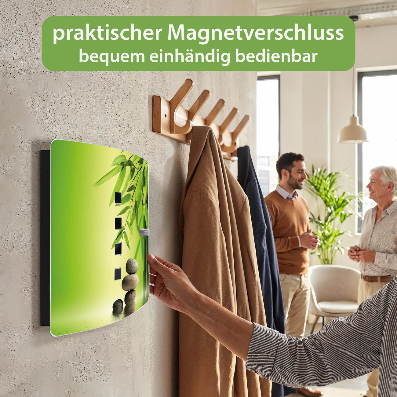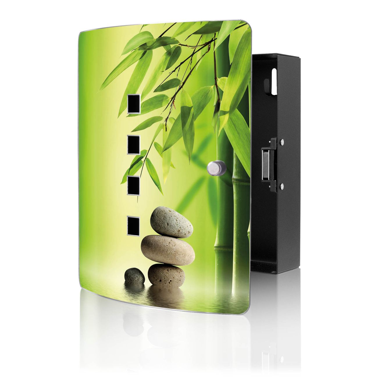 Funktion / Nutzen: Die leicht geschwungene Edelstahltür ist mit einer hochwertigen Motivfolie und dem Motiv Motiv Innere Ruhe kaschiert. Ein praktischer Magnetverschluss ermöglicht Ihnen ein schnelles Öffnen und Schließen. Befestigt wird der Schlüsselkasten an 2 Stellen auf der Rückseite, passendes Montagematerial fügen wir bereits bei.