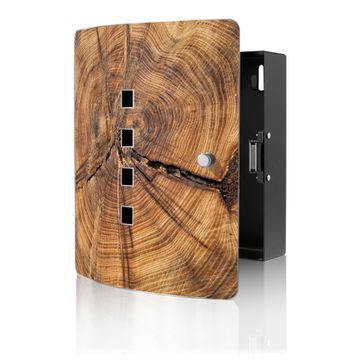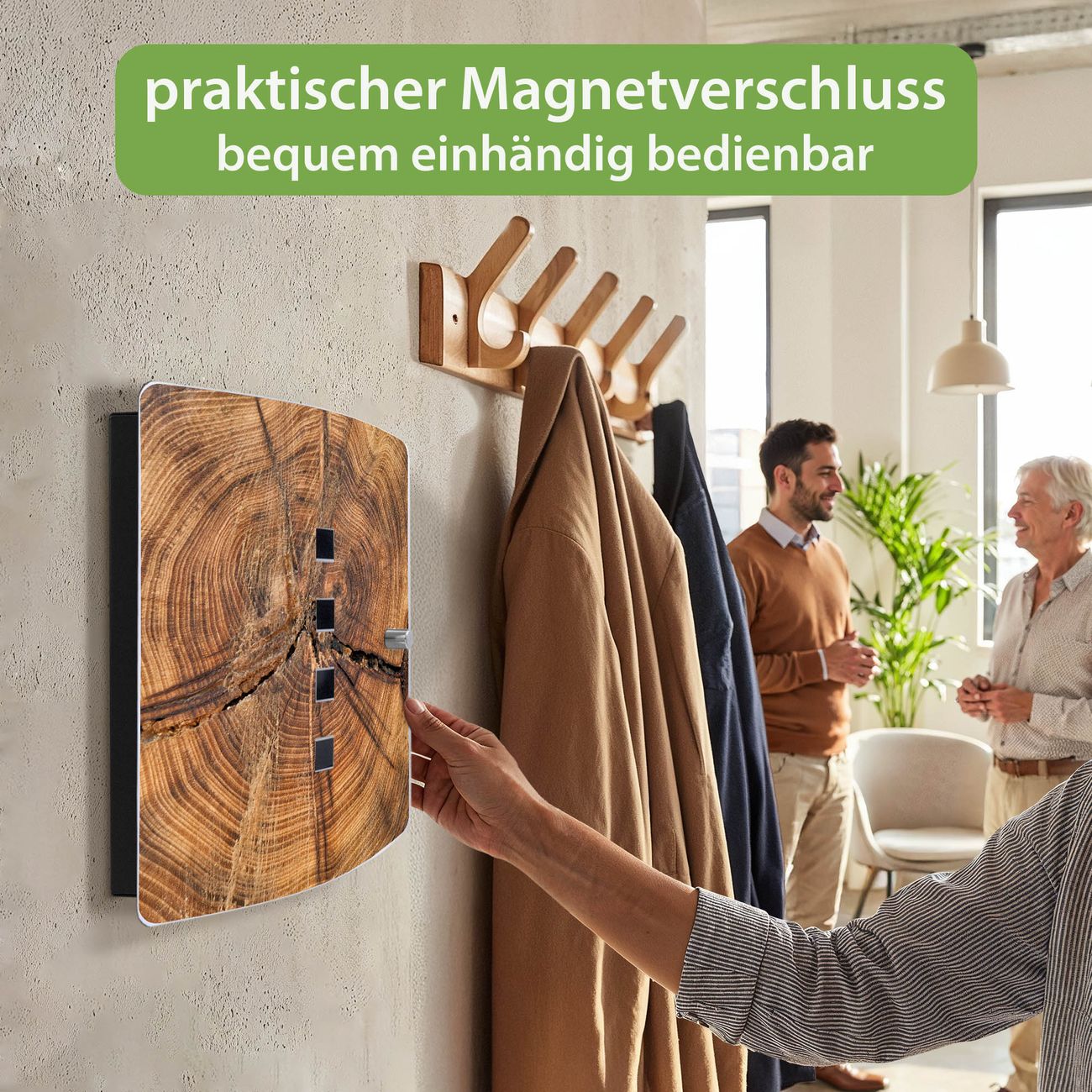 Funktion / Nutzen: Die leicht geschwungene Edelstahltür ist mit einer hochwertigen Motivfolie und dem Motiv Motiv Jahresringe kaschiert. Ein praktischer Magnetverschluss ermöglicht Ihnen ein schnelles Öffnen und Schließen. Befestigt wird der Schlüsselkasten an 2 Stellen auf der Rückseite, passendes Montagematerial fügen wir bereits bei.