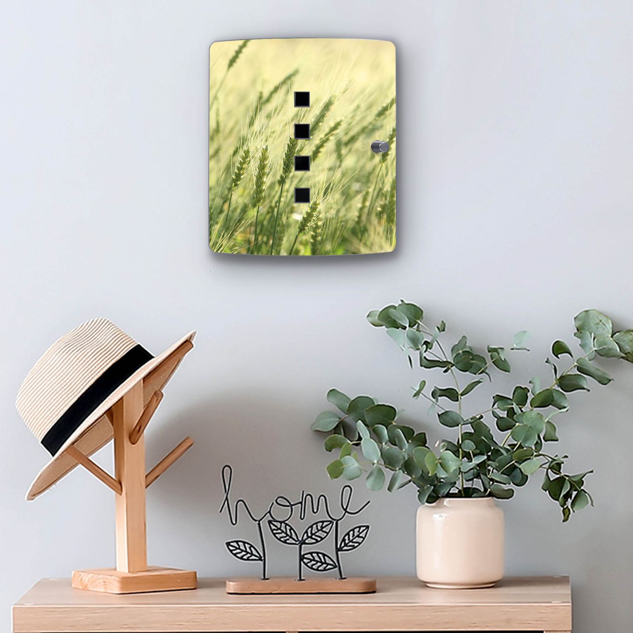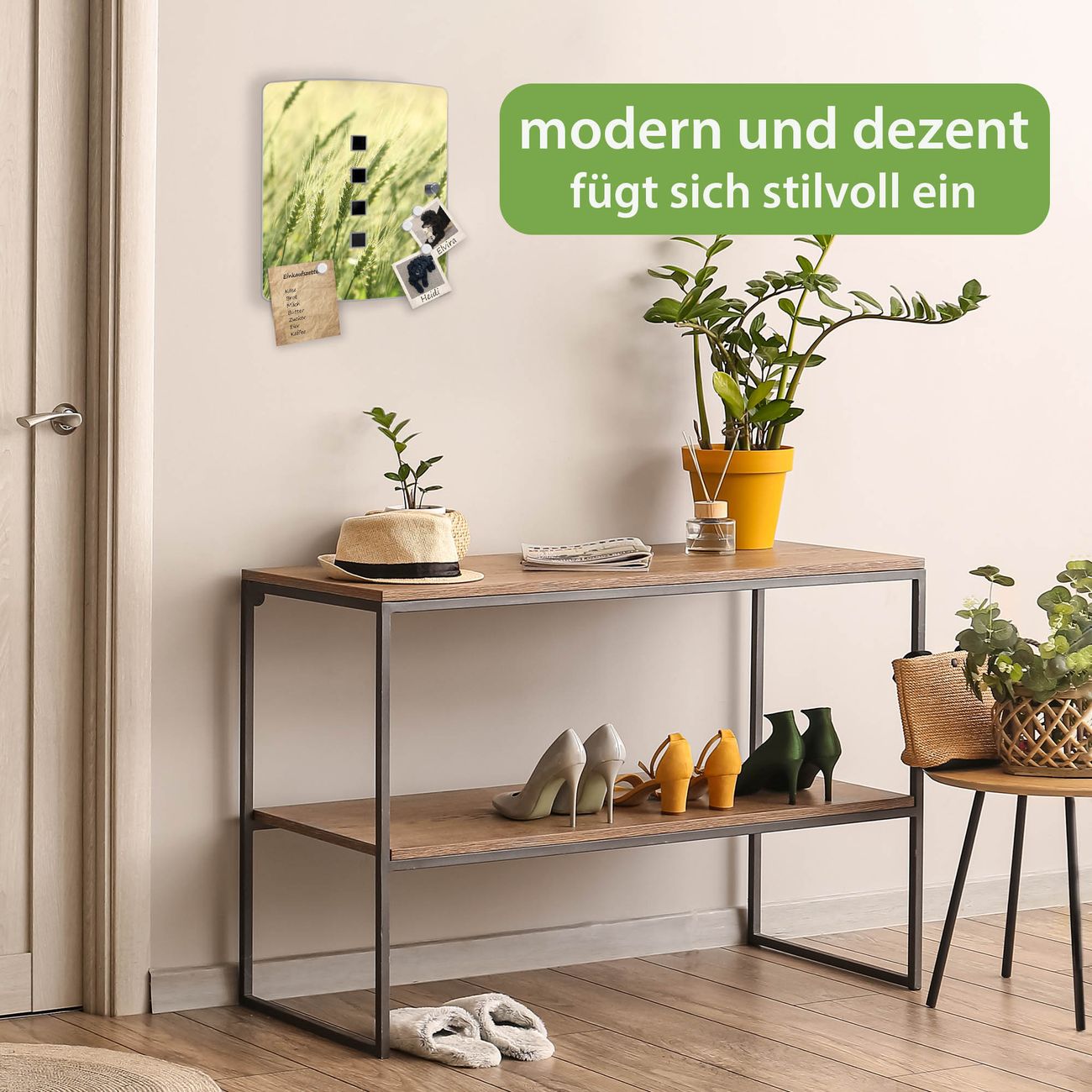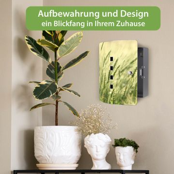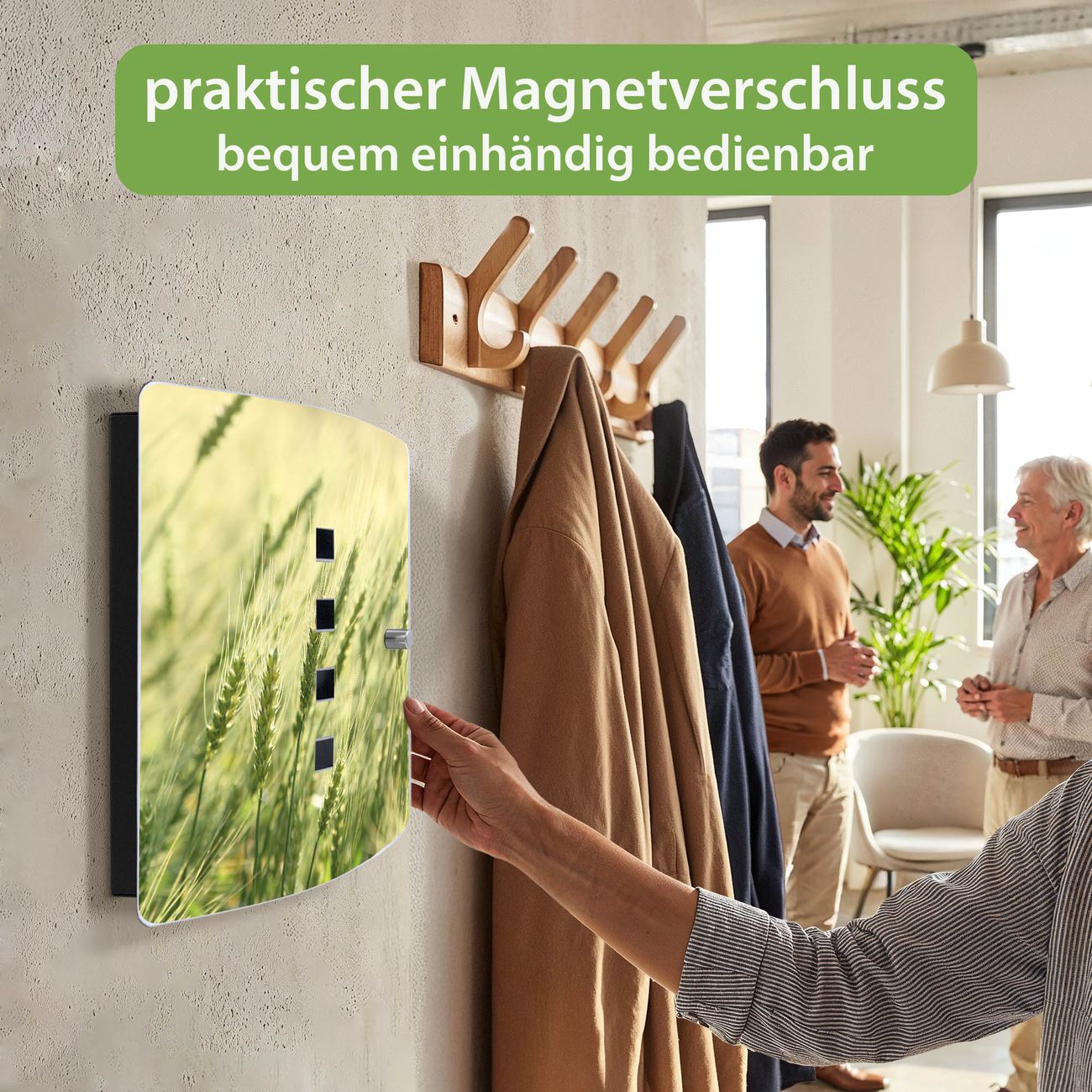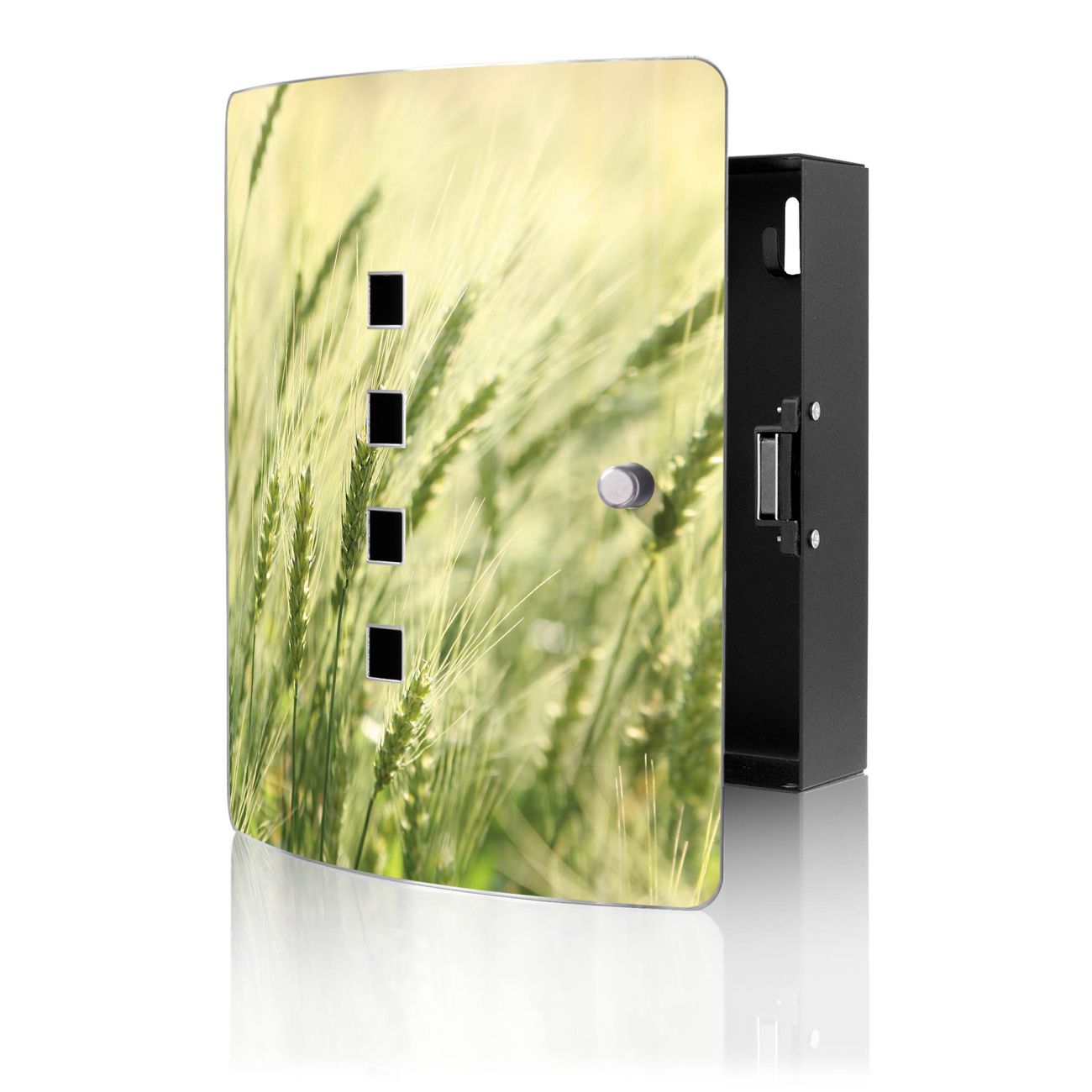 Funktion / Nutzen: Die leicht geschwungene Edelstahltür ist mit einer hochwertigen Motivfolie und dem Motiv Motiv Junges Getreide kaschiert. Ein praktischer Magnetverschluss ermöglicht Ihnen ein schnelles Öffnen und Schließen. Befestigt wird der Schlüsselkasten an 2 Stellen auf der Rückseite, passendes Montagematerial fügen wir bereits bei.