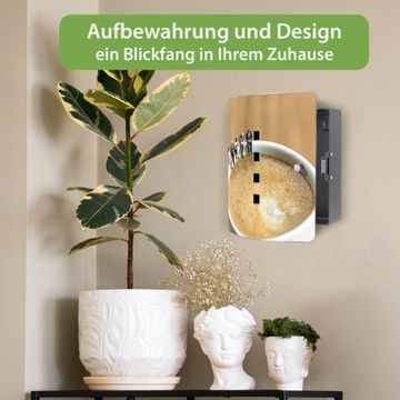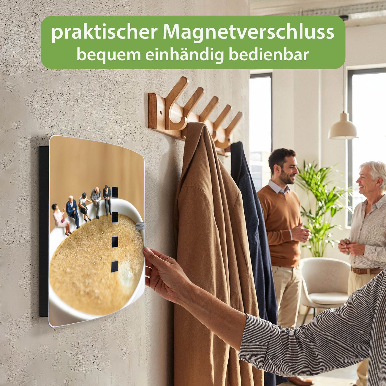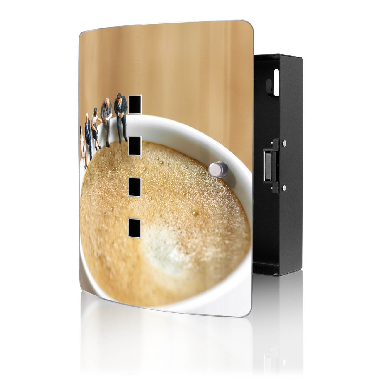 Funktion / Nutzen: Die leicht geschwungene Edelstahltür ist mit einer hochwertigen Motivfolie und dem Motiv Motiv Kaffeepause kaschiert. Ein praktischer Magnetverschluss ermöglicht Ihnen ein schnelles Öffnen und Schließen. Befestigt wird der Schlüsselkasten an 2 Stellen auf der Rückseite, passendes Montagematerial fügen wir bereits bei.