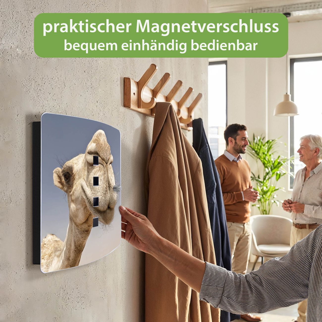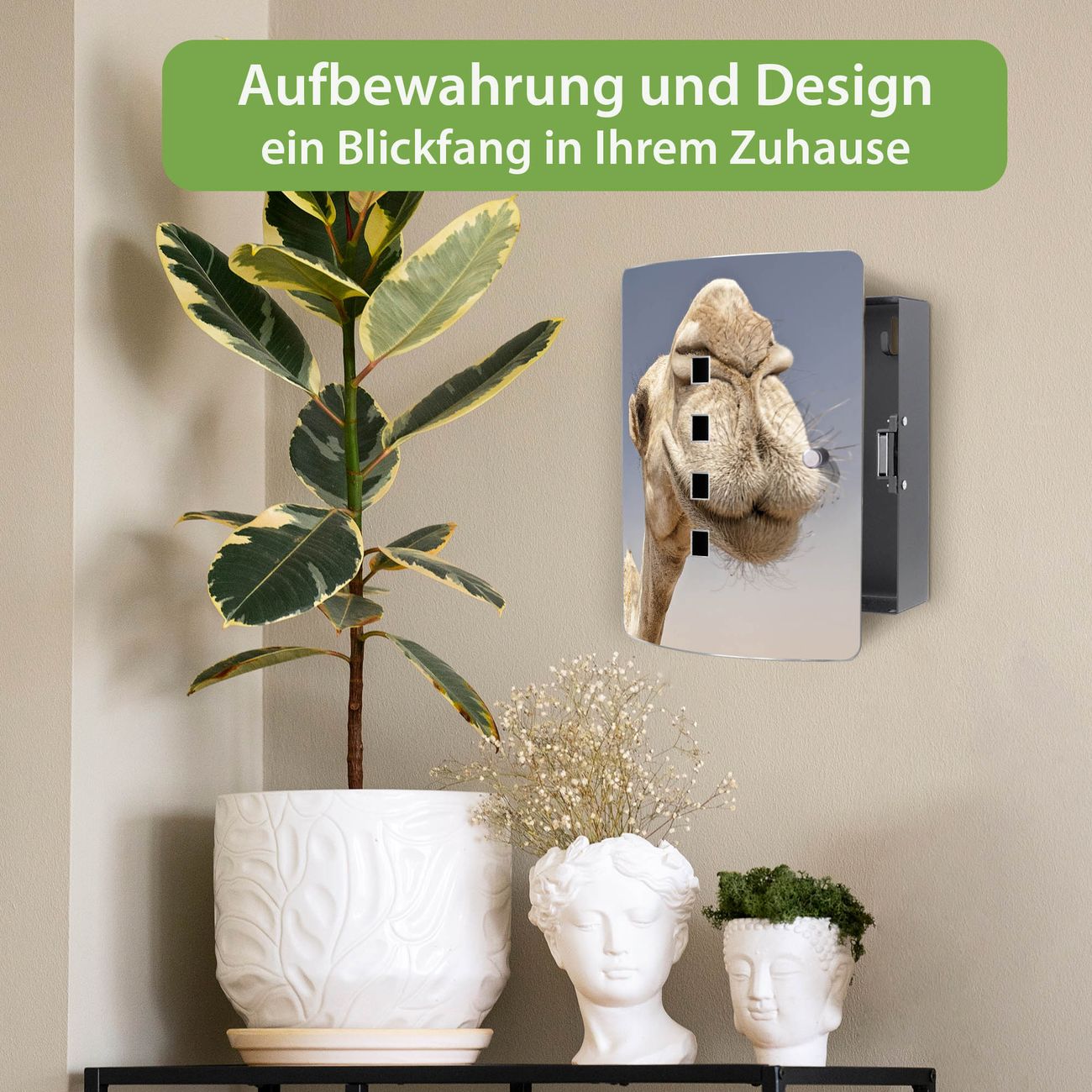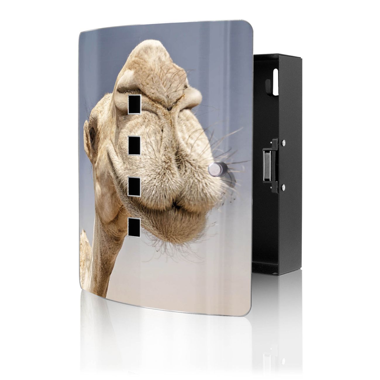 Funktion / Nutzen: Die leicht geschwungene Edelstahltür ist mit einer hochwertigen Motivfolie und dem Motiv Motiv Kamele kaschiert. Ein praktischer Magnetverschluss ermöglicht Ihnen ein schnelles Öffnen und Schließen. Befestigt wird der Schlüsselkasten an 2 Stellen auf der Rückseite, passendes Montagematerial fügen wir bereits bei.