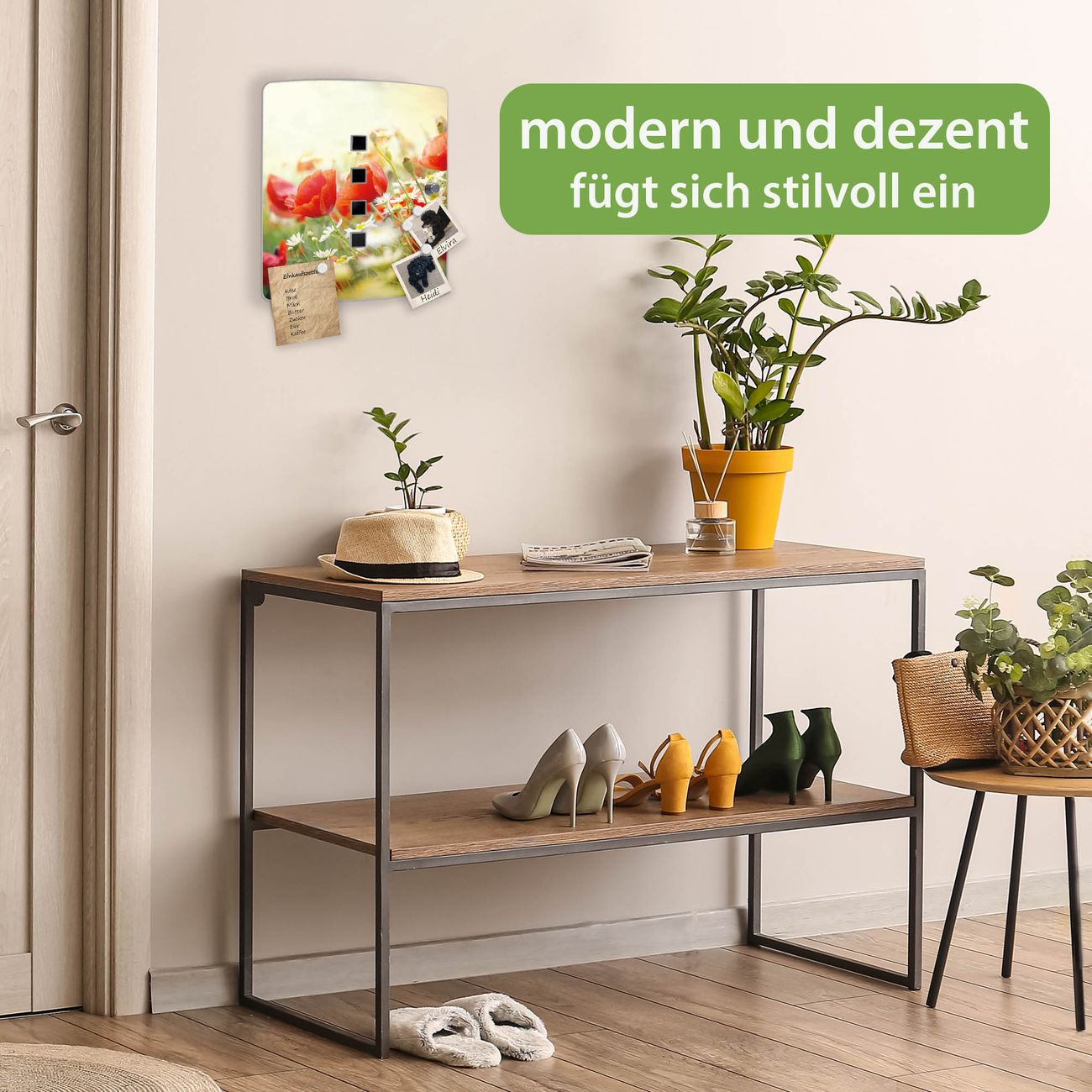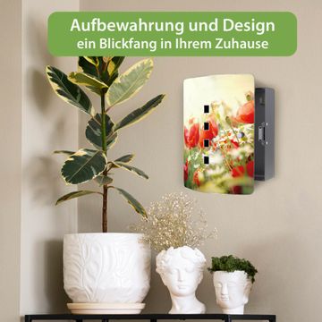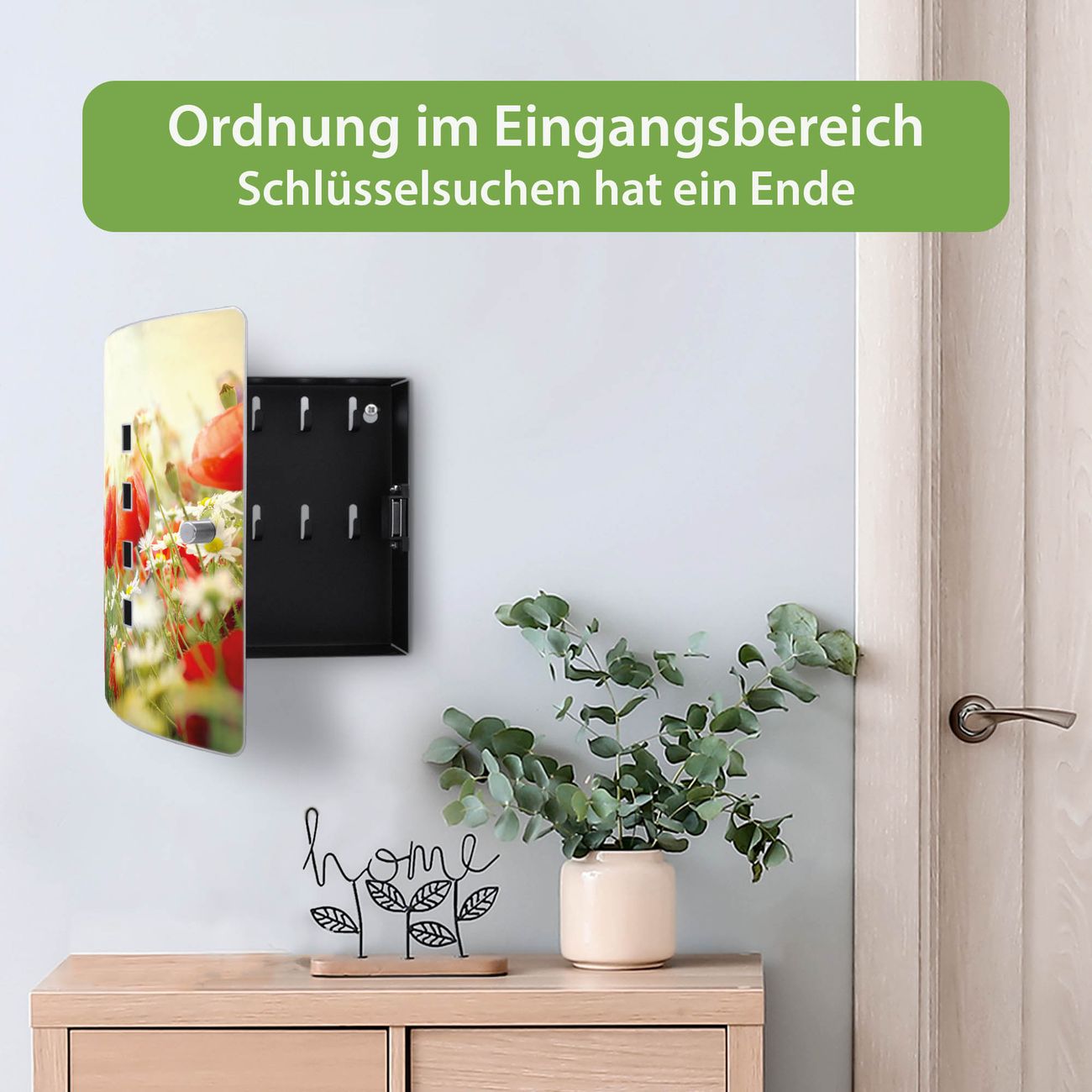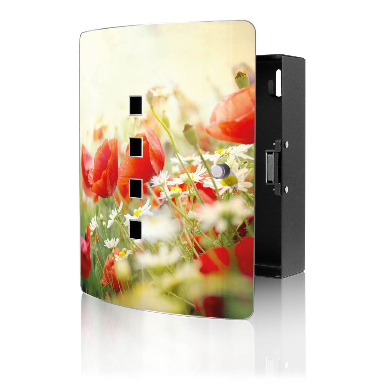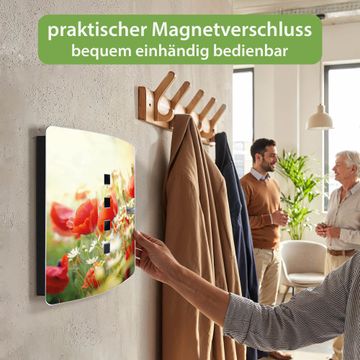 Funktion / Nutzen: Die leicht geschwungene Edelstahltür ist mit einer hochwertigen Motivfolie und dem Motiv Motiv Kamille Und Mohn kaschiert. Ein praktischer Magnetverschluss ermöglicht Ihnen ein schnelles Öffnen und Schließen. Befestigt wird der Schlüsselkasten an 2 Stellen auf der Rückseite, passendes Montagematerial fügen wir bereits bei.