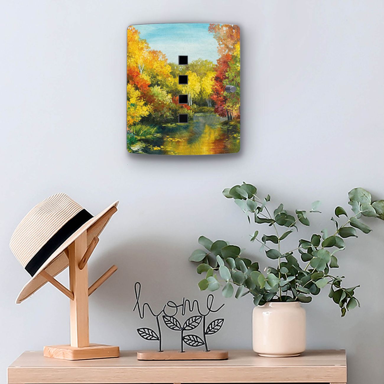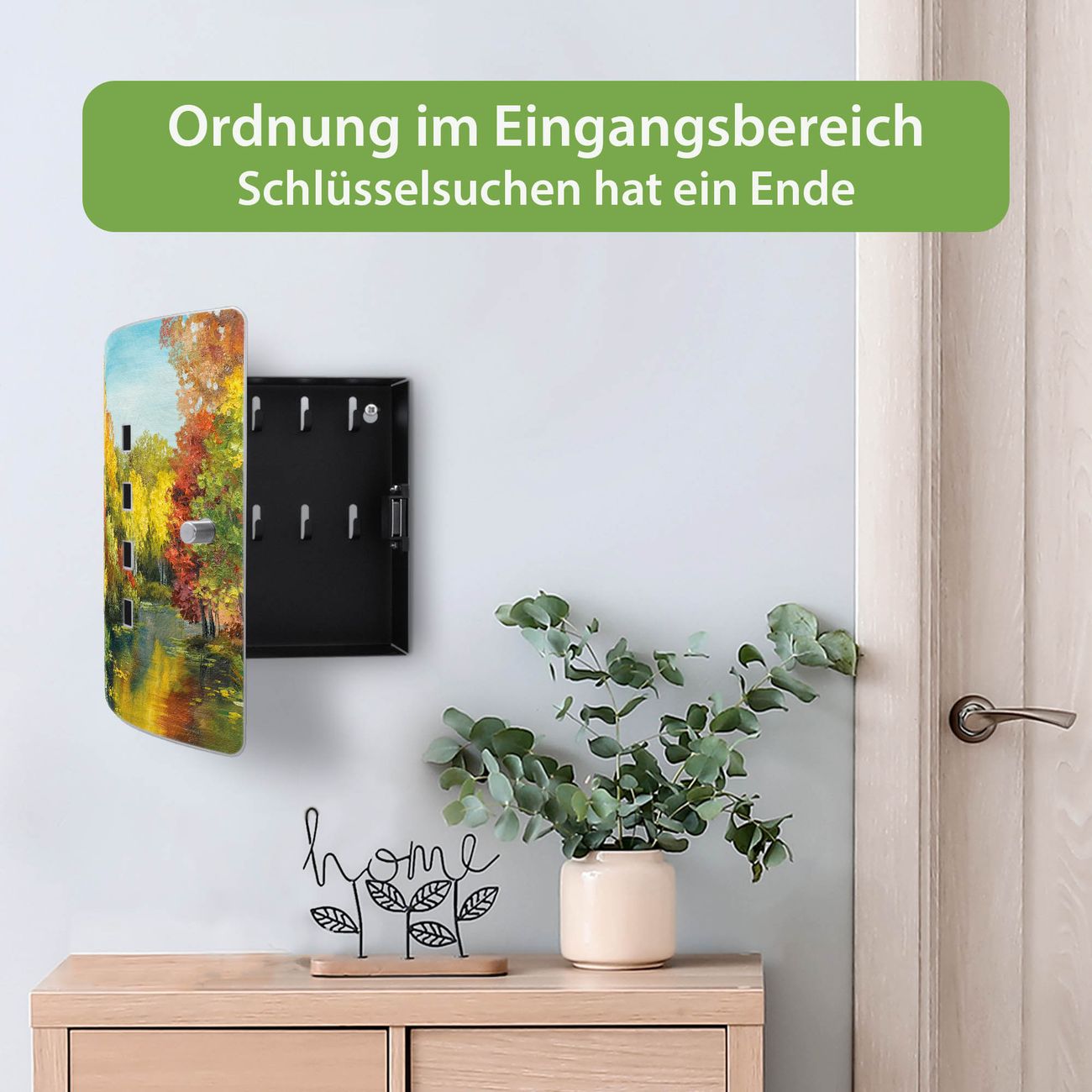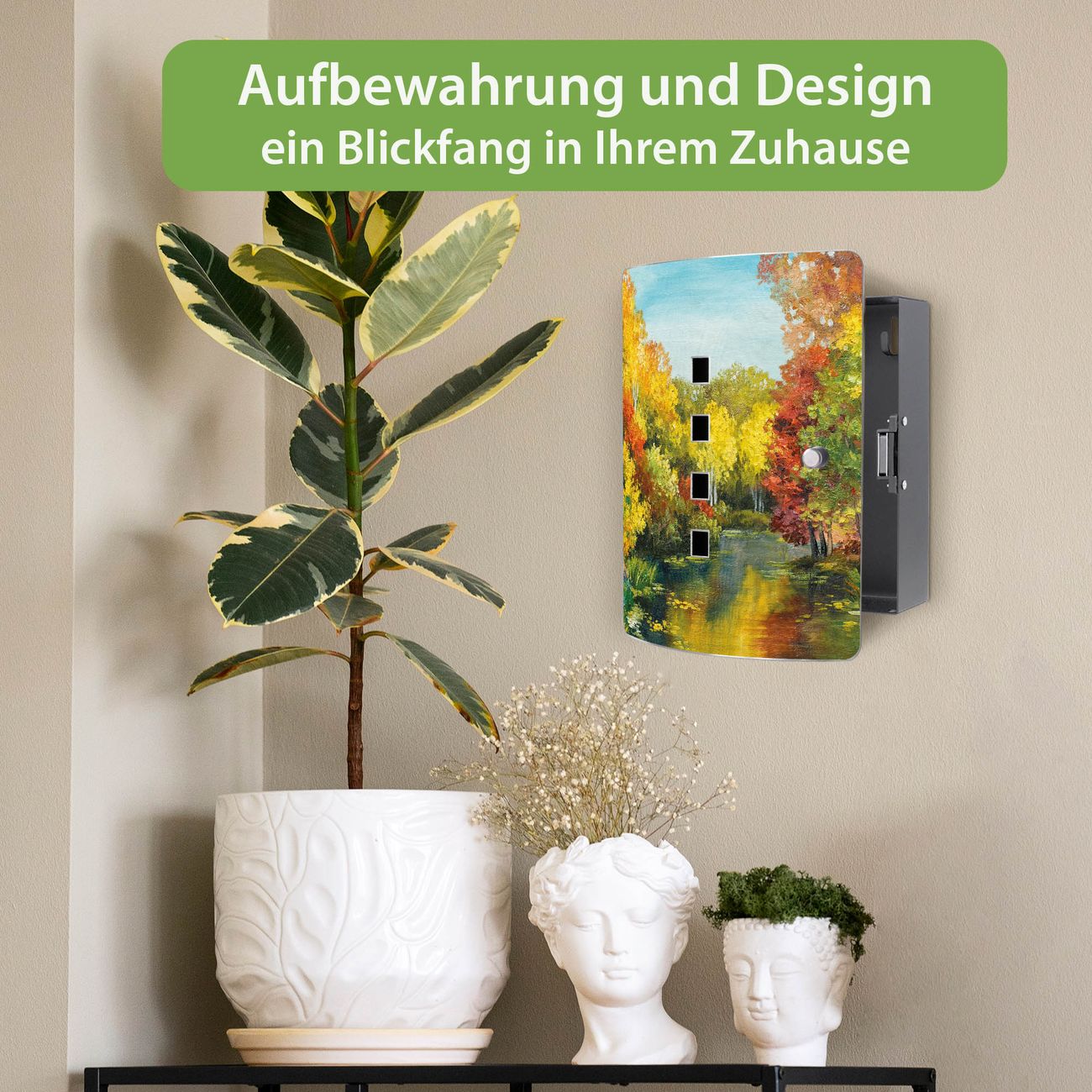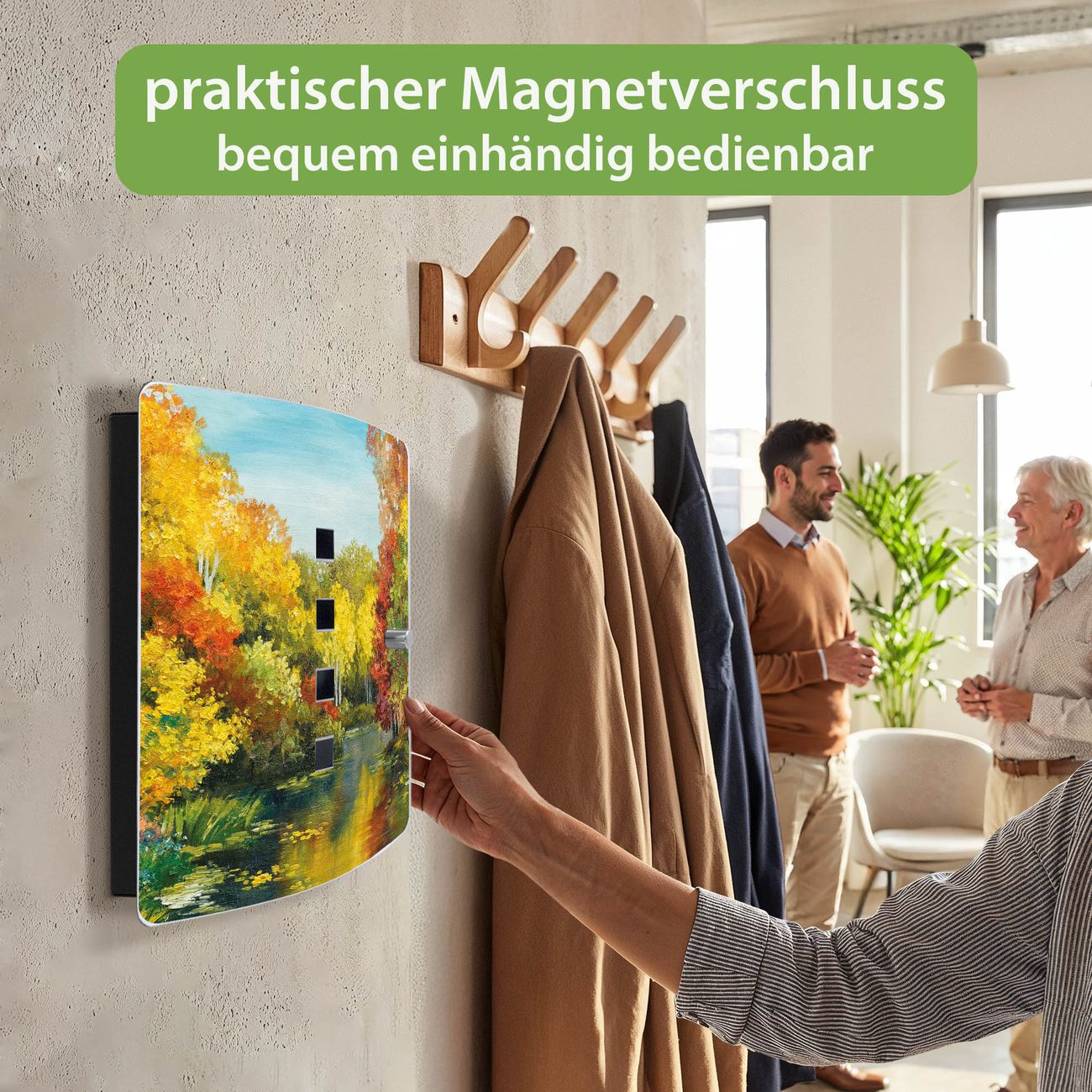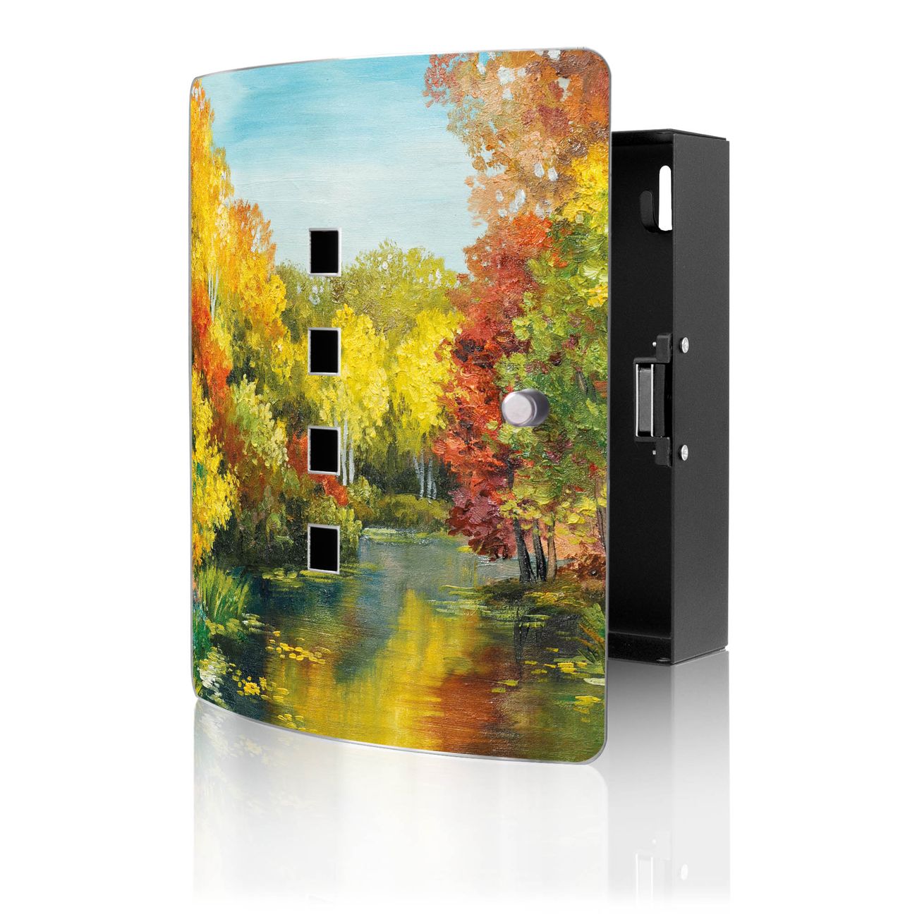 Funktion / Nutzen: Die leicht geschwungene Edelstahltür ist mit einer hochwertigen Motivfolie und dem Motiv Motiv Kanal Im Herbst kaschiert. Ein praktischer Magnetverschluss ermöglicht Ihnen ein schnelles Öffnen und Schließen. Befestigt wird der Schlüsselkasten an 2 Stellen auf der Rückseite, passendes Montagematerial fügen wir bereits bei.