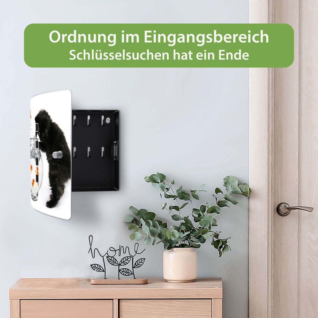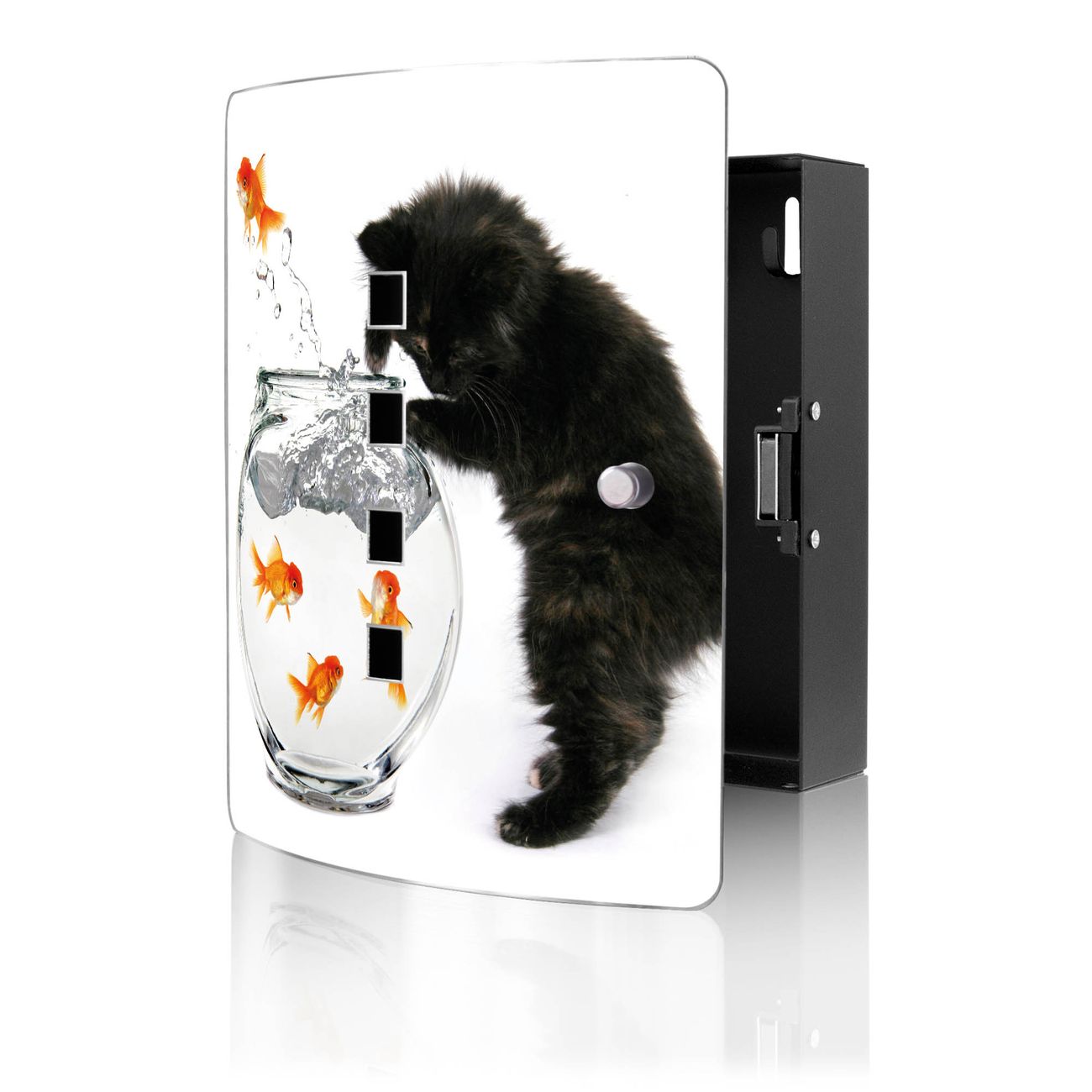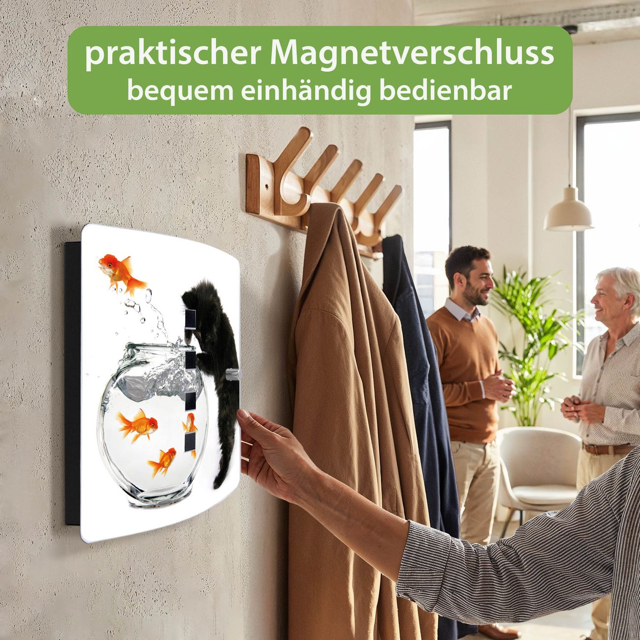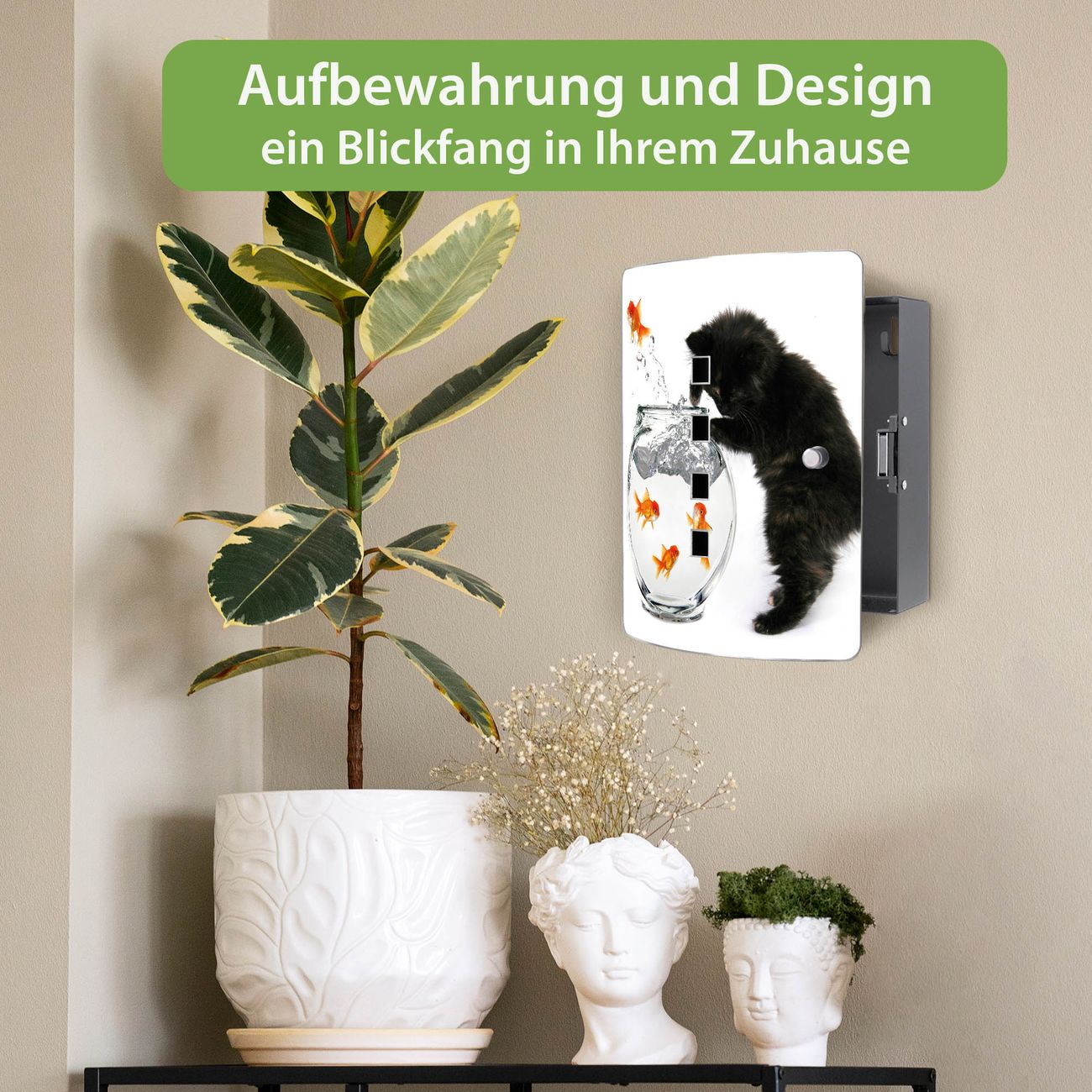 Funktion / Nutzen: Die leicht geschwungene Edelstahltür ist mit einer hochwertigen Motivfolie und dem Motiv Motiv Katze Und Fisch kaschiert. Ein praktischer Magnetverschluss ermöglicht Ihnen ein schnelles Öffnen und Schließen. Befestigt wird der Schlüsselkasten an 2 Stellen auf der Rückseite, passendes Montagematerial fügen wir bereits bei.