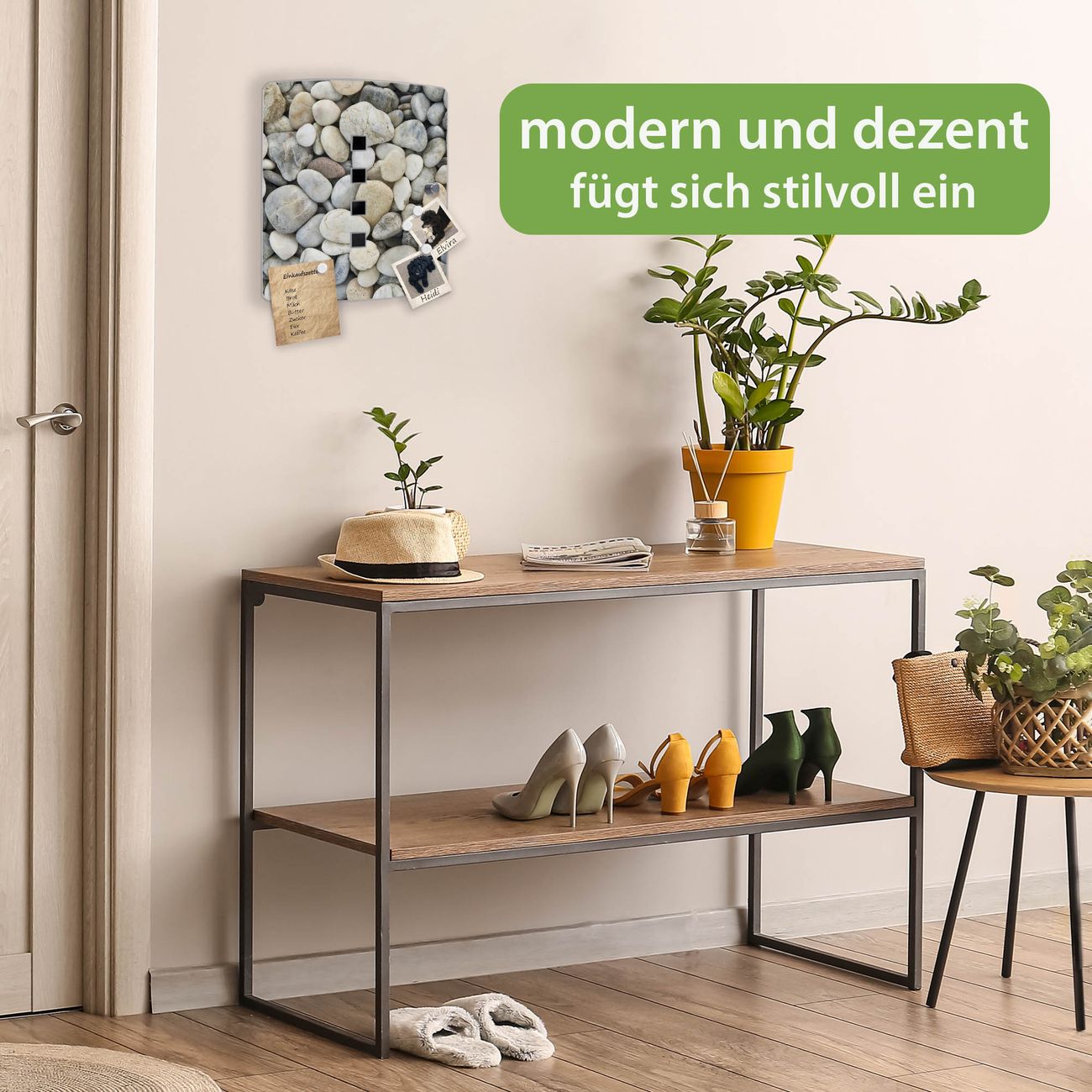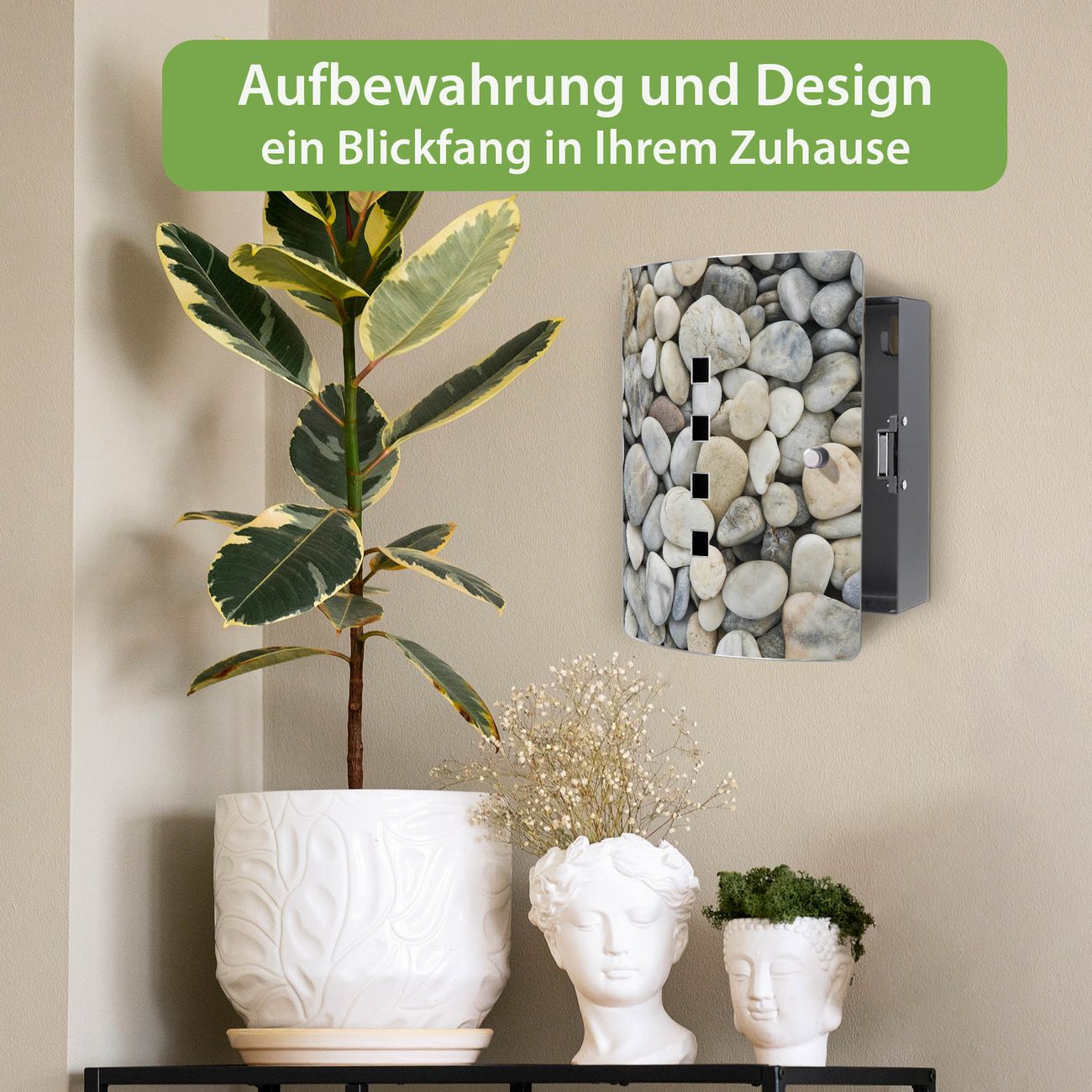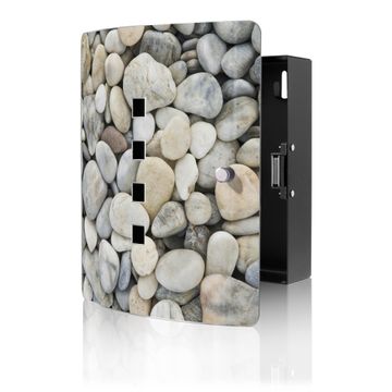 Funktion / Nutzen: Die leicht geschwungene Edelstahltür ist mit einer hochwertigen Motivfolie und dem Motiv Motiv Kieselsteine kaschiert. Ein praktischer Magnetverschluss ermöglicht Ihnen ein schnelles Öffnen und Schließen. Befestigt wird der Schlüsselkasten an 2 Stellen auf der Rückseite, passendes Montagematerial fügen wir bereits bei.