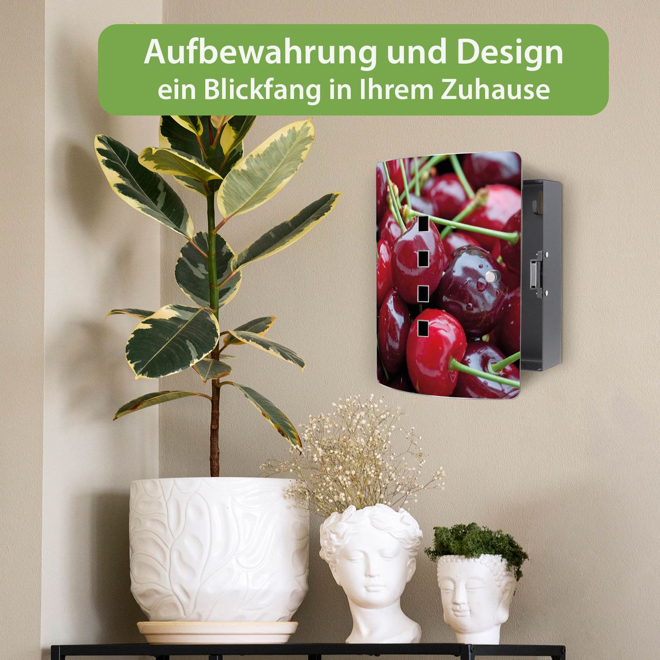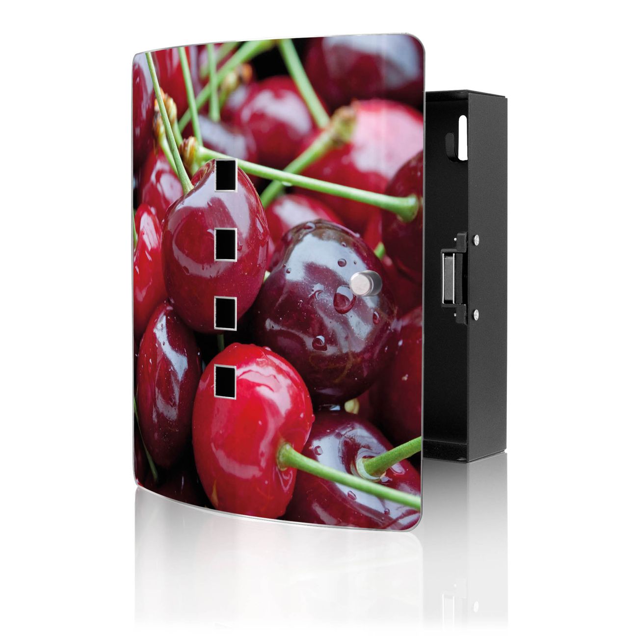 Funktion / Nutzen: Die leicht geschwungene Edelstahltür ist mit einer hochwertigen Motivfolie und dem Motiv Motiv Kirschen kaschiert. Ein praktischer Magnetverschluss ermöglicht Ihnen ein schnelles Öffnen und Schließen. Befestigt wird der Schlüsselkasten an 2 Stellen auf der Rückseite, passendes Montagematerial fügen wir bereits bei.