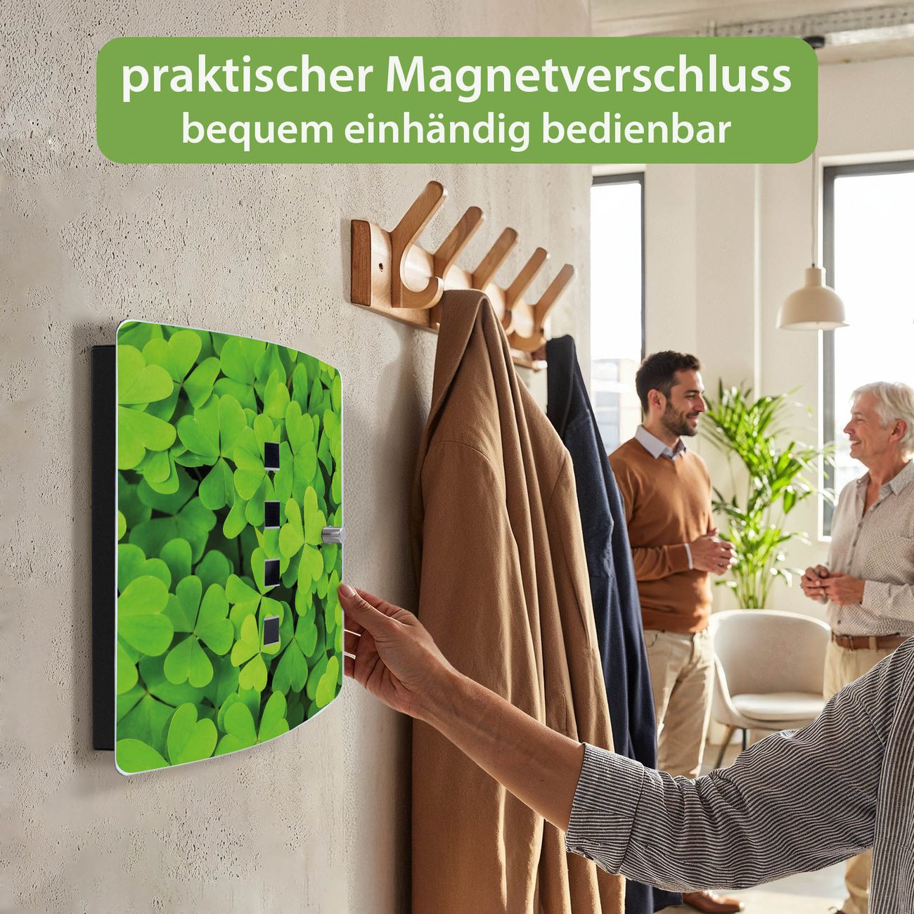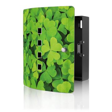 Funktion / Nutzen: Die leicht geschwungene Edelstahltür ist mit einer hochwertigen Motivfolie und dem Motiv Motiv Klee kaschiert. Ein praktischer Magnetverschluss ermöglicht Ihnen ein schnelles Öffnen und Schließen. Befestigt wird der Schlüsselkasten an 2 Stellen auf der Rückseite, passendes Montagematerial fügen wir bereits bei.