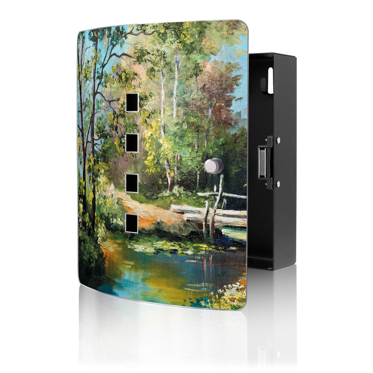 Funktion / Nutzen: Die leicht geschwungene Edelstahltür ist mit einer hochwertigen Motivfolie und dem Motiv Motiv Kleine Brücke kaschiert. Ein praktischer Magnetverschluss ermöglicht Ihnen ein schnelles Öffnen und Schließen. Befestigt wird der Schlüsselkasten an 2 Stellen auf der Rückseite, passendes Montagematerial fügen wir bereits bei.