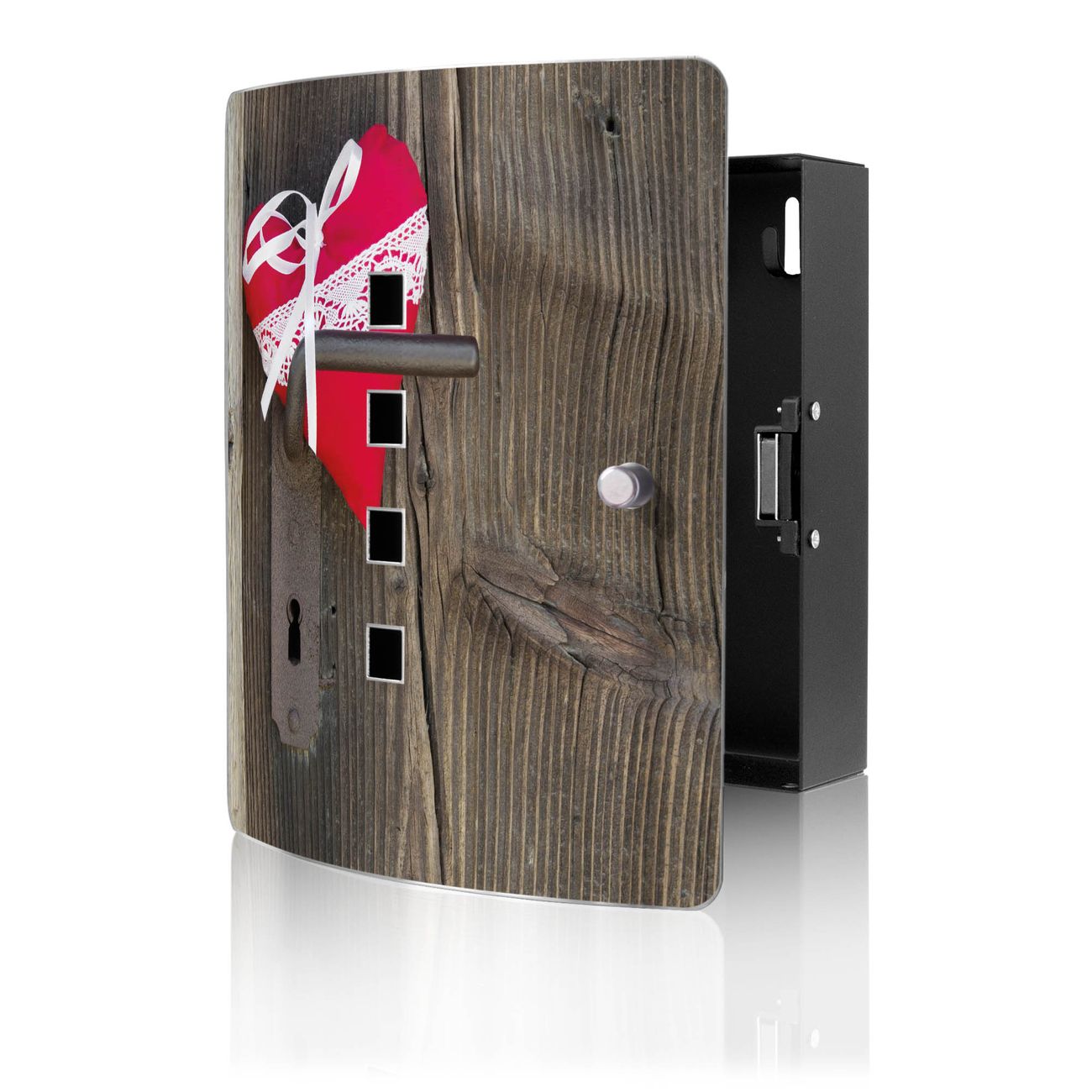 Funktion / Nutzen: Die leicht geschwungene Edelstahltür ist mit einer hochwertigen Motivfolie und dem Motiv Motiv Knock On Your Door kaschiert. Ein praktischer Magnetverschluss ermöglicht Ihnen ein schnelles Öffnen und Schließen. Befestigt wird der Schlüsselkasten an 2 Stellen auf der Rückseite, passendes Montagematerial fügen wir bereits bei.