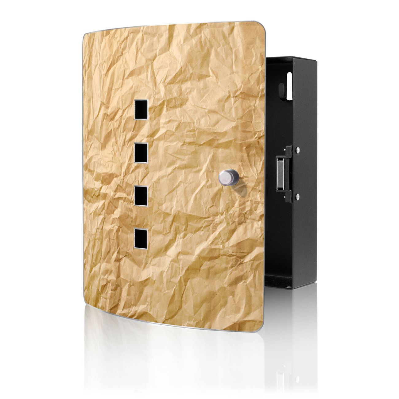 Funktion / Nutzen: Die leicht geschwungene Edelstahltür ist mit einer hochwertigen Motivfolie und dem Motiv Motiv Knüllpapier kaschiert. Ein praktischer Magnetverschluss ermöglicht Ihnen ein schnelles Öffnen und Schließen. Befestigt wird der Schlüsselkasten an 2 Stellen auf der Rückseite, passendes Montagematerial fügen wir bereits bei.