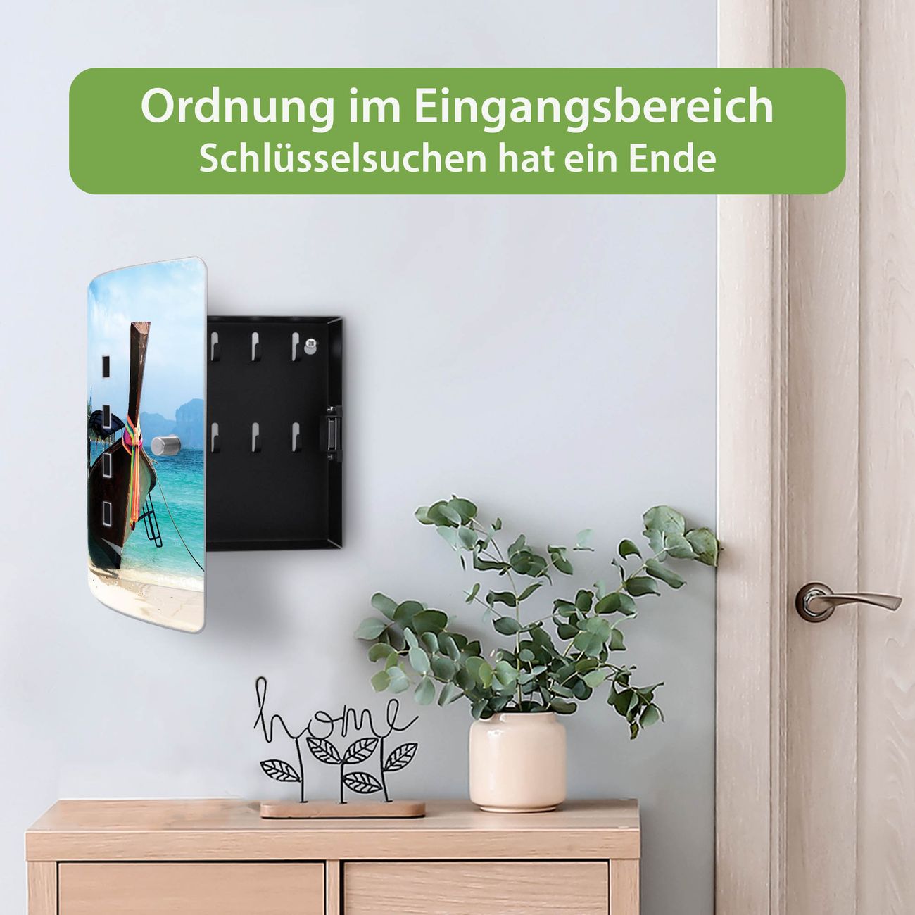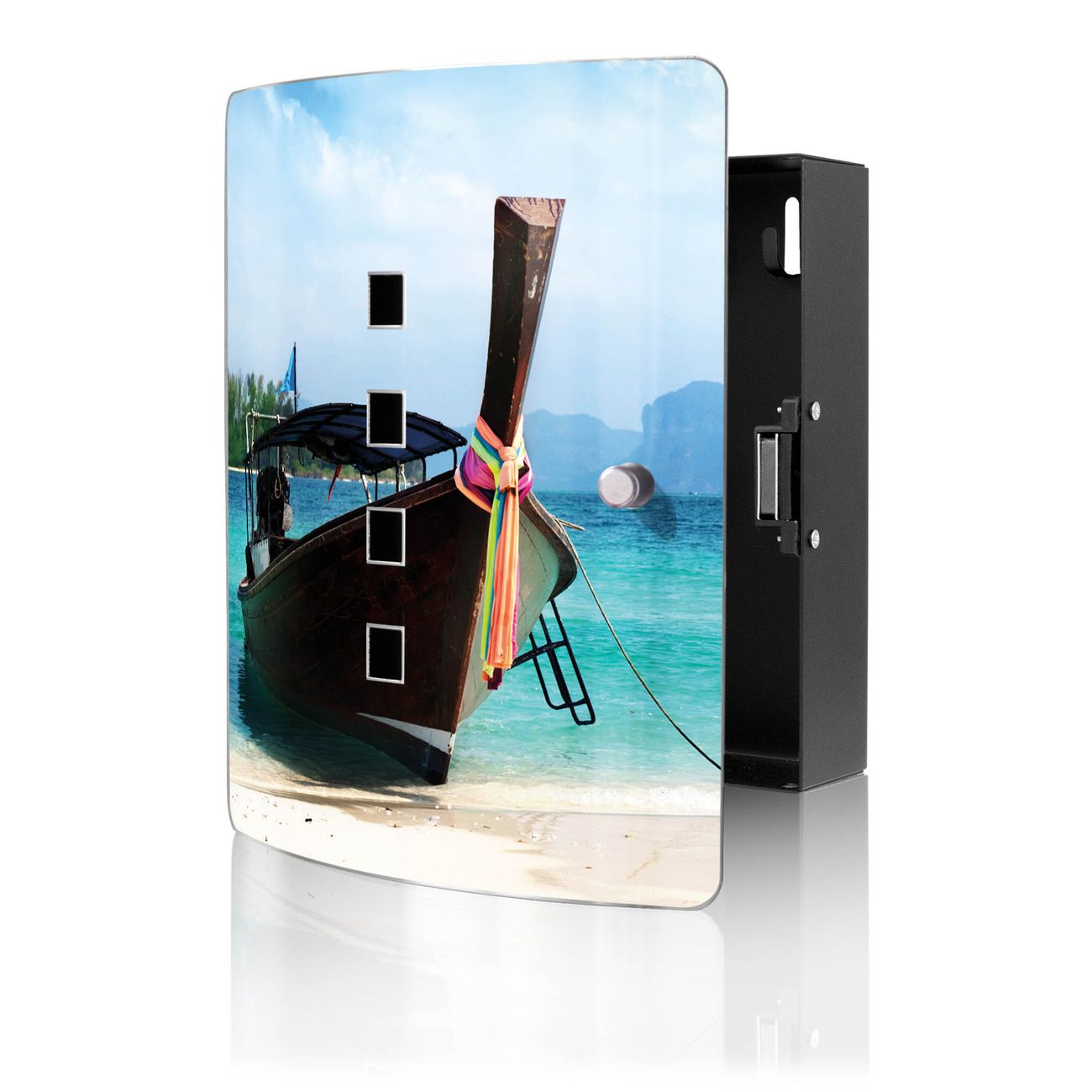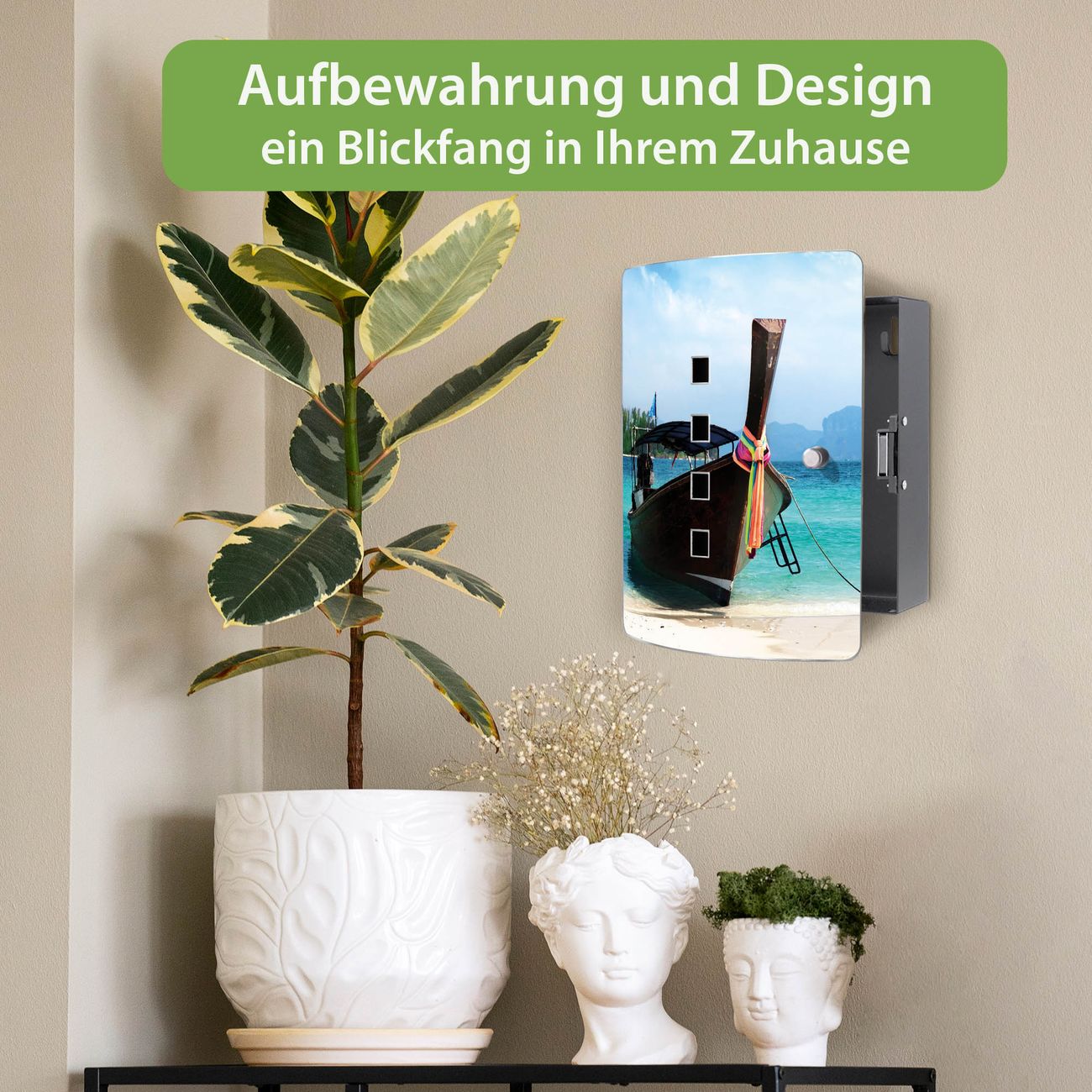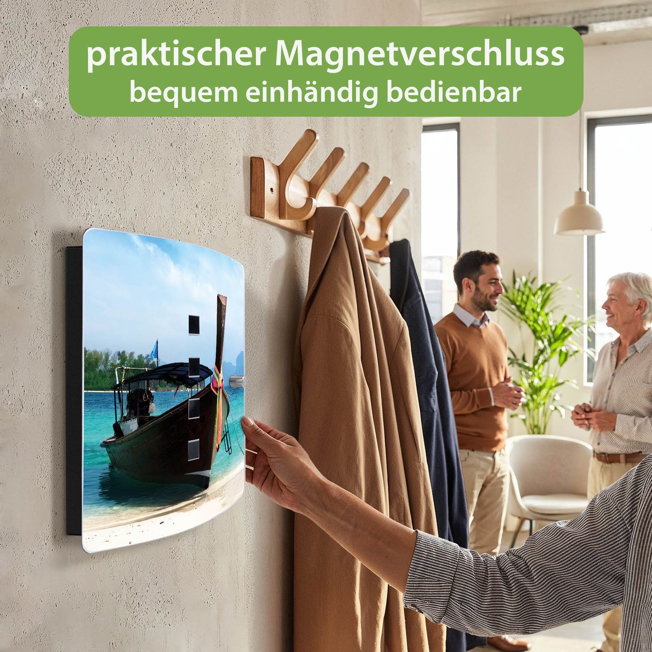 Funktion / Nutzen: Die leicht geschwungene Edelstahltür ist mit einer hochwertigen Motivfolie und dem Motiv Motiv Koh Poda kaschiert. Ein praktischer Magnetverschluss ermöglicht Ihnen ein schnelles Öffnen und Schließen. Befestigt wird der Schlüsselkasten an 2 Stellen auf der Rückseite, passendes Montagematerial fügen wir bereits bei.