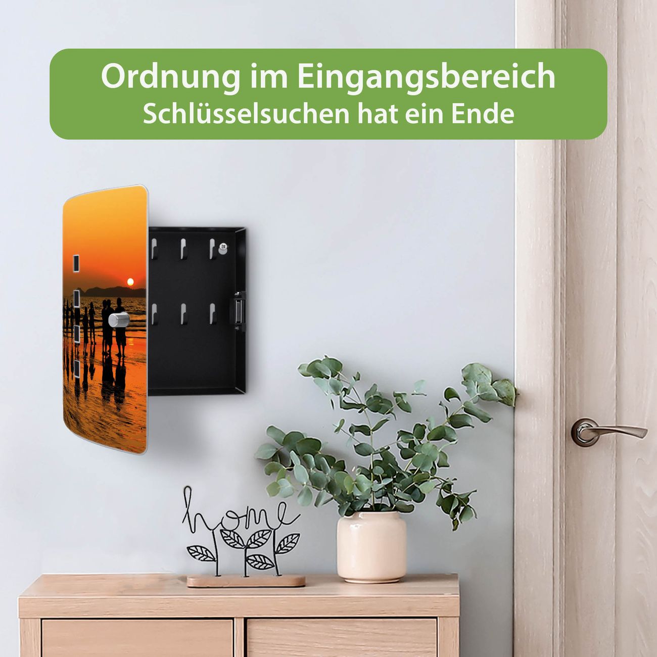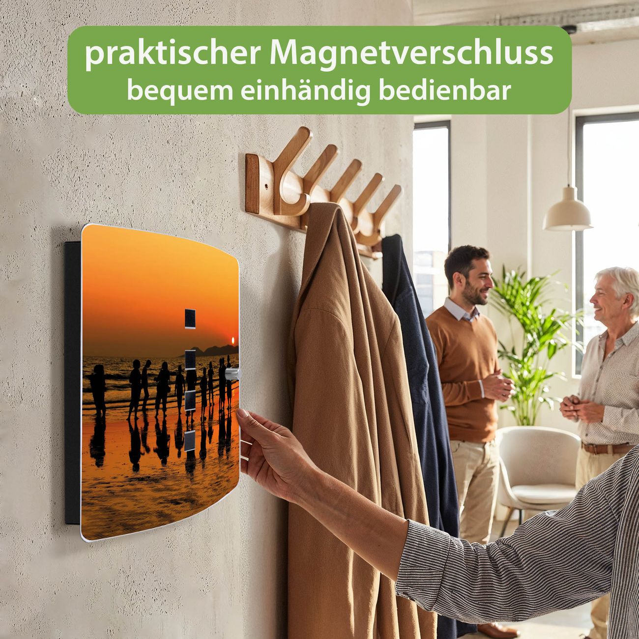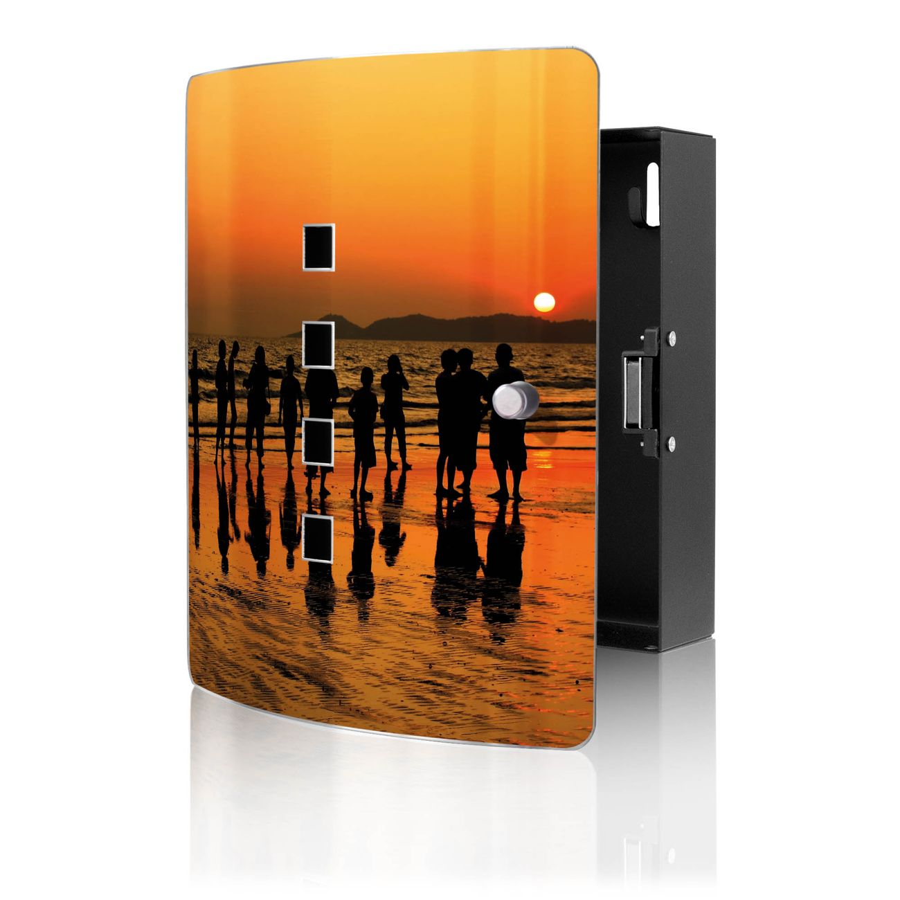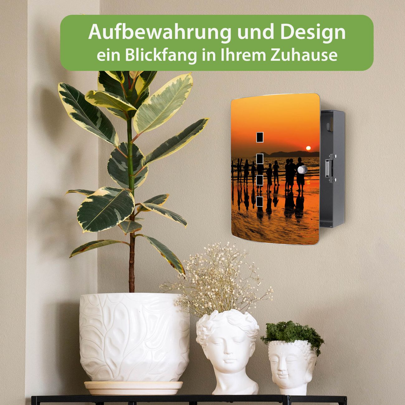Funktion / Nutzen: Die leicht geschwungene Edelstahltür ist mit einer hochwertigen Motivfolie und dem Motiv Motiv Koh Samet Beach kaschiert. Ein praktischer Magnetverschluss ermöglicht Ihnen ein schnelles Öffnen und Schließen. Befestigt wird der Schlüsselkasten an 2 Stellen auf der Rückseite, passendes Montagematerial fügen wir bereits bei.