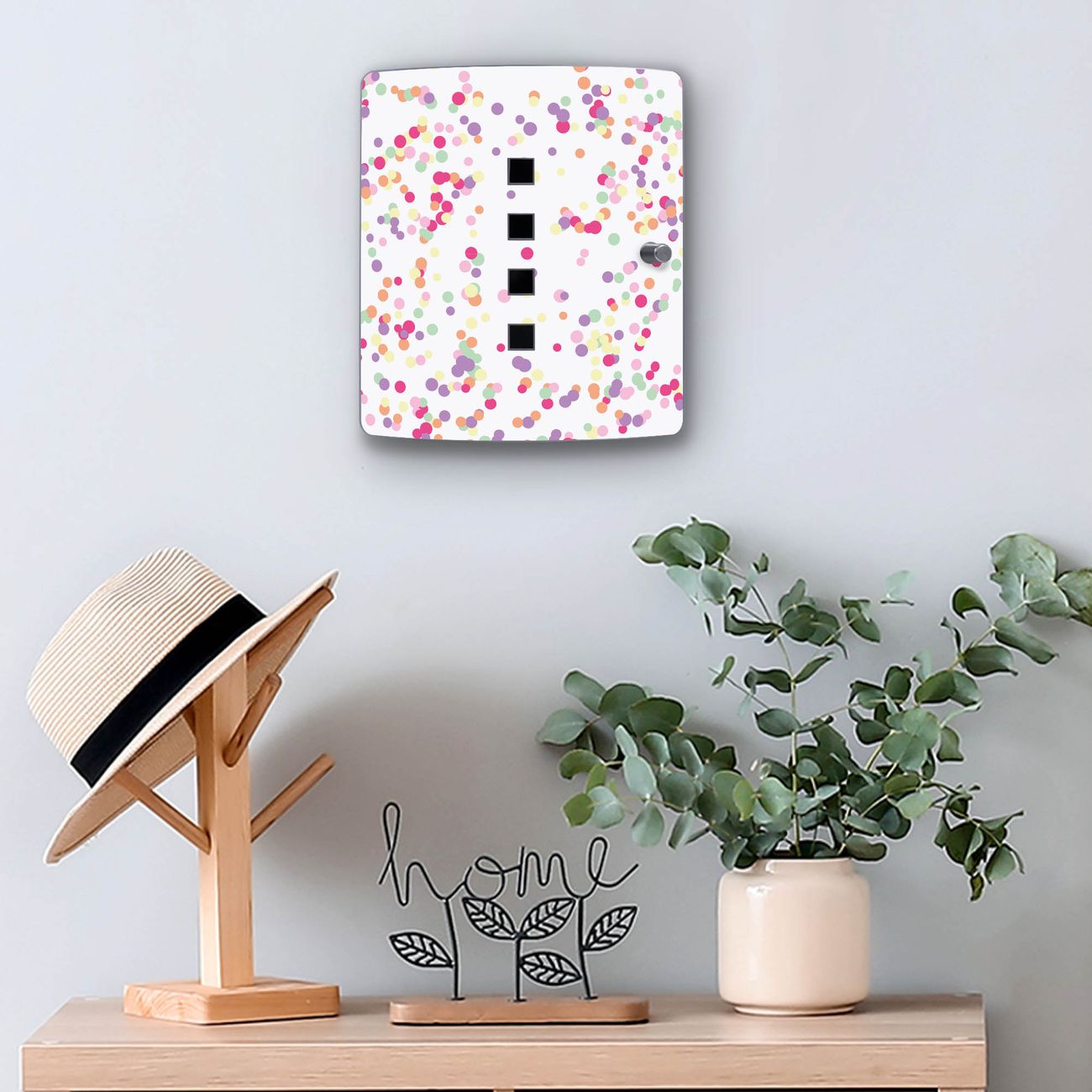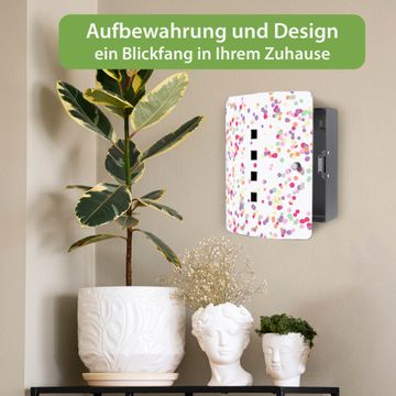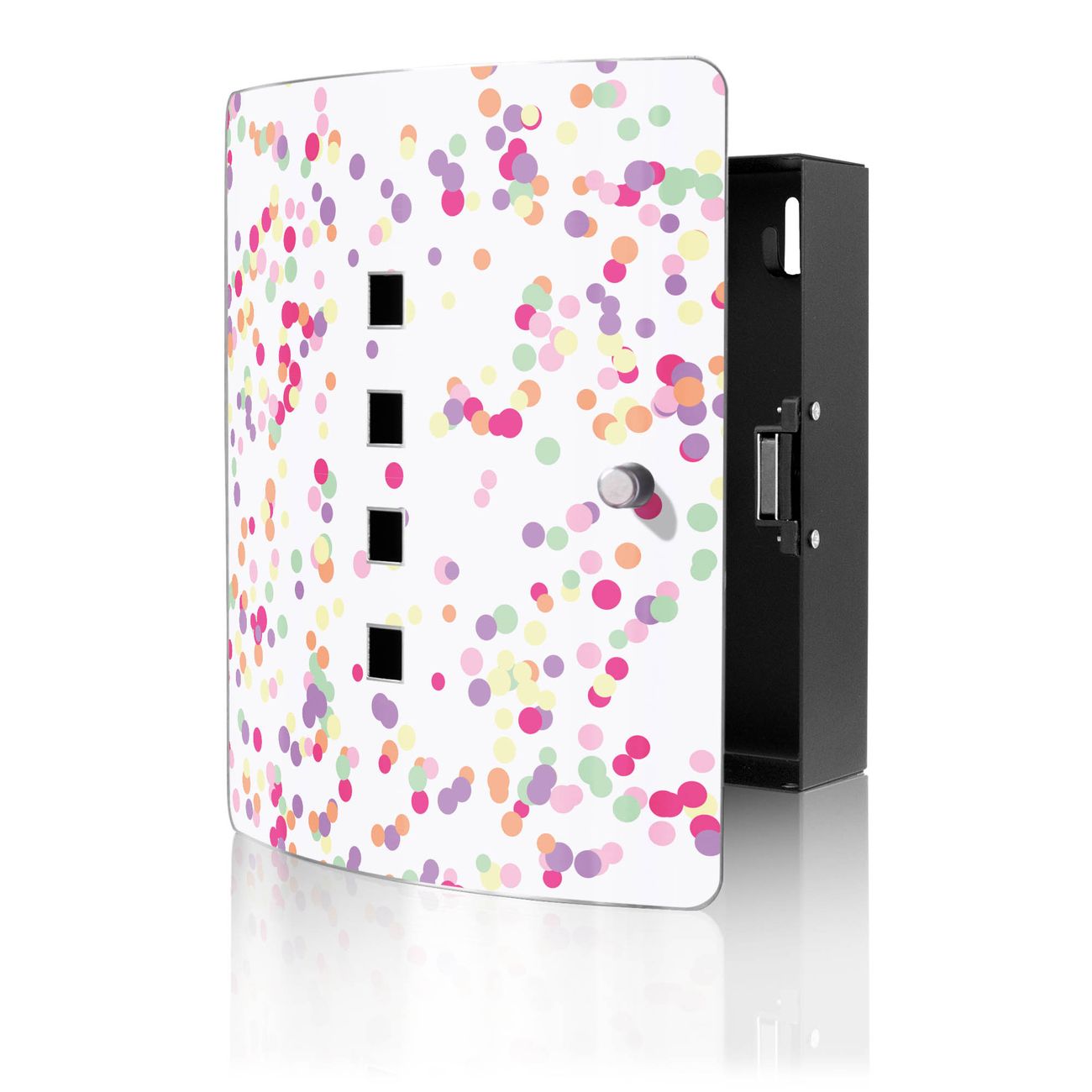 Funktion / Nutzen: Die leicht geschwungene Edelstahltür ist mit einer hochwertigen Motivfolie und dem Motiv Motiv Konfettiregen kaschiert. Ein praktischer Magnetverschluss ermöglicht Ihnen ein schnelles Öffnen und Schließen. Befestigt wird der Schlüsselkasten an 2 Stellen auf der Rückseite, passendes Montagematerial fügen wir bereits bei.