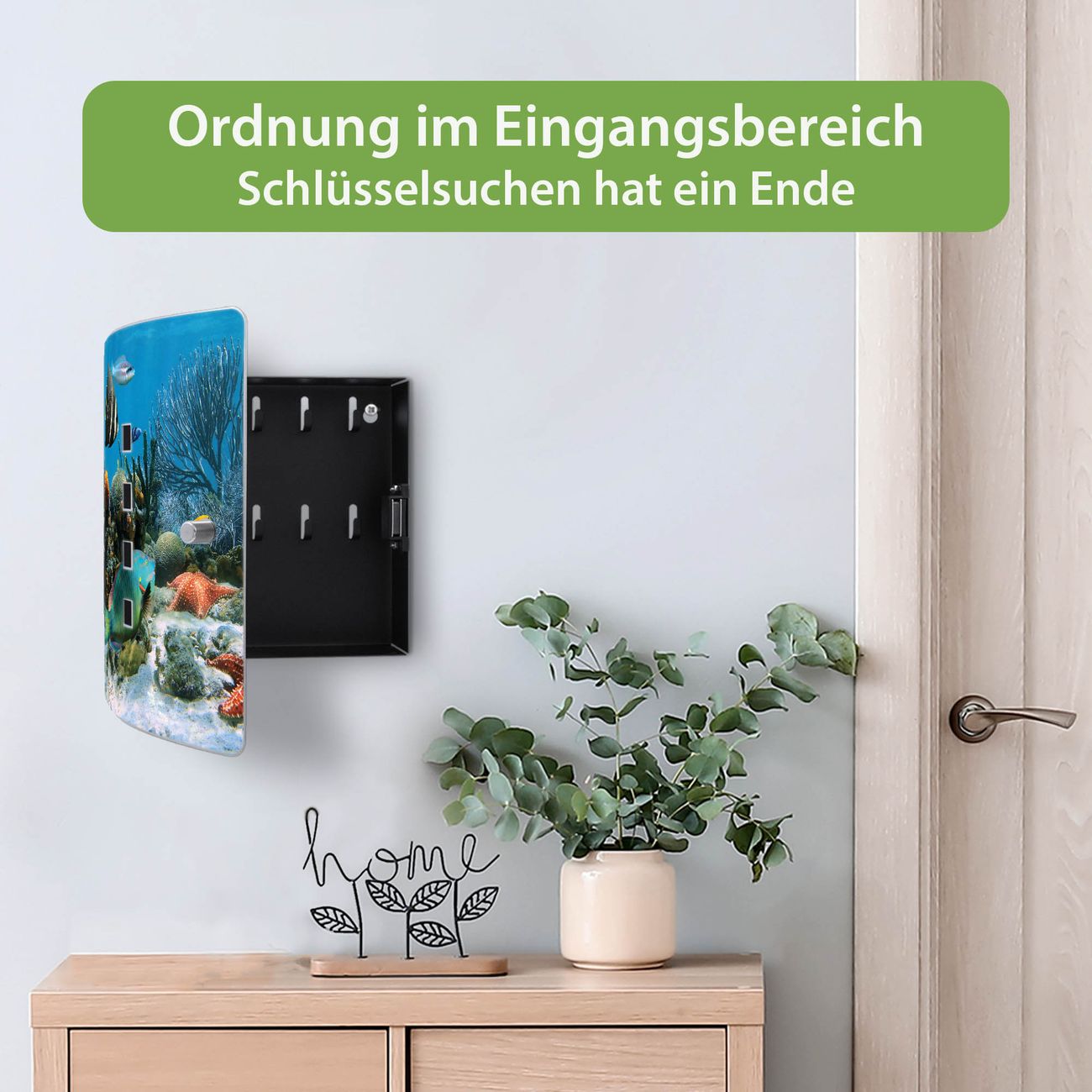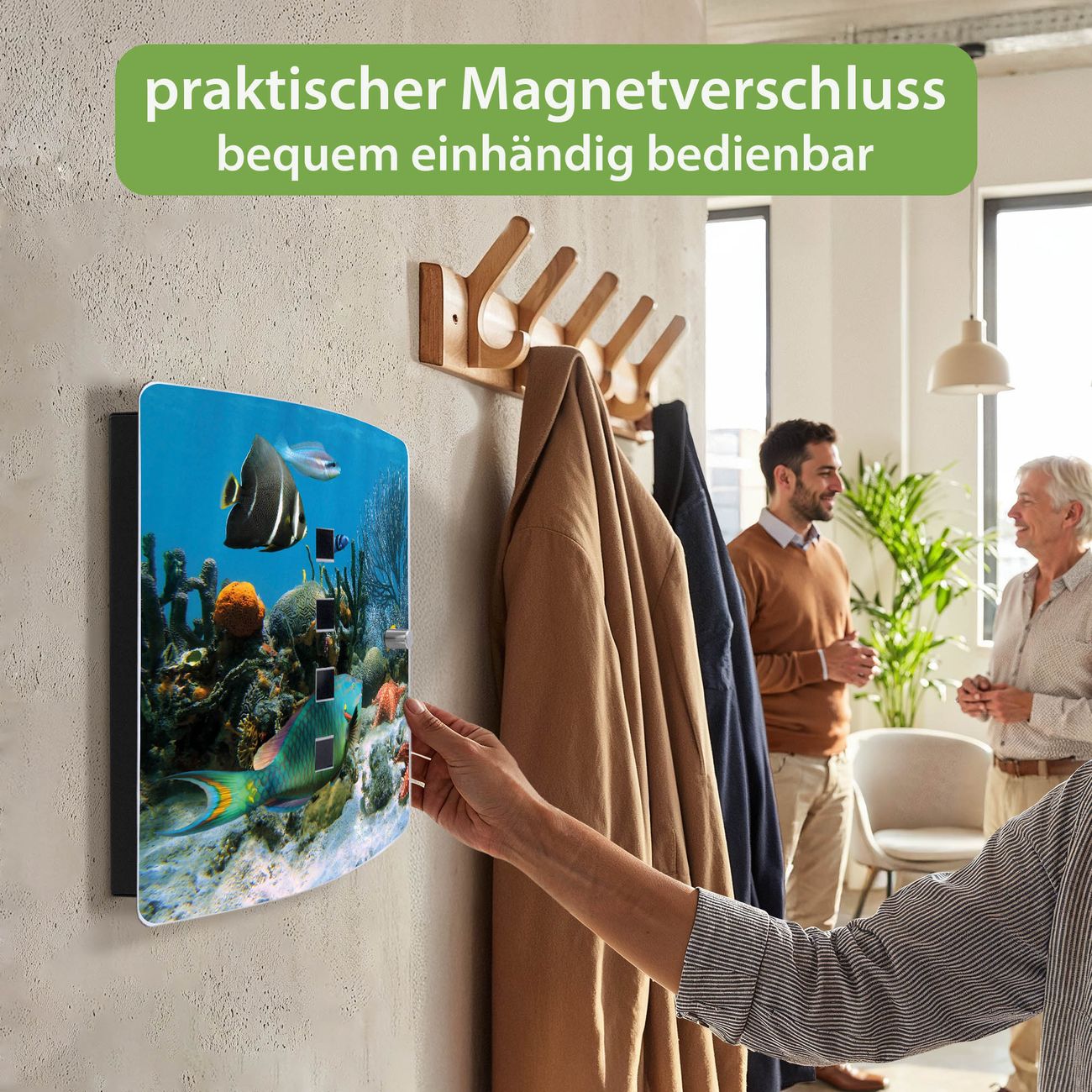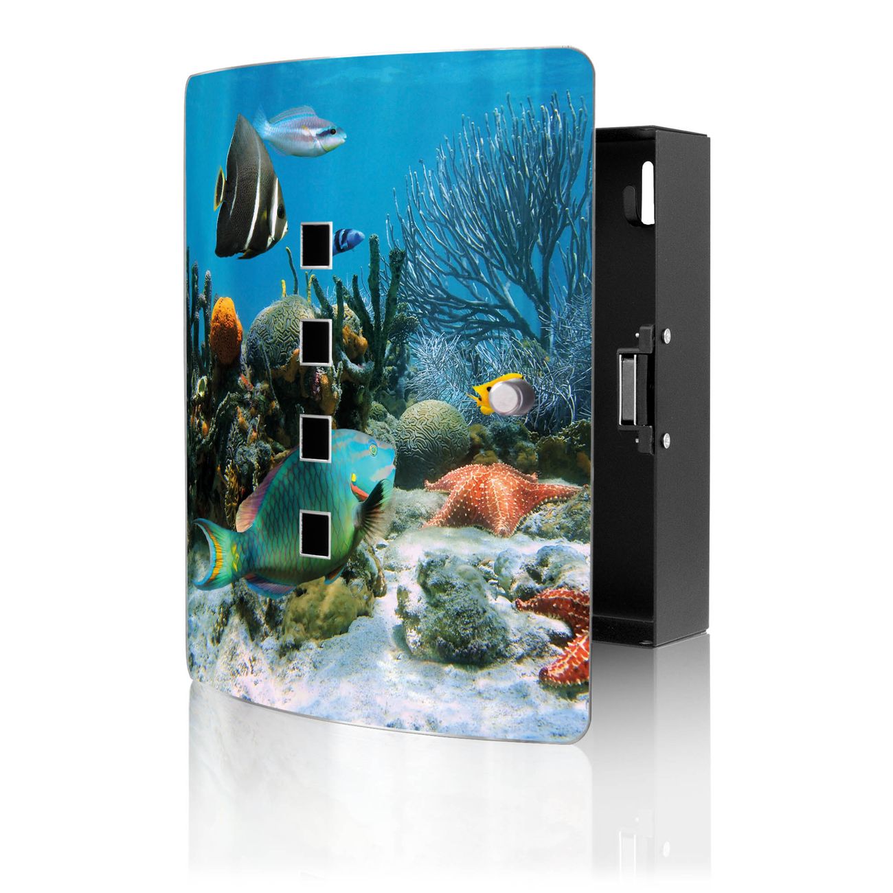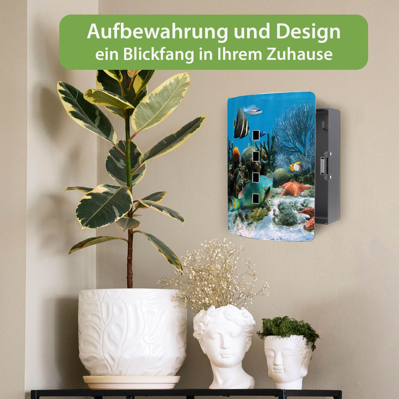 Funktion / Nutzen: Die leicht geschwungene Edelstahltür ist mit einer hochwertigen Motivfolie und dem Motiv Motiv Korallenriff 1 kaschiert. Ein praktischer Magnetverschluss ermöglicht Ihnen ein schnelles Öffnen und Schließen. Befestigt wird der Schlüsselkasten an 2 Stellen auf der Rückseite, passendes Montagematerial fügen wir bereits bei.