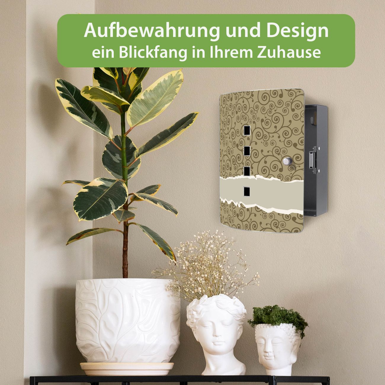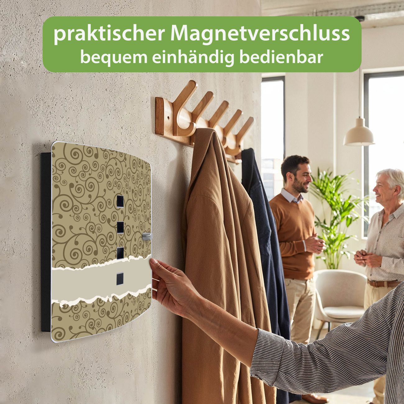 Funktion / Nutzen: Die leicht geschwungene Edelstahltür ist mit einer hochwertigen Motivfolie und dem Motiv Motiv Kringel kaschiert. Ein praktischer Magnetverschluss ermöglicht Ihnen ein schnelles Öffnen und Schließen. Befestigt wird der Schlüsselkasten an 2 Stellen auf der Rückseite, passendes Montagematerial fügen wir bereits bei.