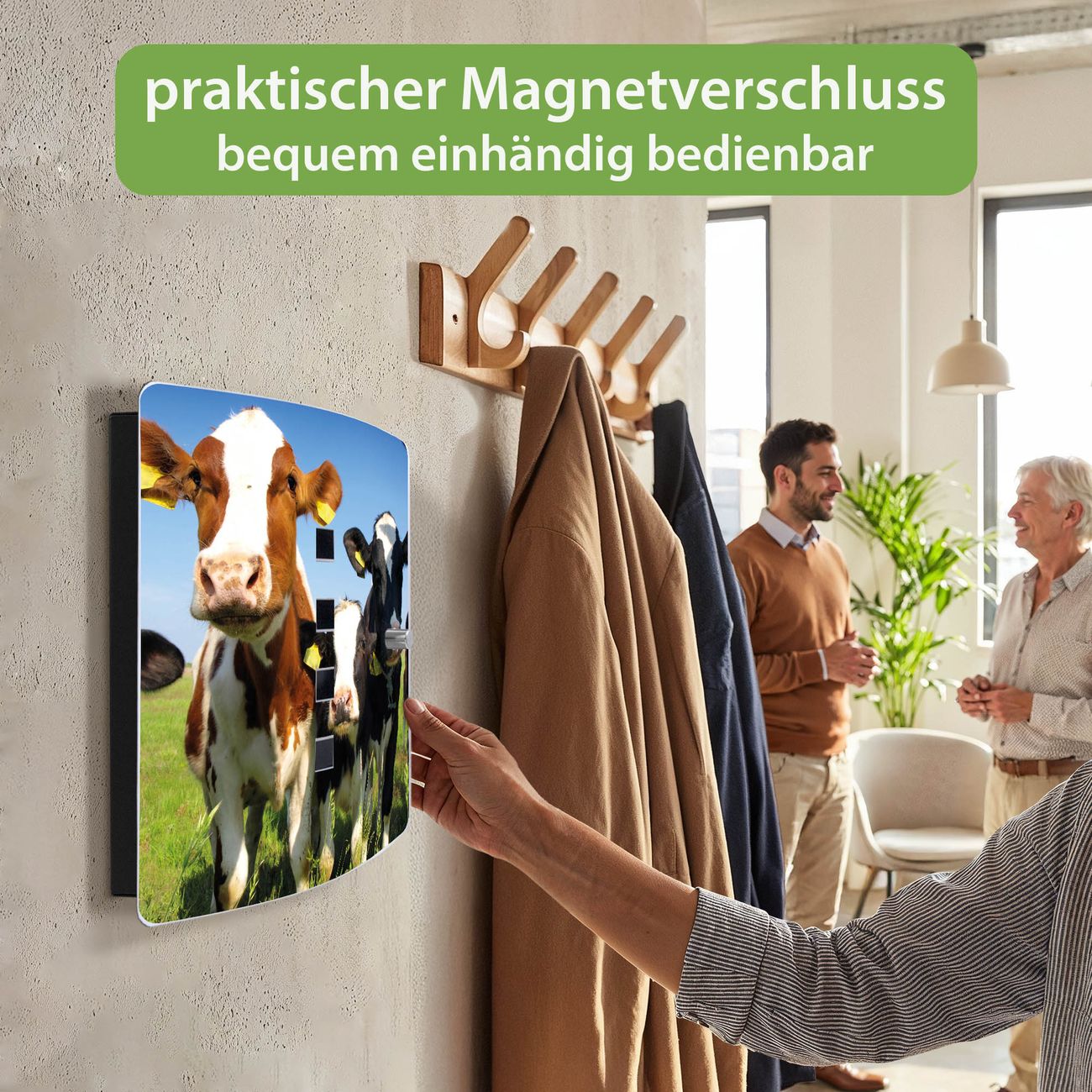 Funktion / Nutzen: Die leicht geschwungene Edelstahltür ist mit einer hochwertigen Motivfolie und dem Motiv Motiv Kühe kaschiert. Ein praktischer Magnetverschluss ermöglicht Ihnen ein schnelles Öffnen und Schließen. Befestigt wird der Schlüsselkasten an 2 Stellen auf der Rückseite, passendes Montagematerial fügen wir bereits bei.