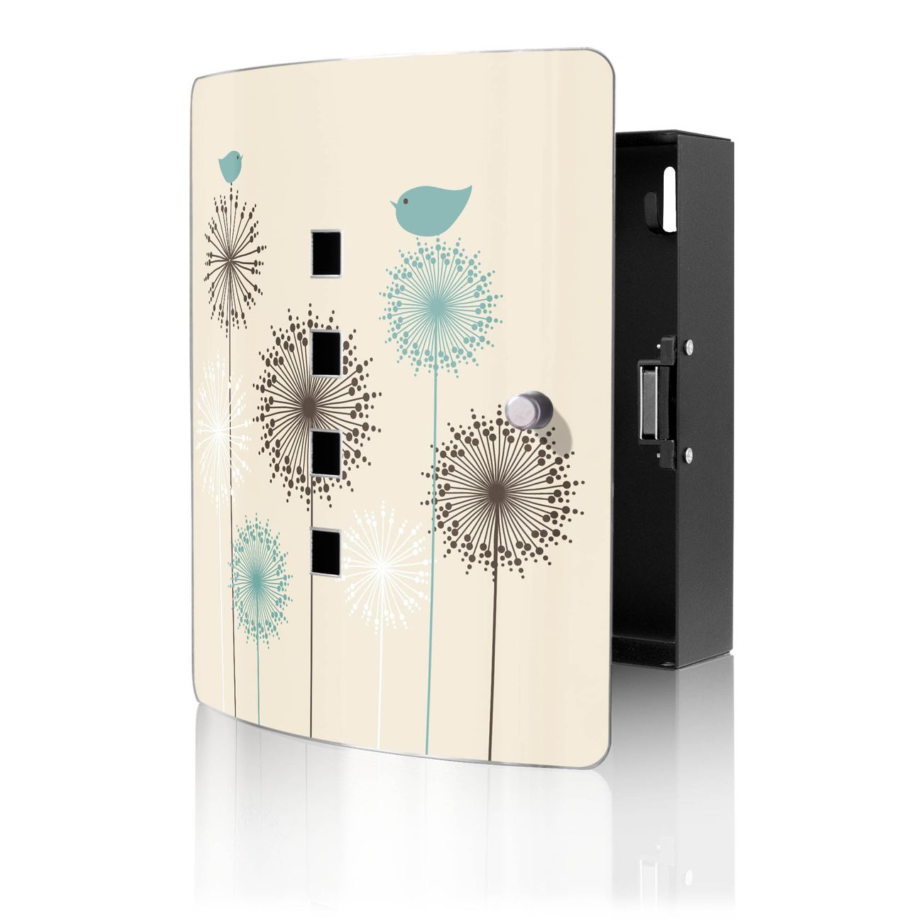 Funktion / Nutzen: Die leicht geschwungene Edelstahltür ist mit einer hochwertigen Motivfolie und dem Motiv Motiv Kugelfontänen kaschiert. Ein praktischer Magnetverschluss ermöglicht Ihnen ein schnelles Öffnen und Schließen. Befestigt wird der Schlüsselkasten an 2 Stellen auf der Rückseite, passendes Montagematerial fügen wir bereits bei.