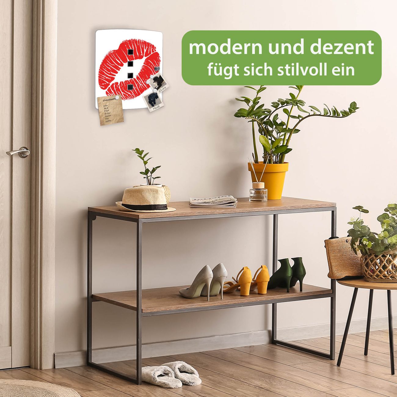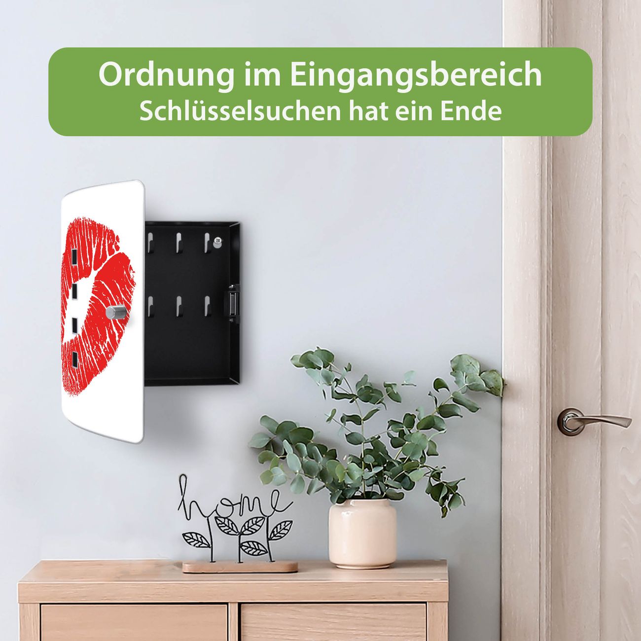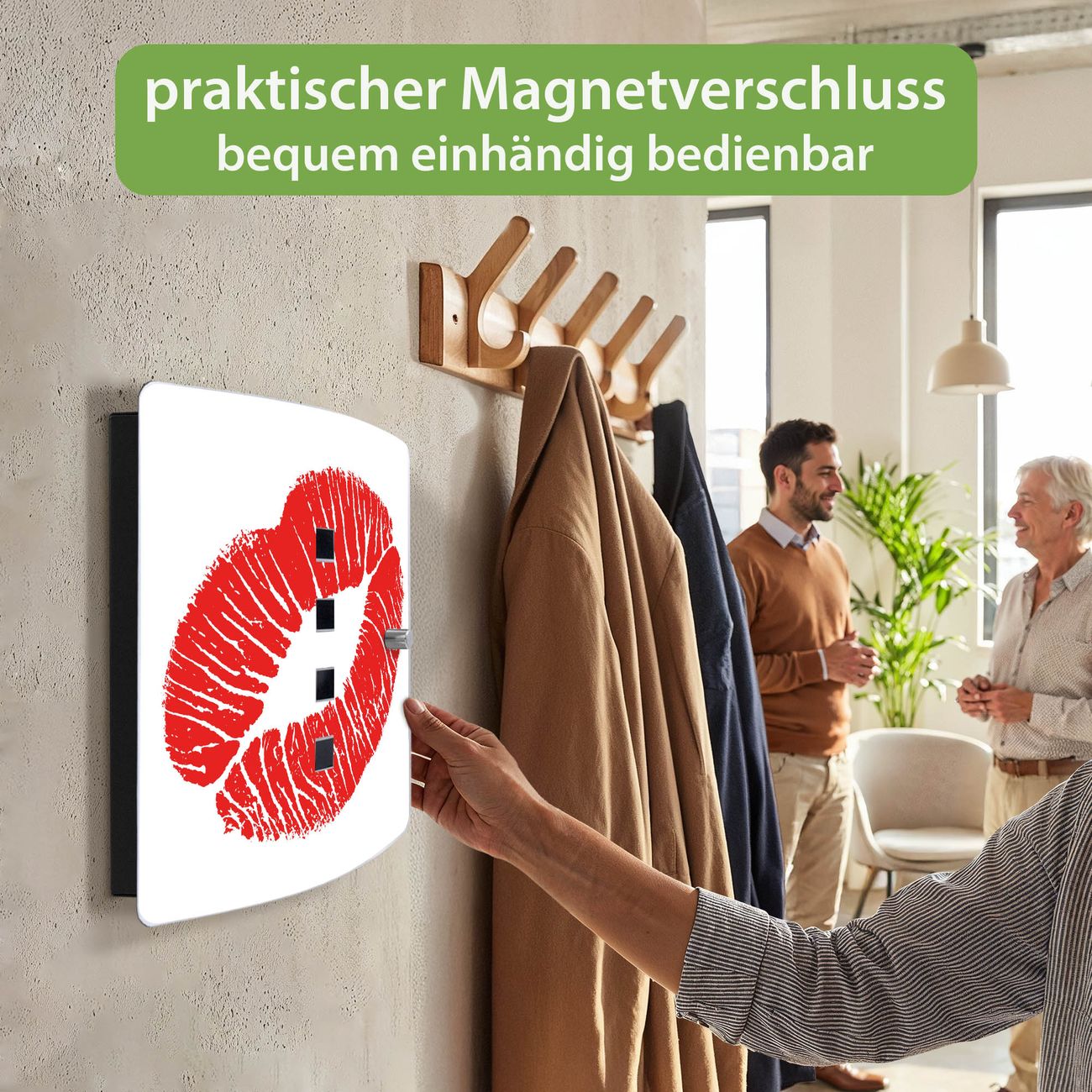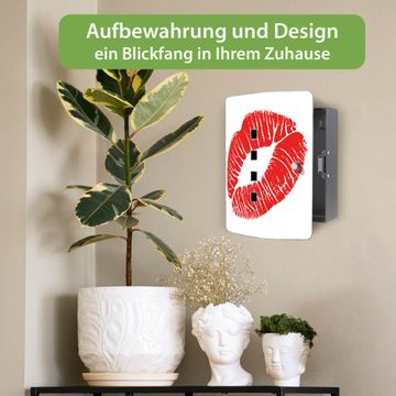 Funktion / Nutzen: Die leicht geschwungene Edelstahltür ist mit einer hochwertigen Motivfolie und dem Motiv Motiv Kussmund kaschiert. Ein praktischer Magnetverschluss ermöglicht Ihnen ein schnelles Öffnen und Schließen. Befestigt wird der Schlüsselkasten an 2 Stellen auf der Rückseite, passendes Montagematerial fügen wir bereits bei.