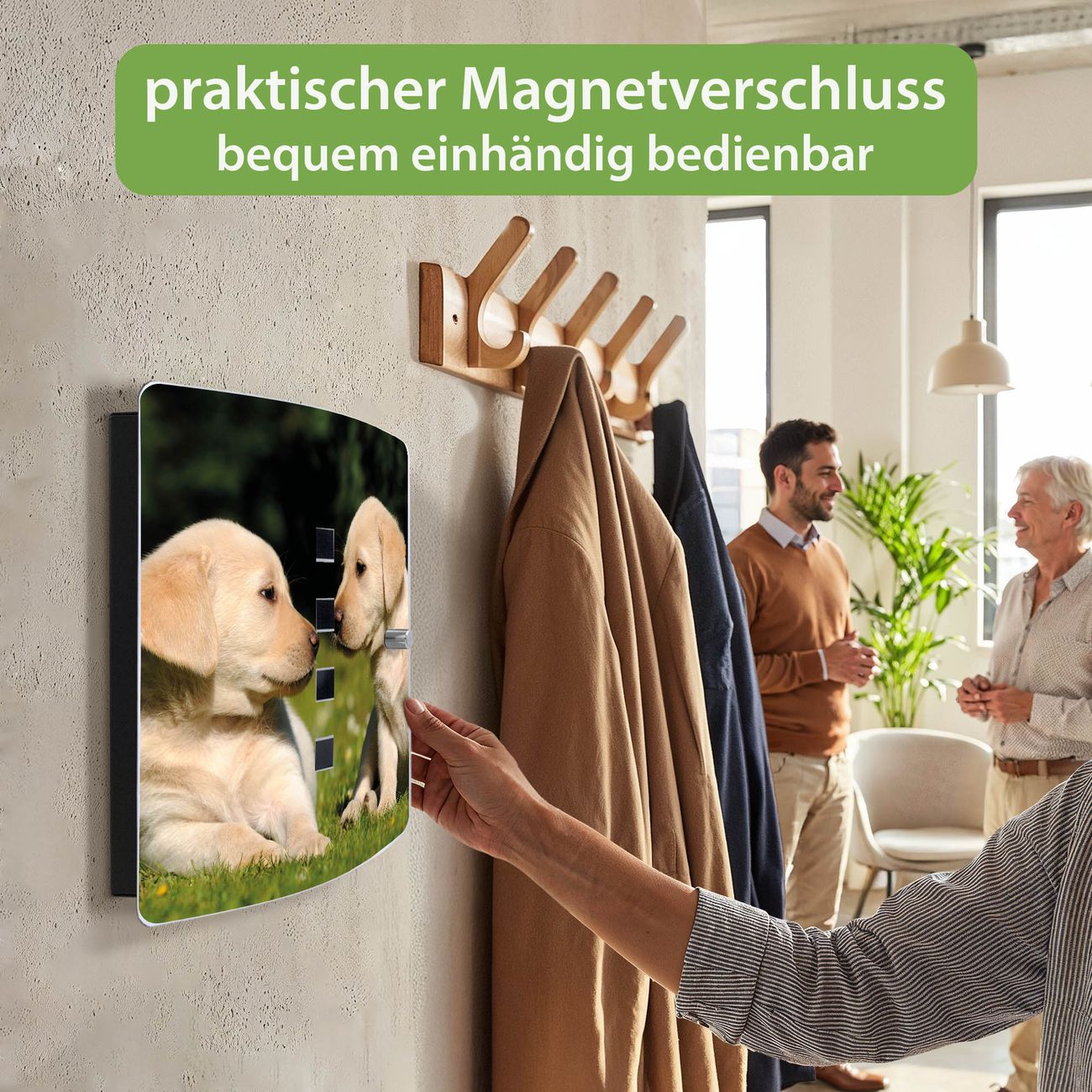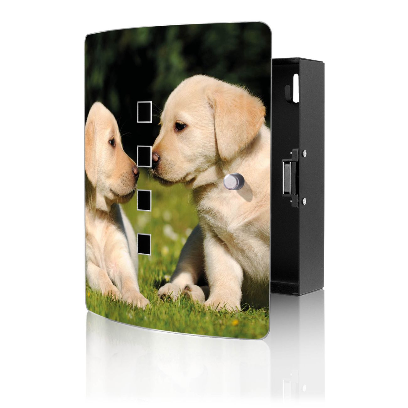 Funktion / Nutzen: Die leicht geschwungene Edelstahltür ist mit einer hochwertigen Motivfolie und dem Motiv Motiv Labrador kaschiert. Ein praktischer Magnetverschluss ermöglicht Ihnen ein schnelles Öffnen und Schließen. Befestigt wird der Schlüsselkasten an 2 Stellen auf der Rückseite, passendes Montagematerial fügen wir bereits bei.