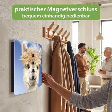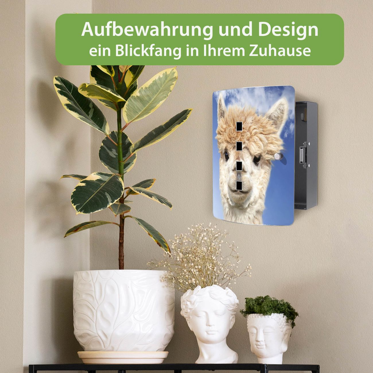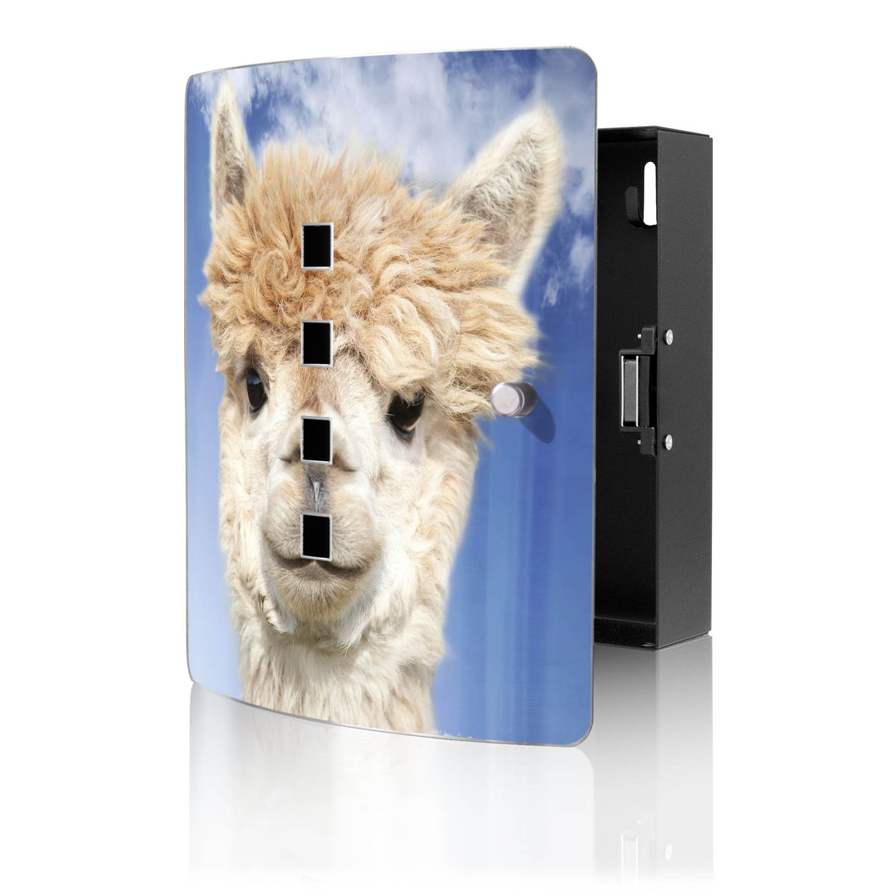 Funktion / Nutzen: Die leicht geschwungene Edelstahltür ist mit einer hochwertigen Motivfolie und dem Motiv Motiv Lama kaschiert. Ein praktischer Magnetverschluss ermöglicht Ihnen ein schnelles Öffnen und Schließen. Befestigt wird der Schlüsselkasten an 2 Stellen auf der Rückseite, passendes Montagematerial fügen wir bereits bei.