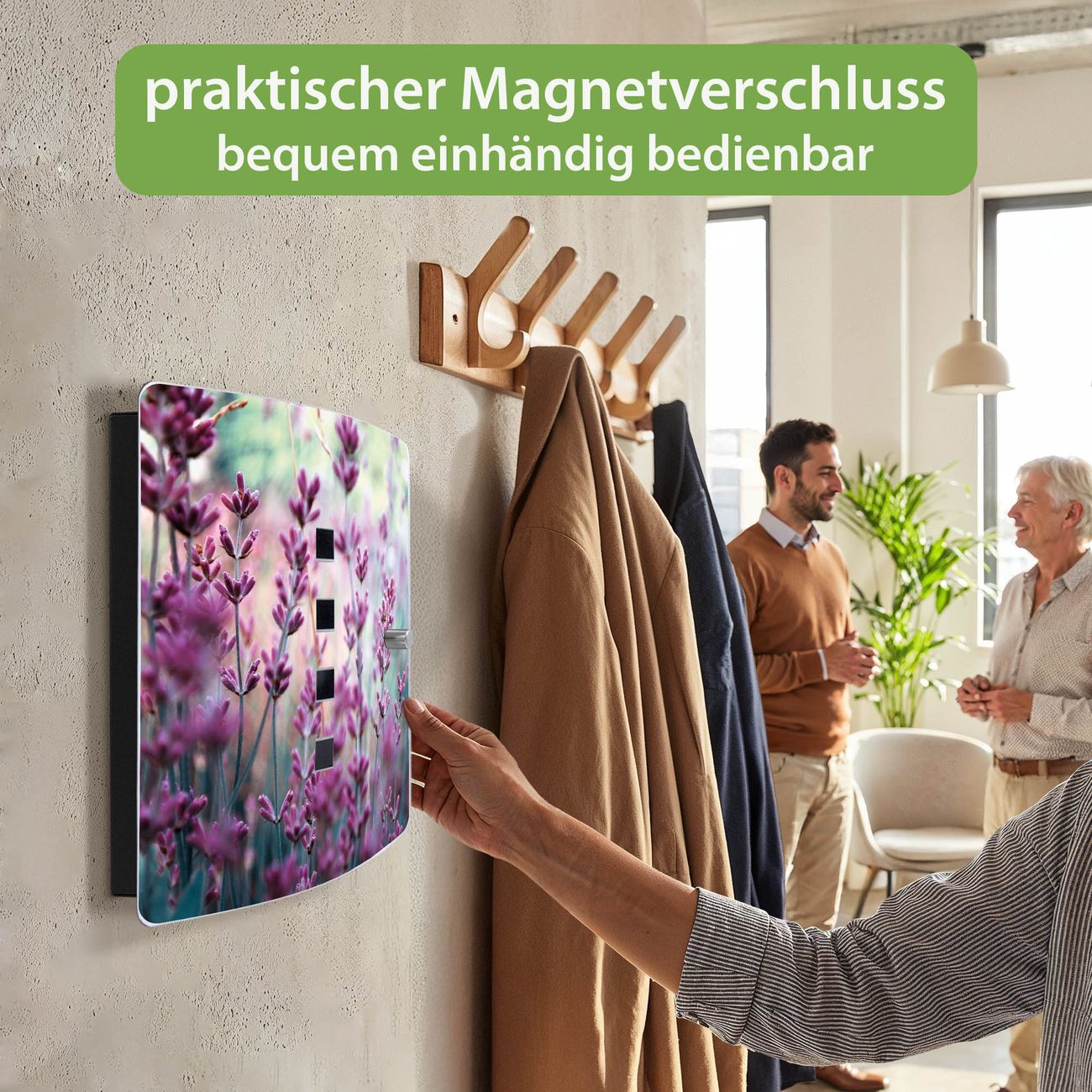 Funktion / Nutzen: Die leicht geschwungene Edelstahltür ist mit einer hochwertigen Motivfolie und dem Motiv Motiv Lavendel 2 kaschiert. Ein praktischer Magnetverschluss ermöglicht Ihnen ein schnelles Öffnen und Schließen. Befestigt wird der Schlüsselkasten an 2 Stellen auf der Rückseite, passendes Montagematerial fügen wir bereits bei.