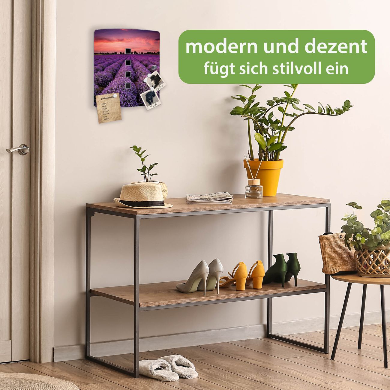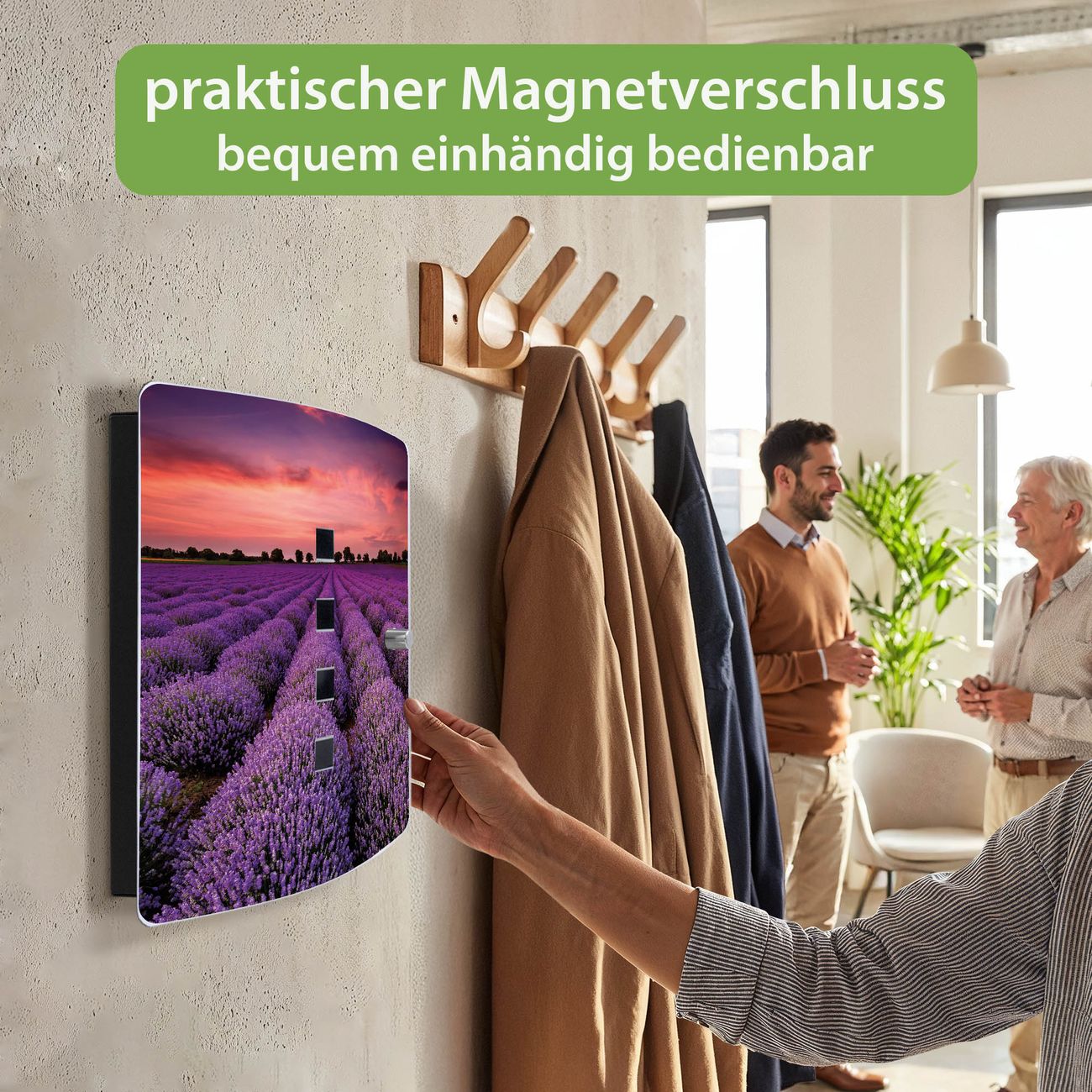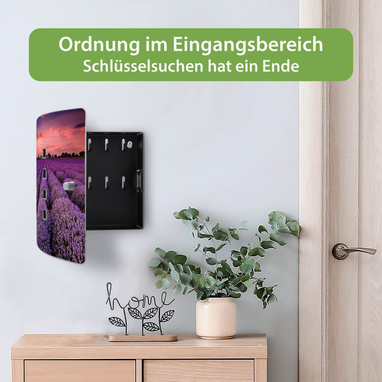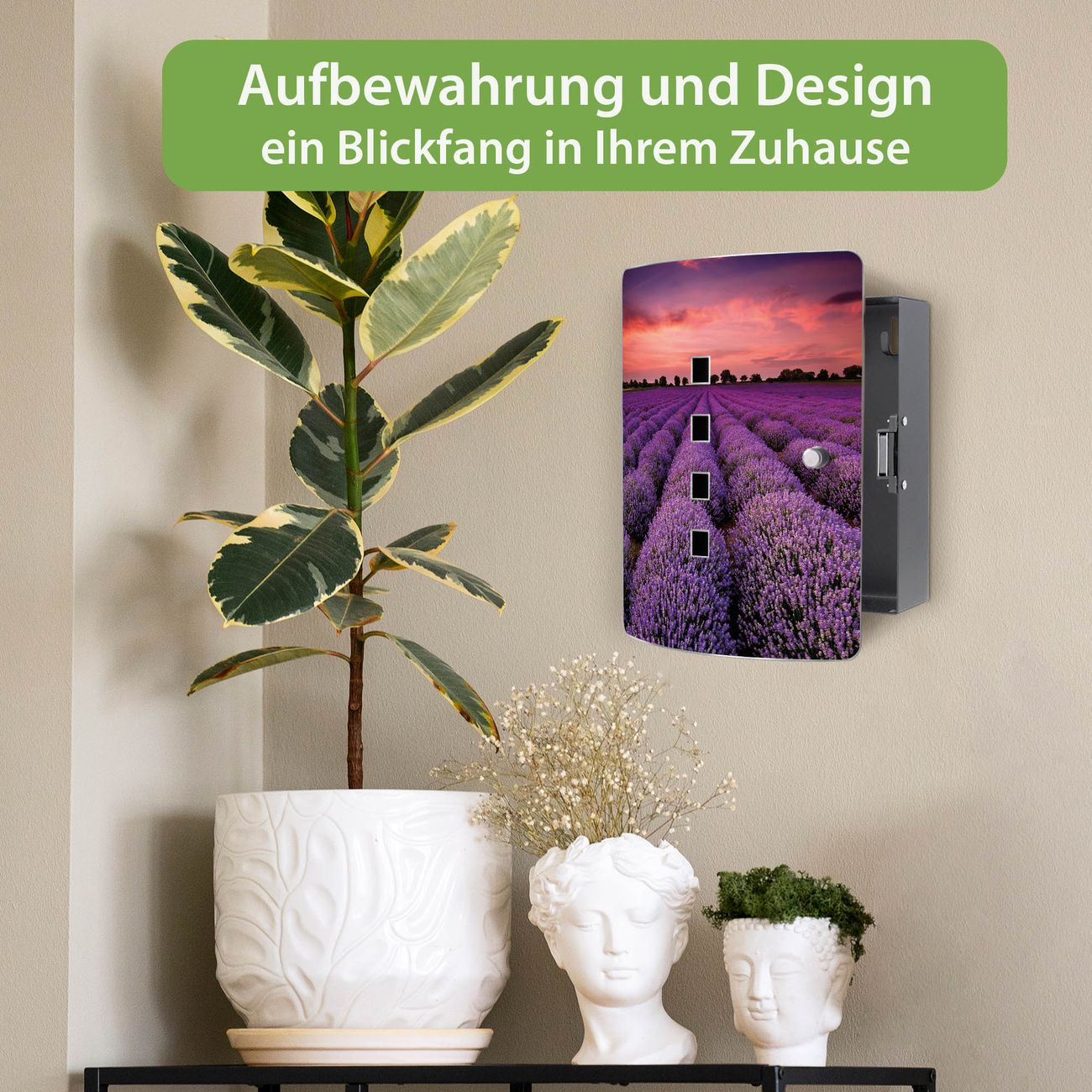 Funktion / Nutzen: Die leicht geschwungene Edelstahltür ist mit einer hochwertigen Motivfolie und dem Motiv Motiv Lavendelfeld kaschiert. Ein praktischer Magnetverschluss ermöglicht Ihnen ein schnelles Öffnen und Schließen. Befestigt wird der Schlüsselkasten an 2 Stellen auf der Rückseite, passendes Montagematerial fügen wir bereits bei.