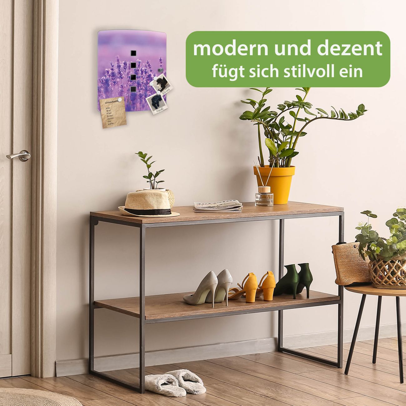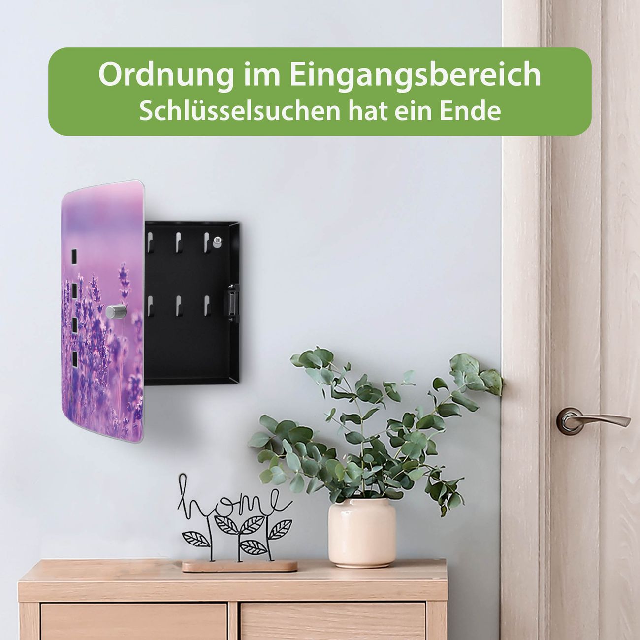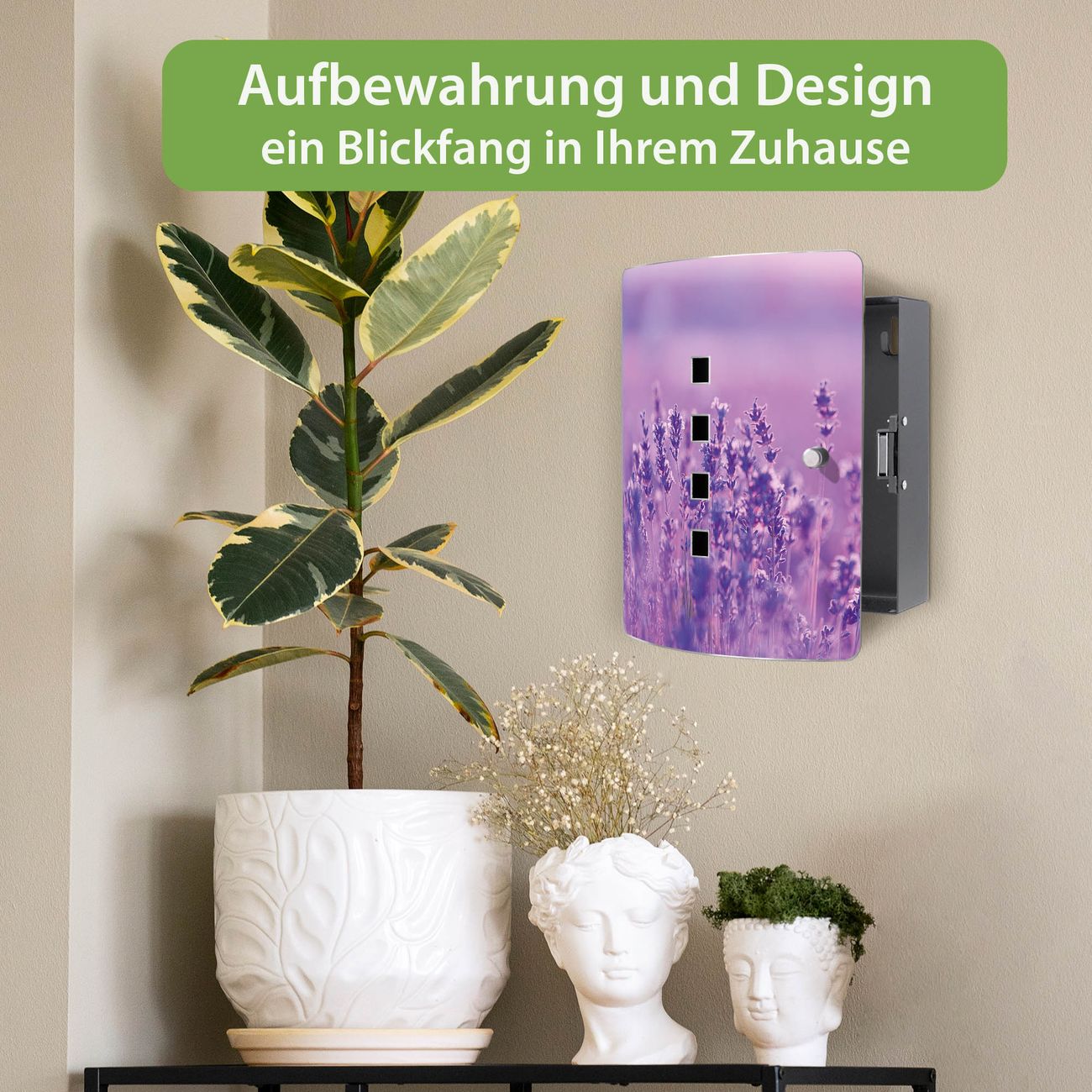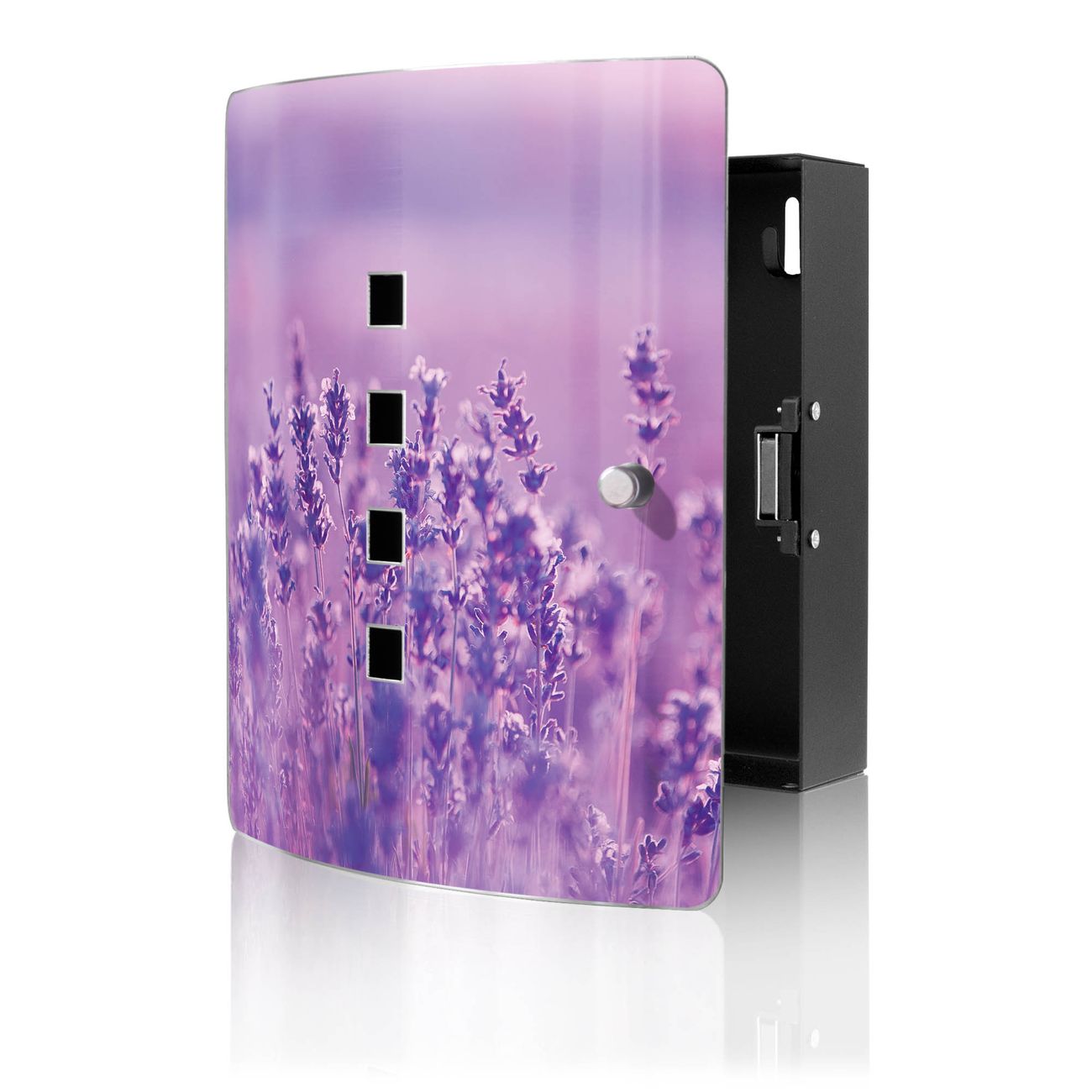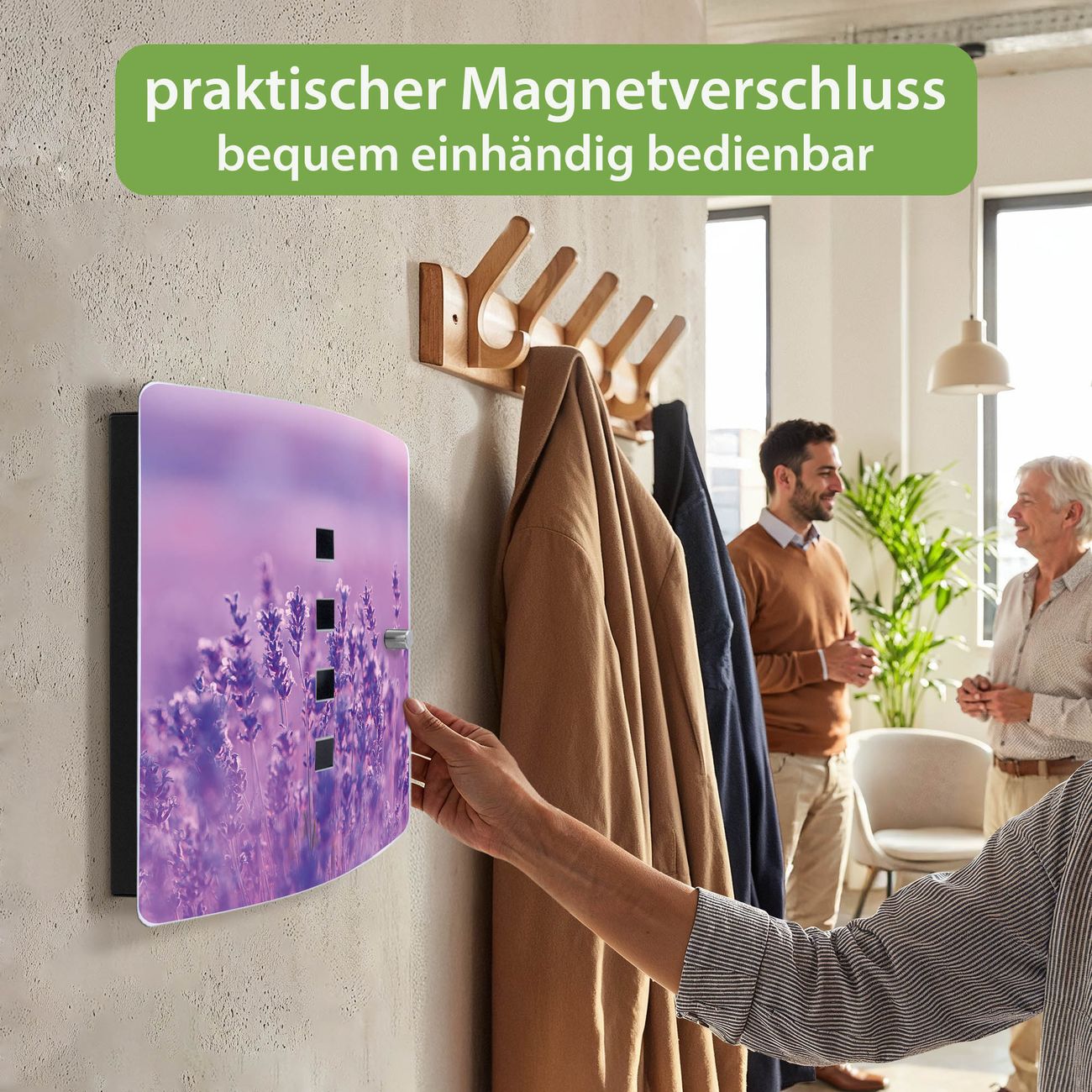 Funktion / Nutzen: Die leicht geschwungene Edelstahltür ist mit einer hochwertigen Motivfolie und dem Motiv Motiv Lavendelmeer kaschiert. Ein praktischer Magnetverschluss ermöglicht Ihnen ein schnelles Öffnen und Schließen. Befestigt wird der Schlüsselkasten an 2 Stellen auf der Rückseite, passendes Montagematerial fügen wir bereits bei.