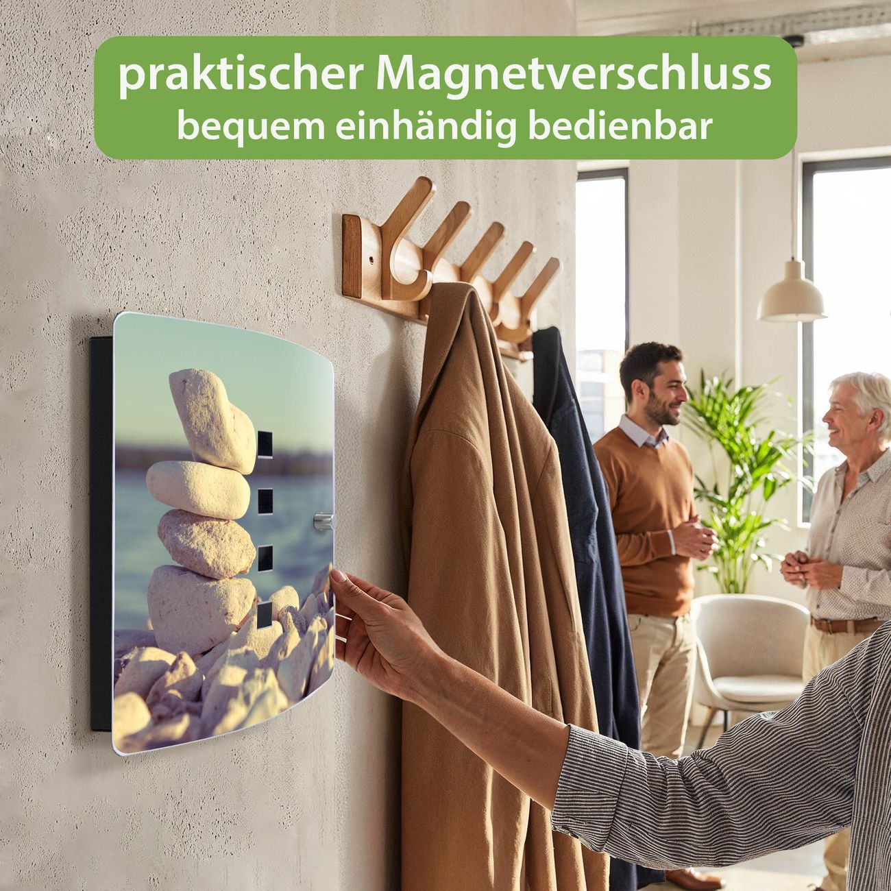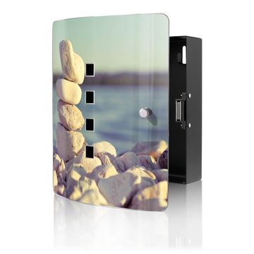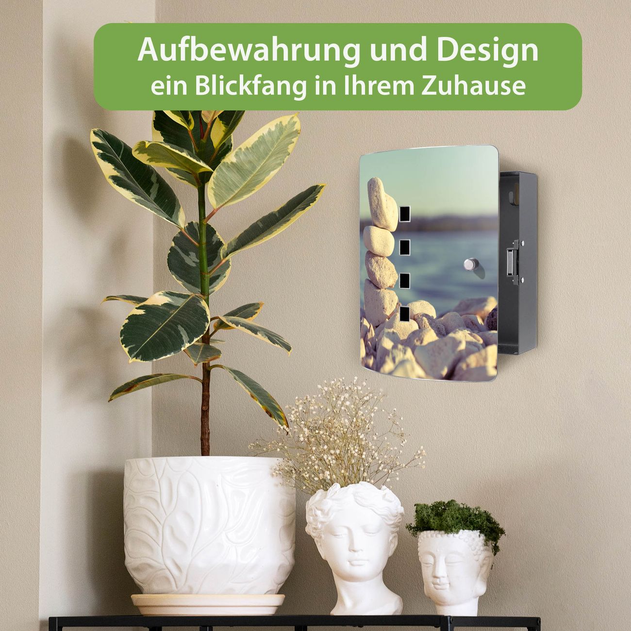 Funktion / Nutzen: Die leicht geschwungene Edelstahltür ist mit einer hochwertigen Motivfolie und dem Motiv Motiv Leichte Steine kaschiert. Ein praktischer Magnetverschluss ermöglicht Ihnen ein schnelles Öffnen und Schließen. Befestigt wird der Schlüsselkasten an 2 Stellen auf der Rückseite, passendes Montagematerial fügen wir bereits bei.
