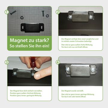 Der Schlüsselkasten ist gesamt 24x21x5cm groß und wiegt ca. 900g. Die Fronttür hat eine 90° Öffnung und besteht aus Edelstahl. Das Gehäuse ist zeitlos schwarz und aus Stahl gefertigt.
