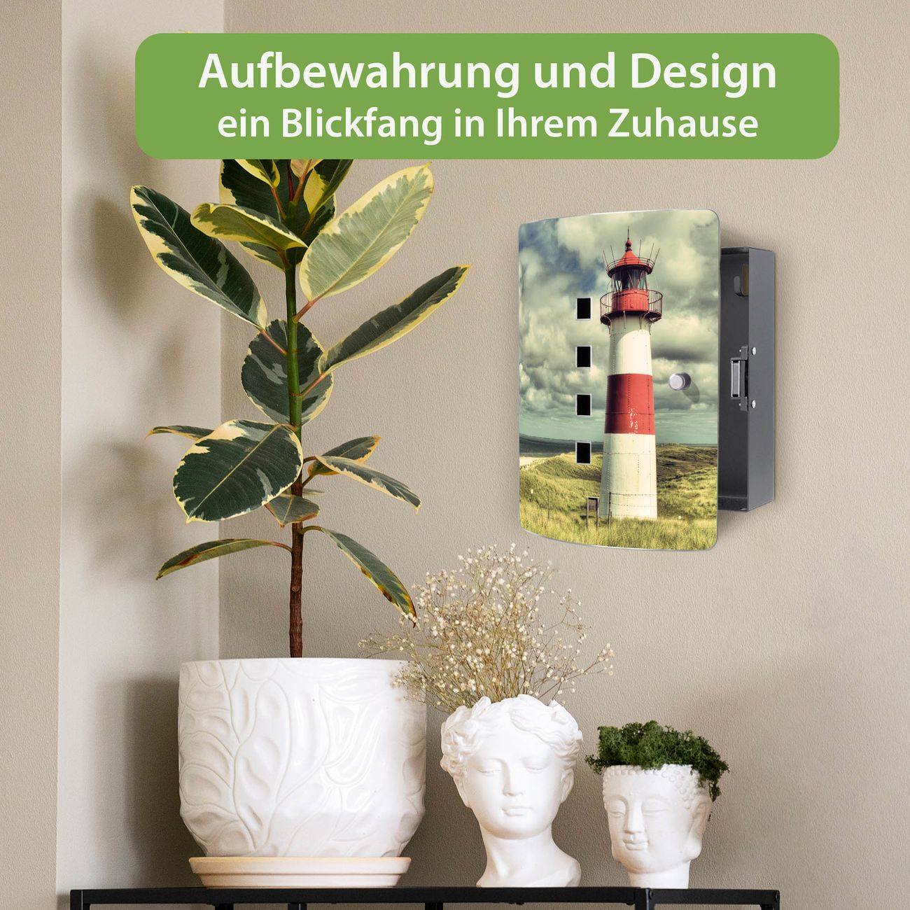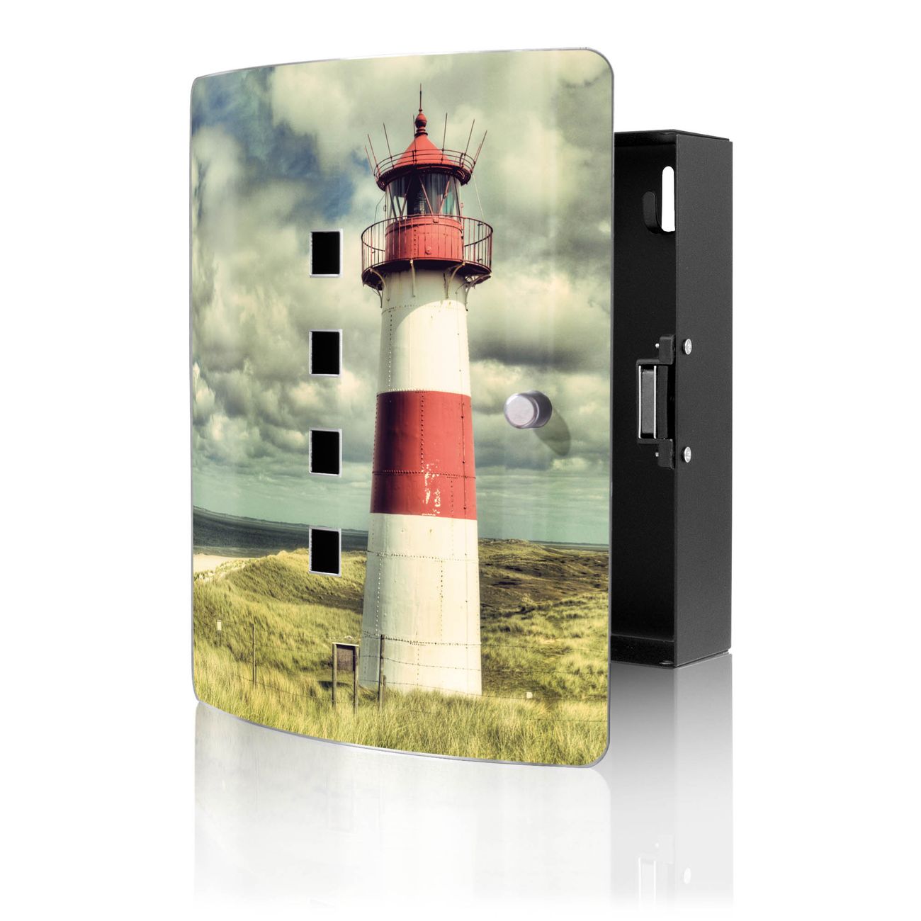 Funktion / Nutzen: Die leicht geschwungene Edelstahltür ist mit einer hochwertigen Motivfolie und dem Motiv Motiv Leuchtturm Sylt kaschiert. Ein praktischer Magnetverschluss ermöglicht Ihnen ein schnelles Öffnen und Schließen. Befestigt wird der Schlüsselkasten an 2 Stellen auf der Rückseite, passendes Montagematerial fügen wir bereits bei.