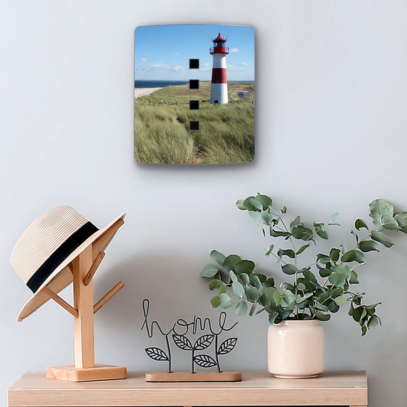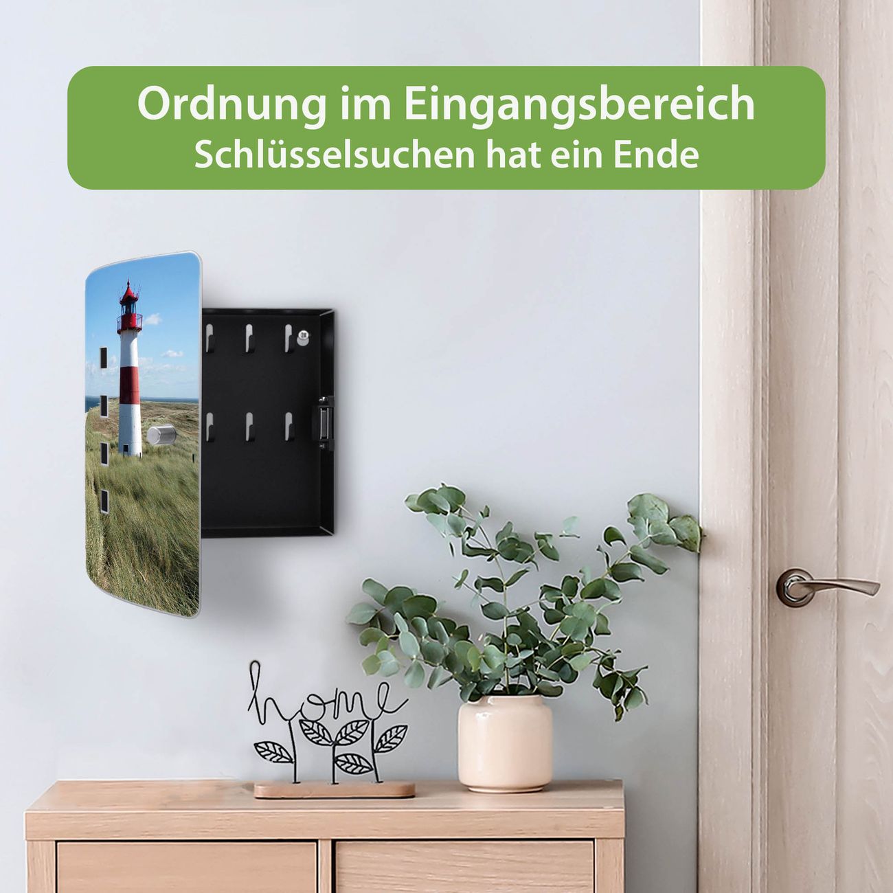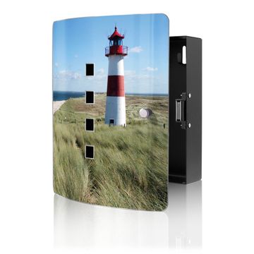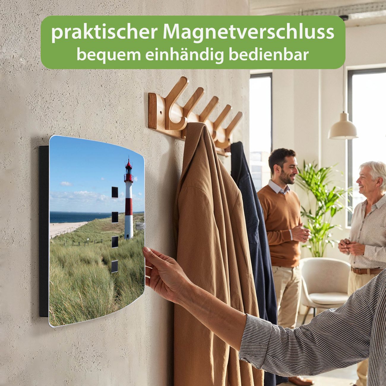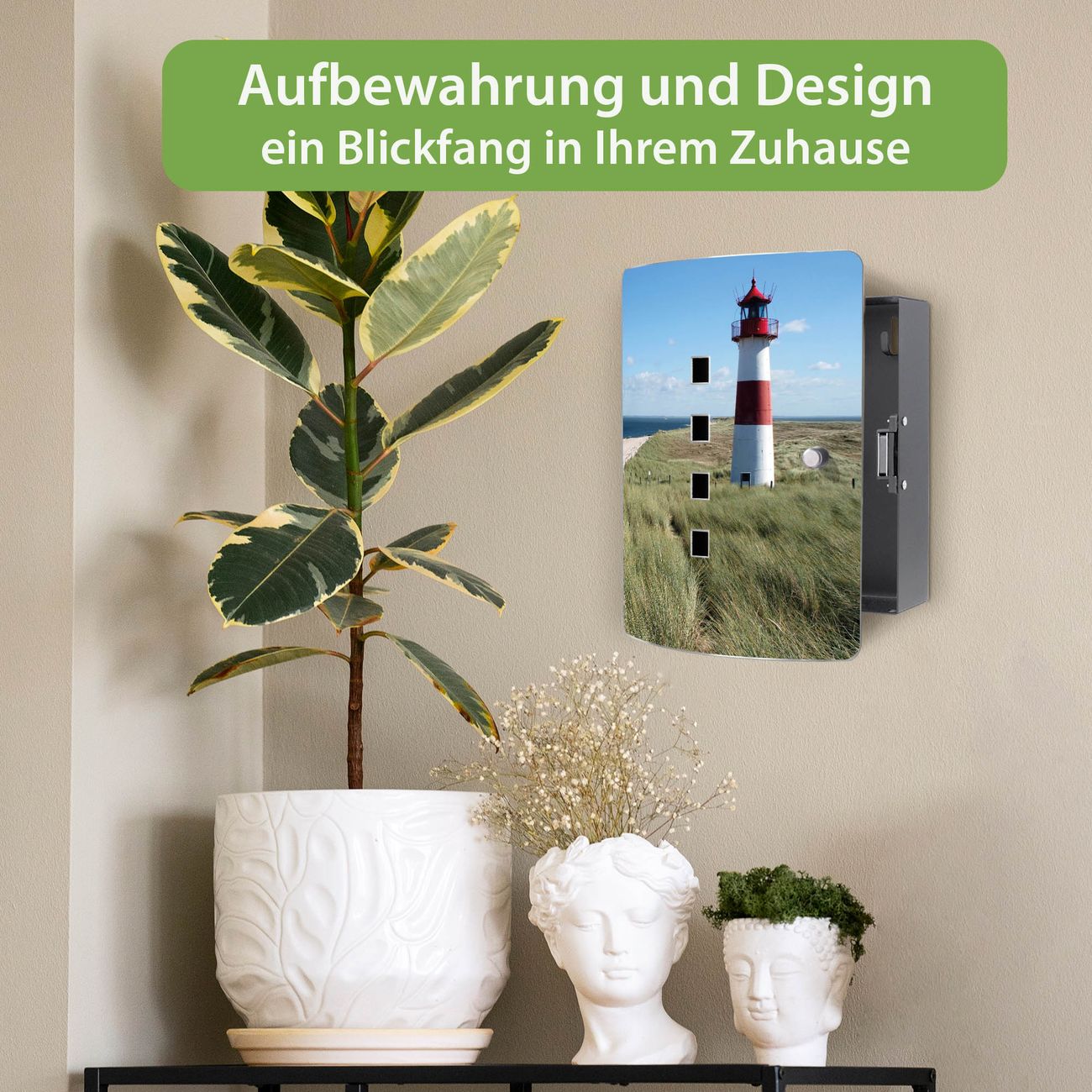 Funktion / Nutzen: Die leicht geschwungene Edelstahltür ist mit einer hochwertigen Motivfolie und dem Motiv Motiv Leuchtturm kaschiert. Ein praktischer Magnetverschluss ermöglicht Ihnen ein schnelles Öffnen und Schließen. Befestigt wird der Schlüsselkasten an 2 Stellen auf der Rückseite, passendes Montagematerial fügen wir bereits bei.