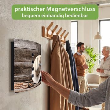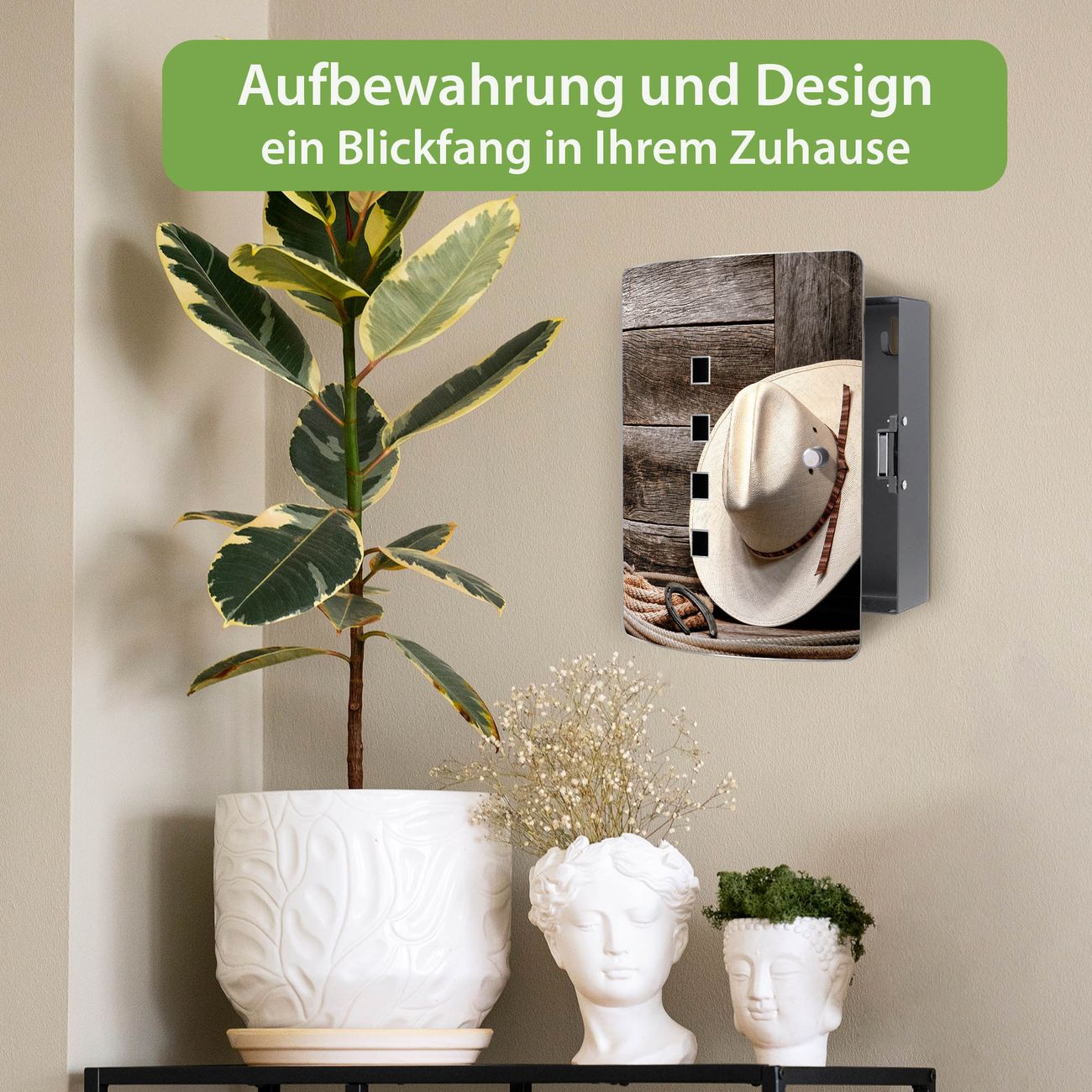 Funktion / Nutzen: Die leicht geschwungene Edelstahltür ist mit einer hochwertigen Motivfolie und dem Motiv Motiv Linedance Set kaschiert. Ein praktischer Magnetverschluss ermöglicht Ihnen ein schnelles Öffnen und Schließen. Befestigt wird der Schlüsselkasten an 2 Stellen auf der Rückseite, passendes Montagematerial fügen wir bereits bei.